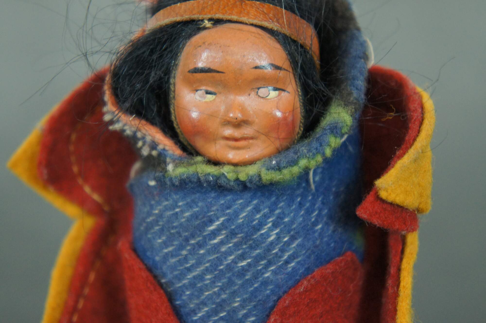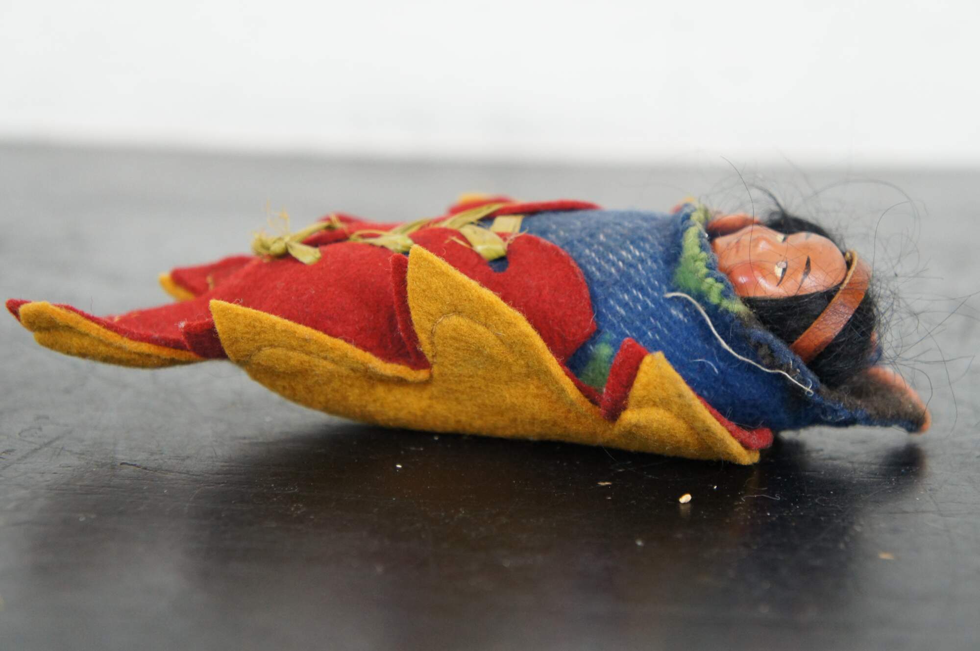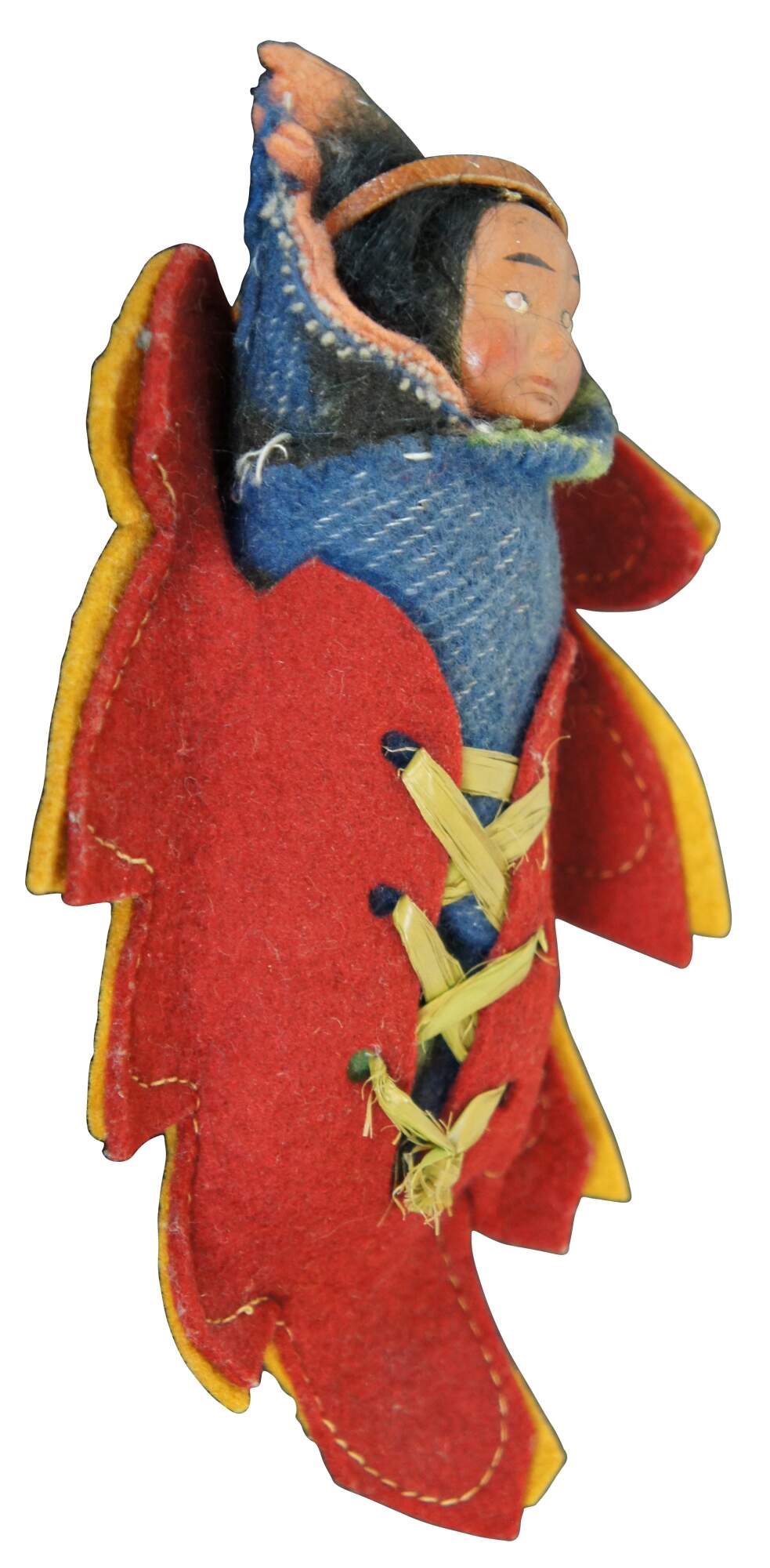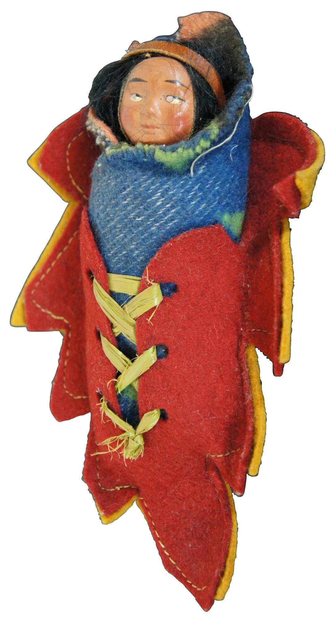 Vintage Skookum papoose / Native American baby doll, circa mid 20th century, with painted face, wool blanket and laced into a leaf shaped felt cradle board.