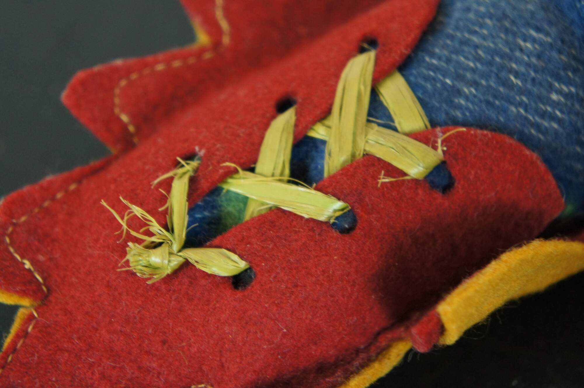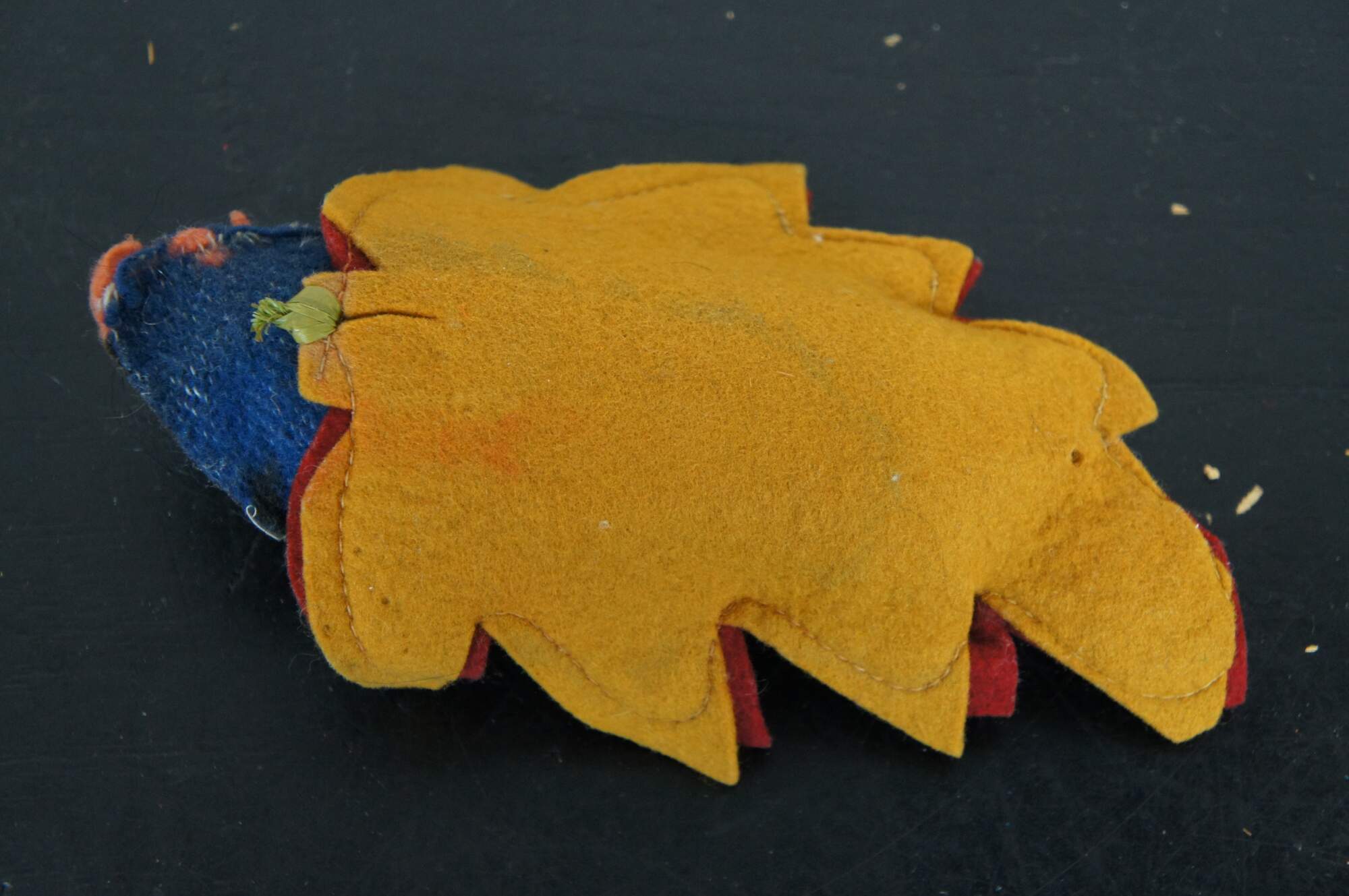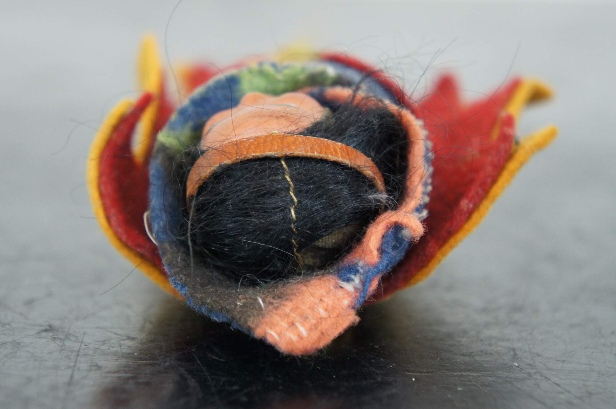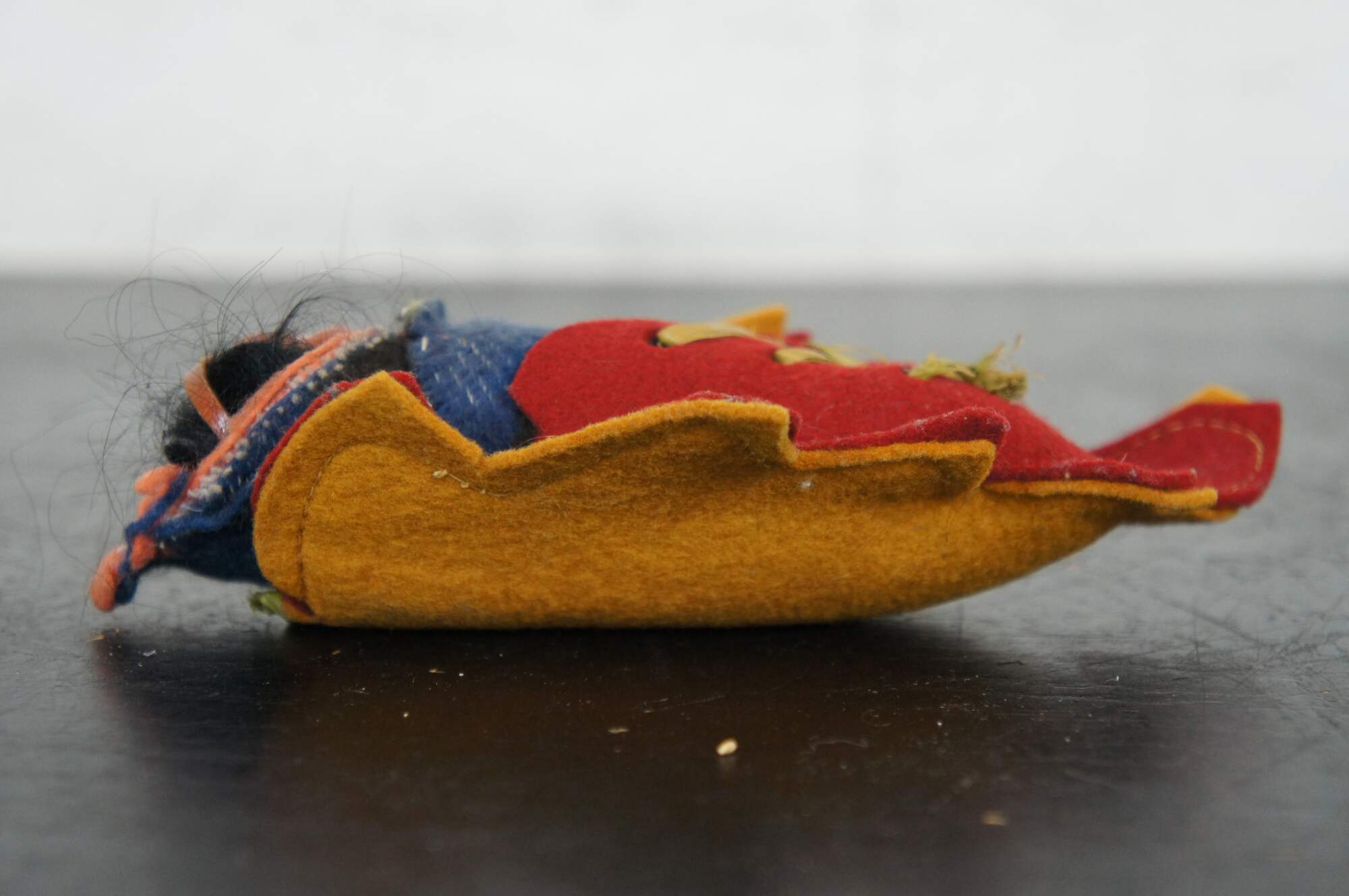 Vintage Skookum papoose / Native American baby doll, circa mid 20th century, with painted face, wool blanket and laced into a leaf shaped felt cradle board.