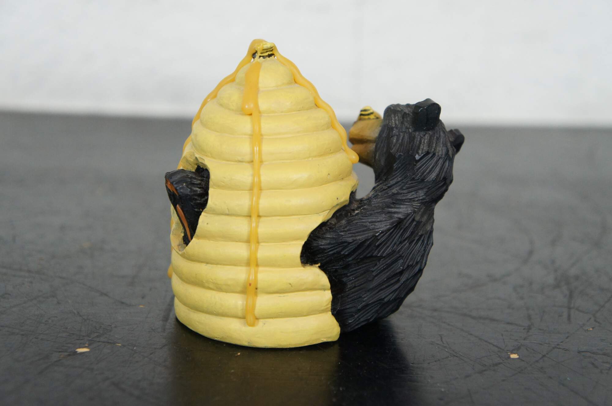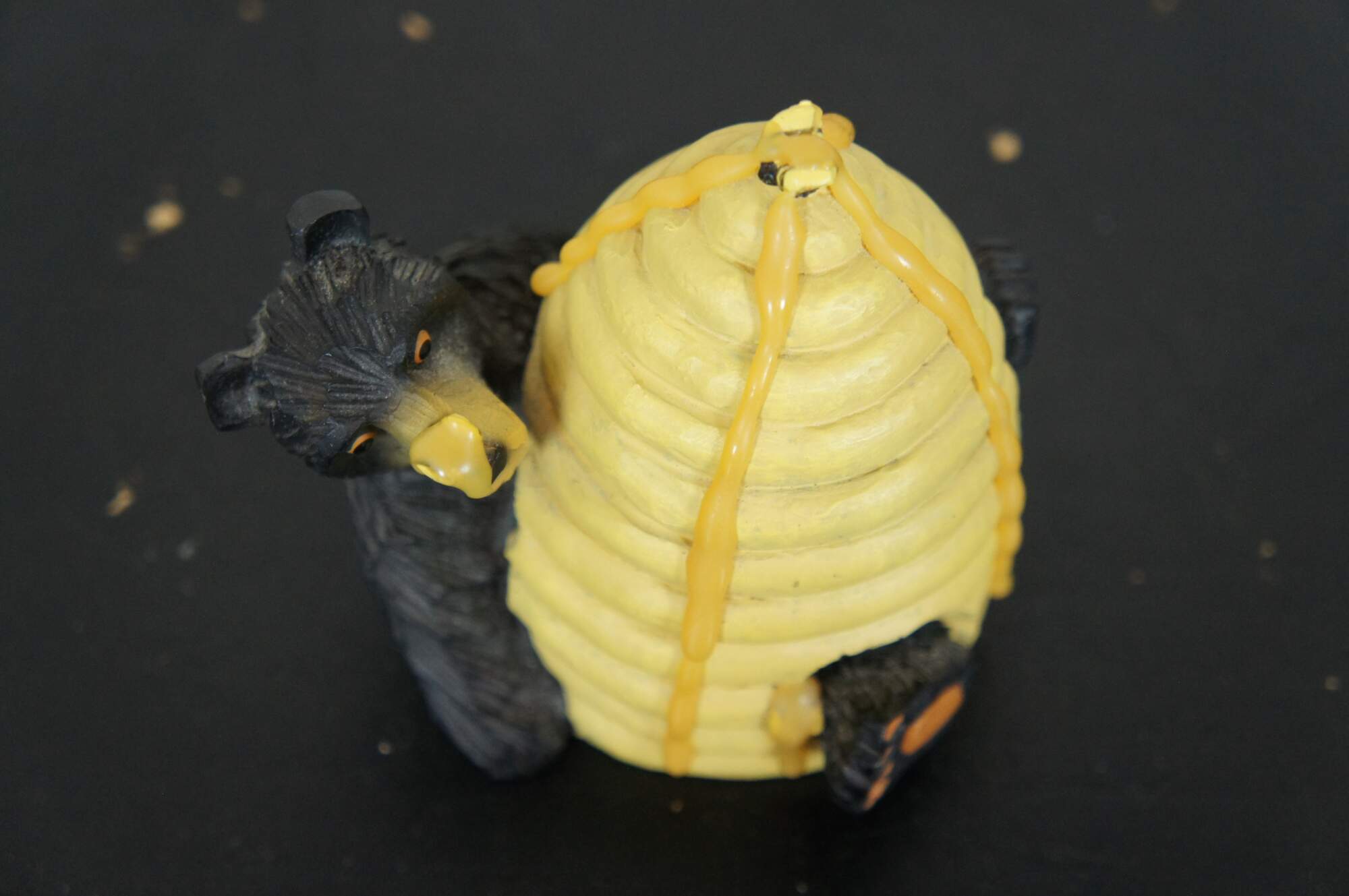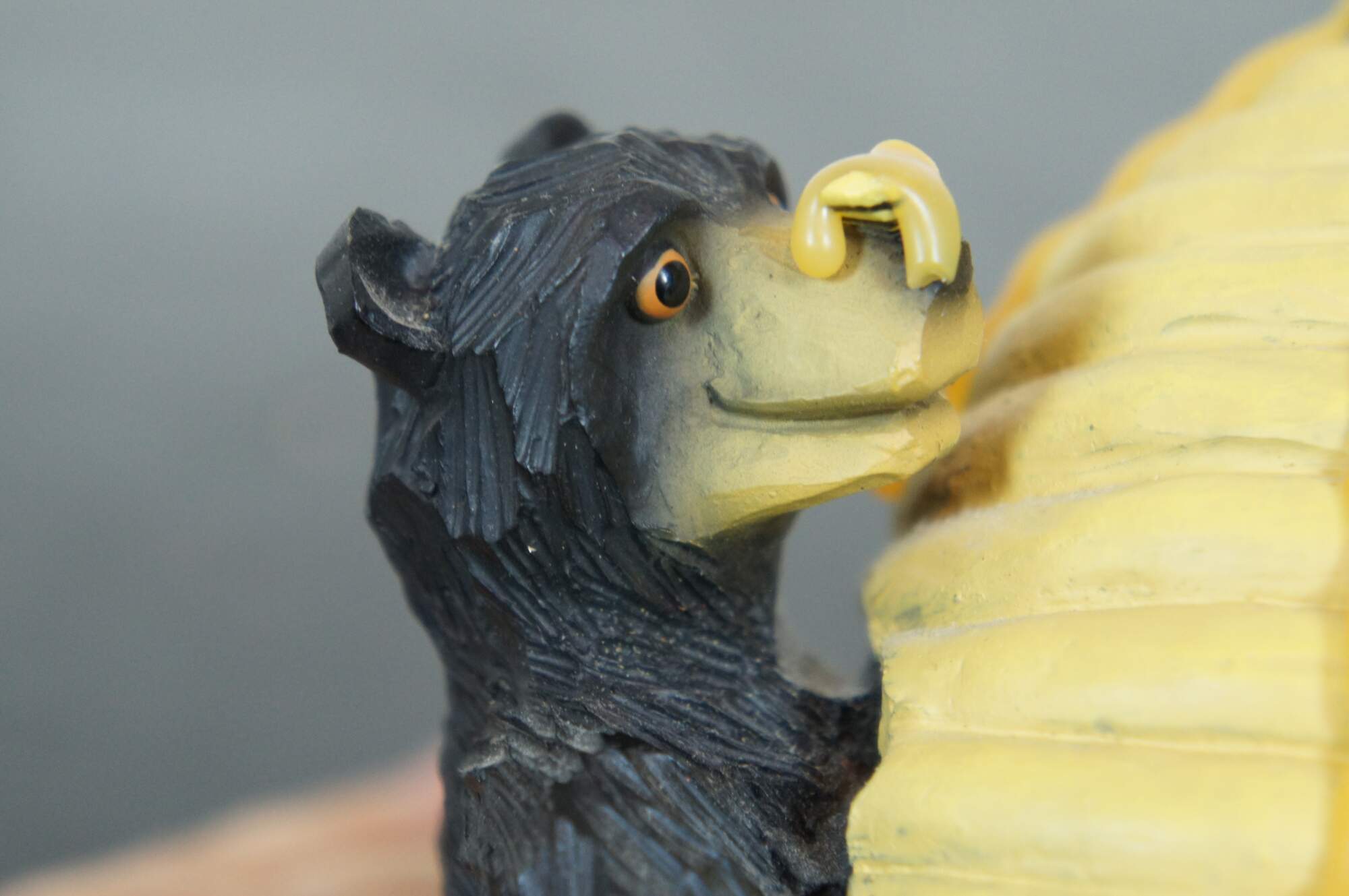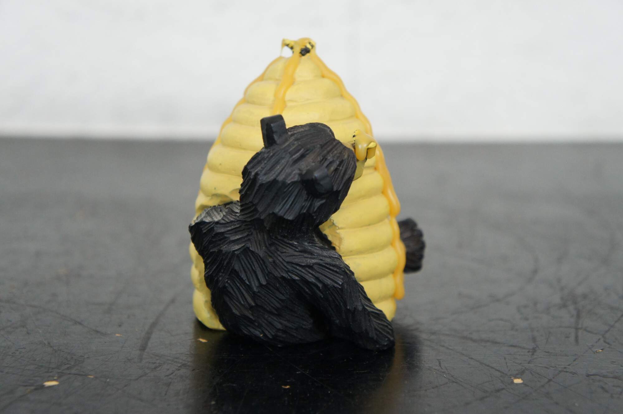 Whimsical vintage resin figurine in the shape of a black bear stuck seated in a bee hive dripping honey.