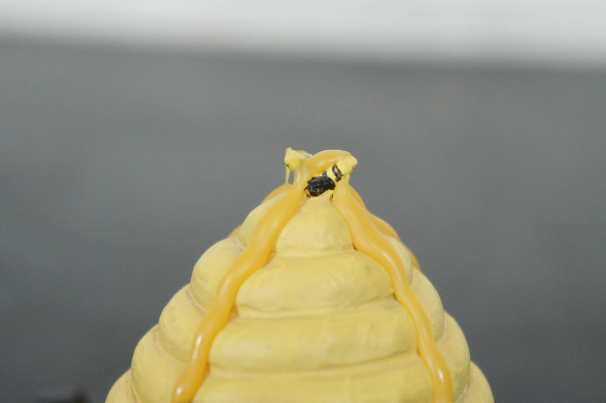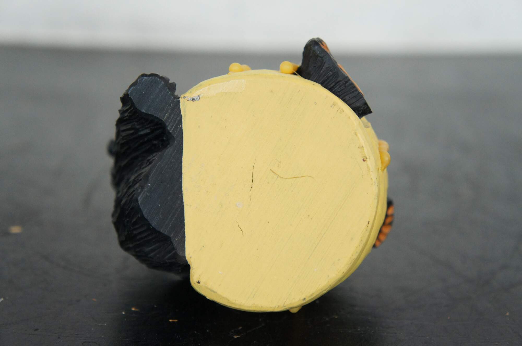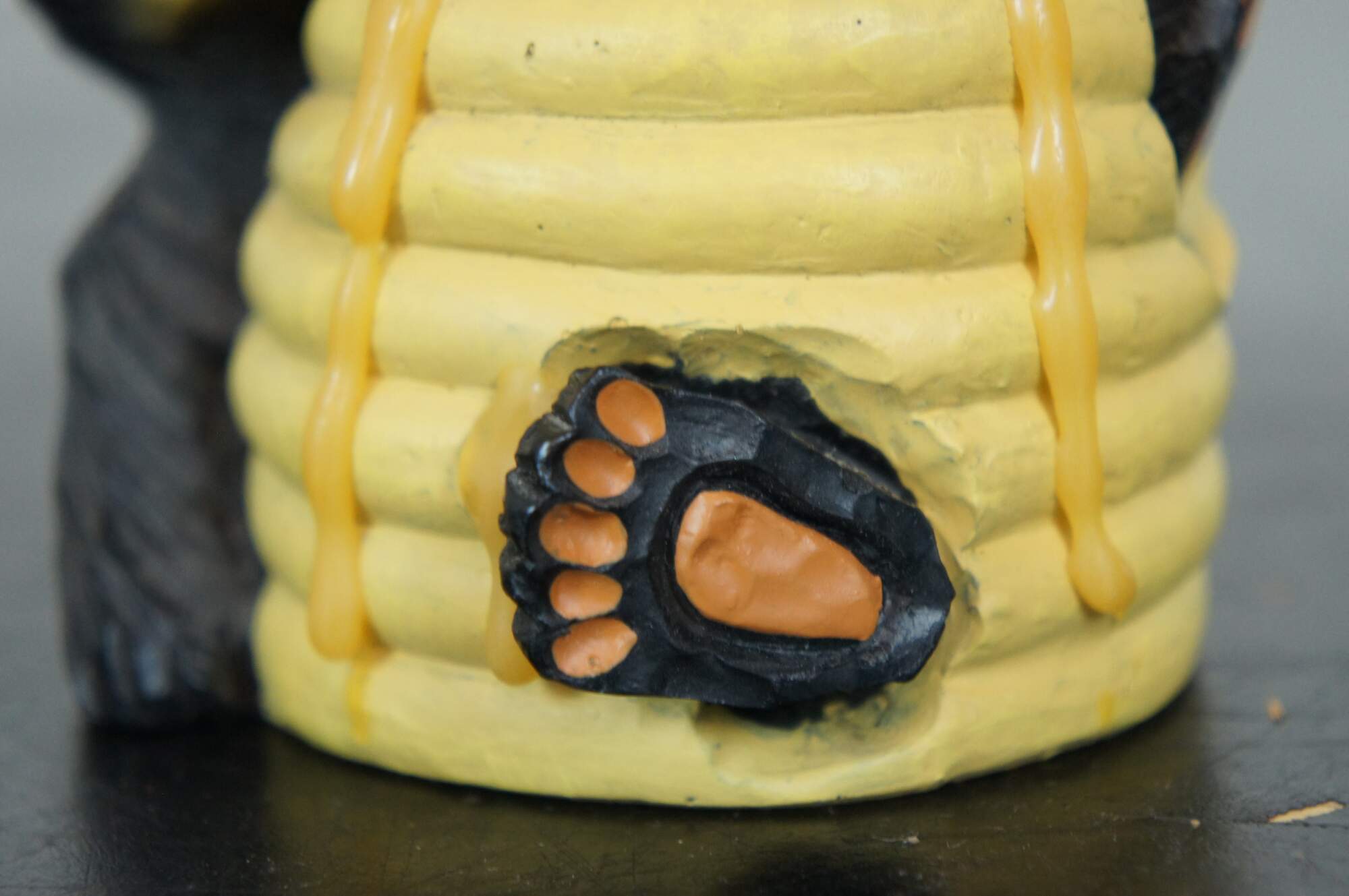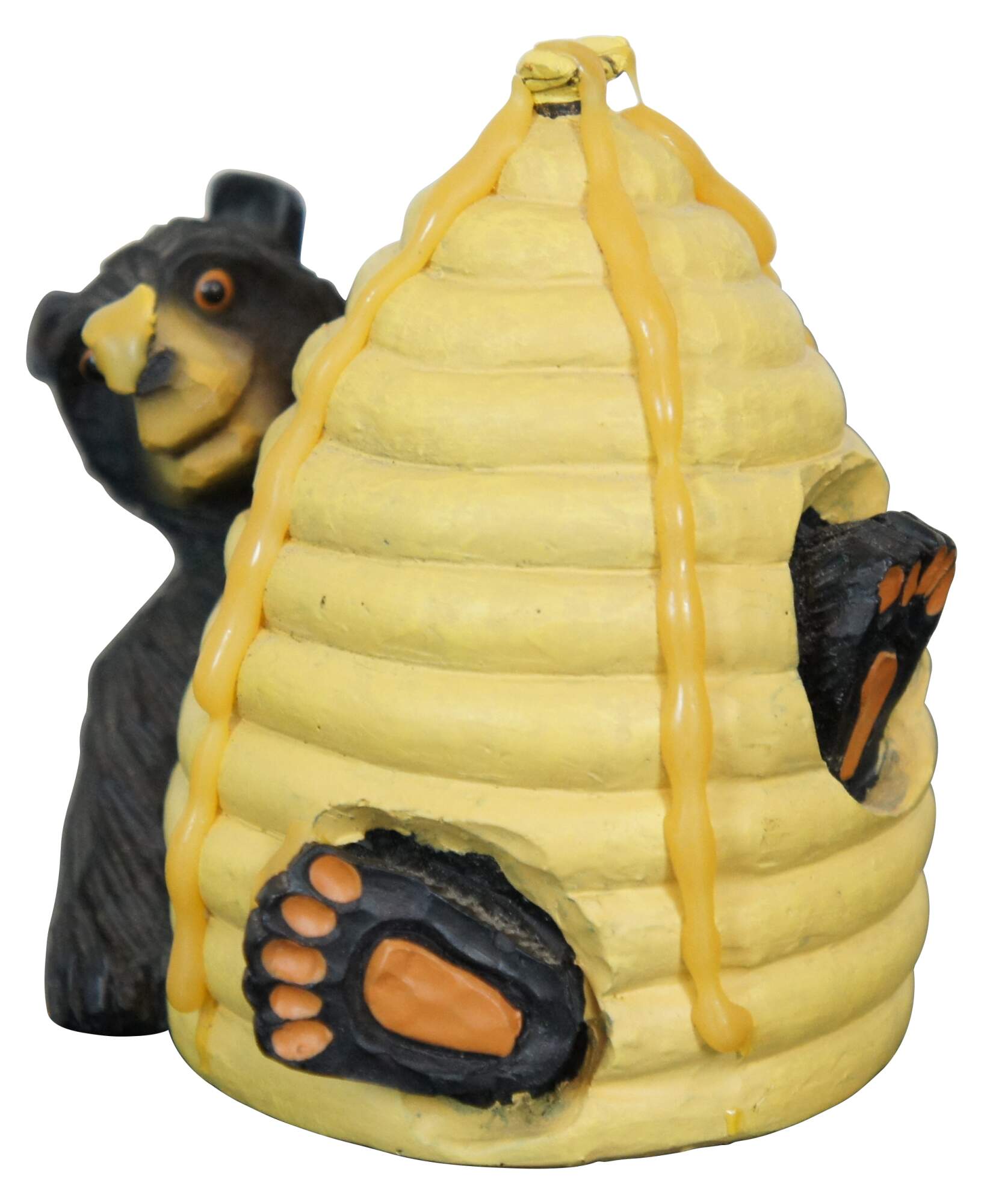 Whimsical vintage resin figurine in the shape of a black bear stuck seated in a bee hive dripping honey.