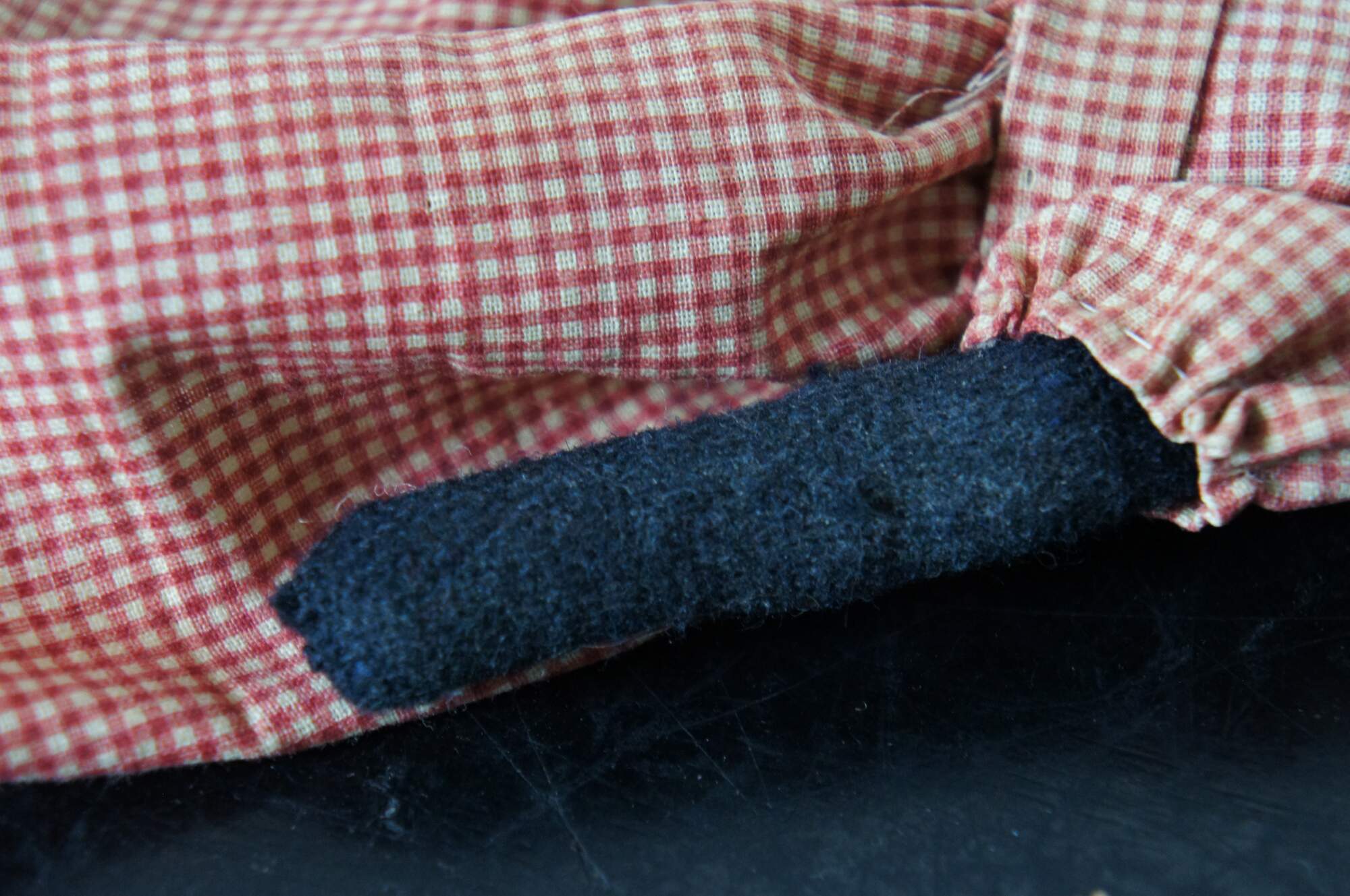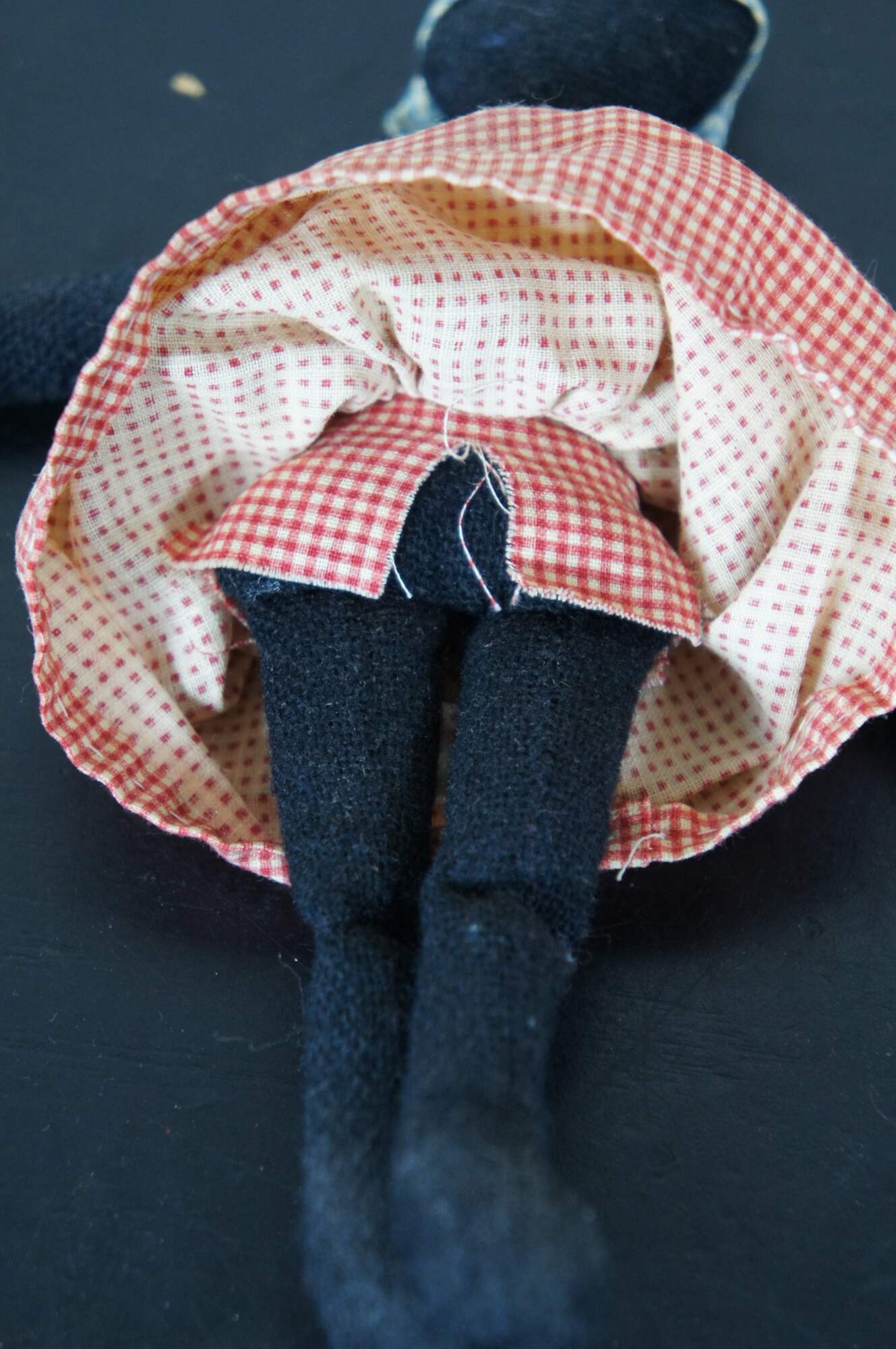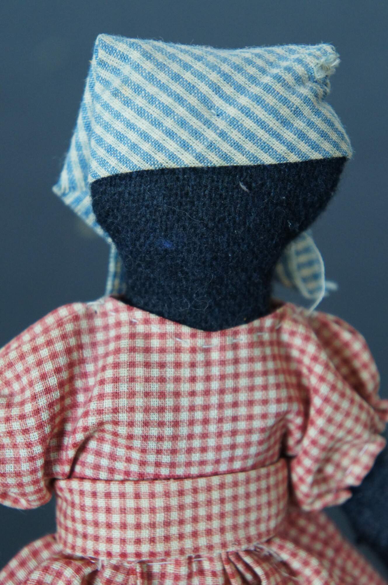 Antique folk art cloth doll of a woman dressed in a red gingham dress and blue gingham kerchief.
