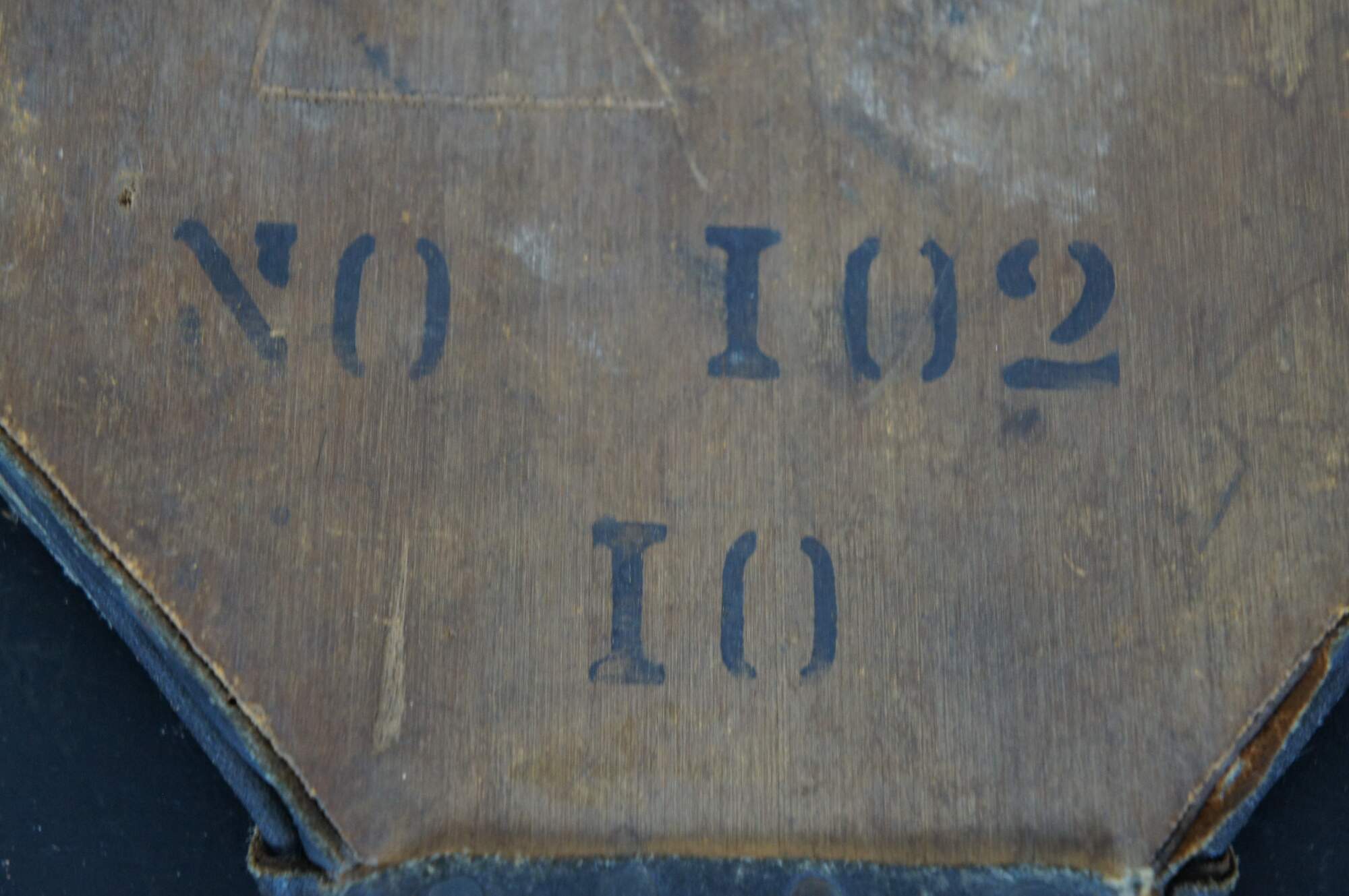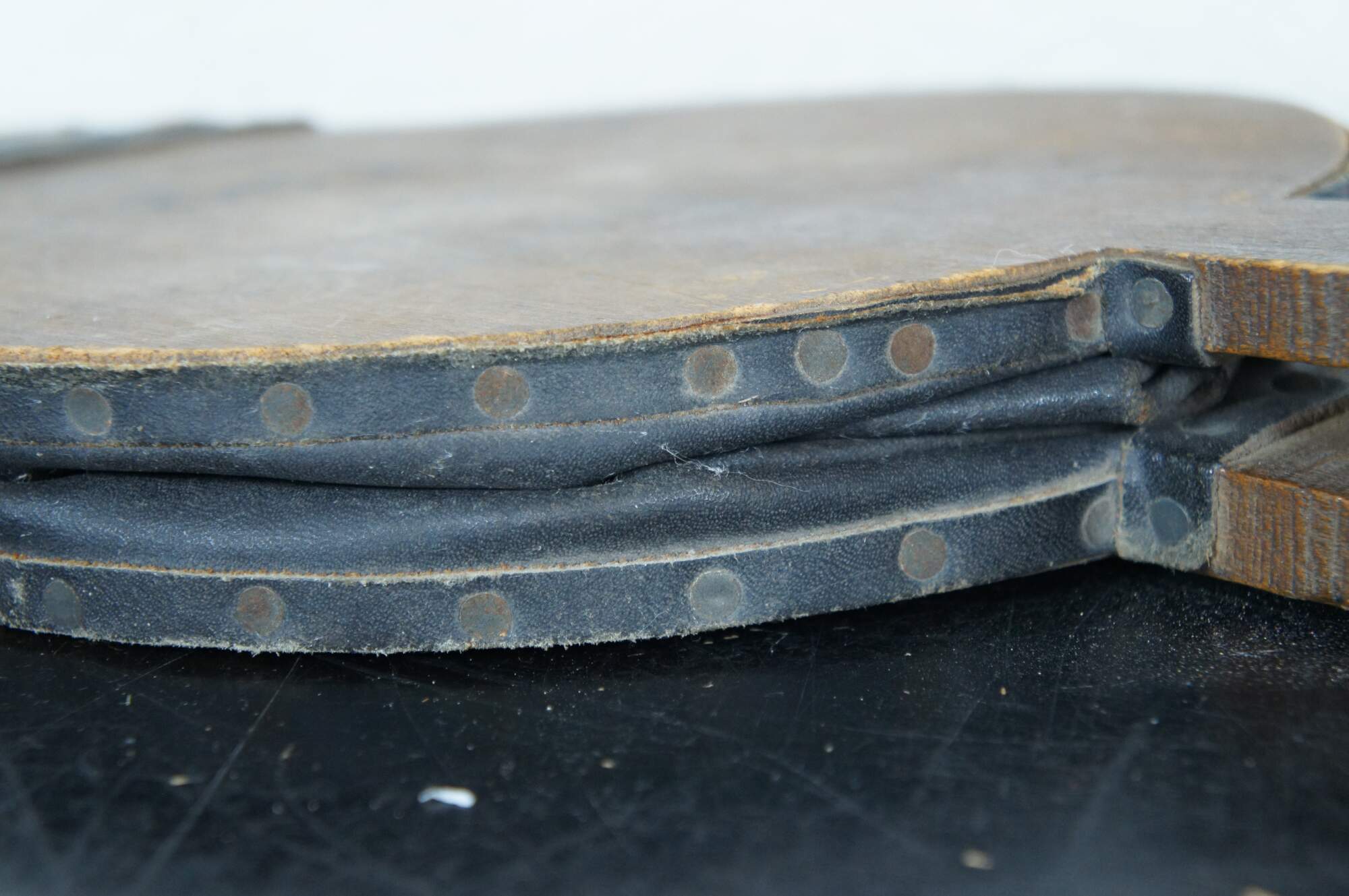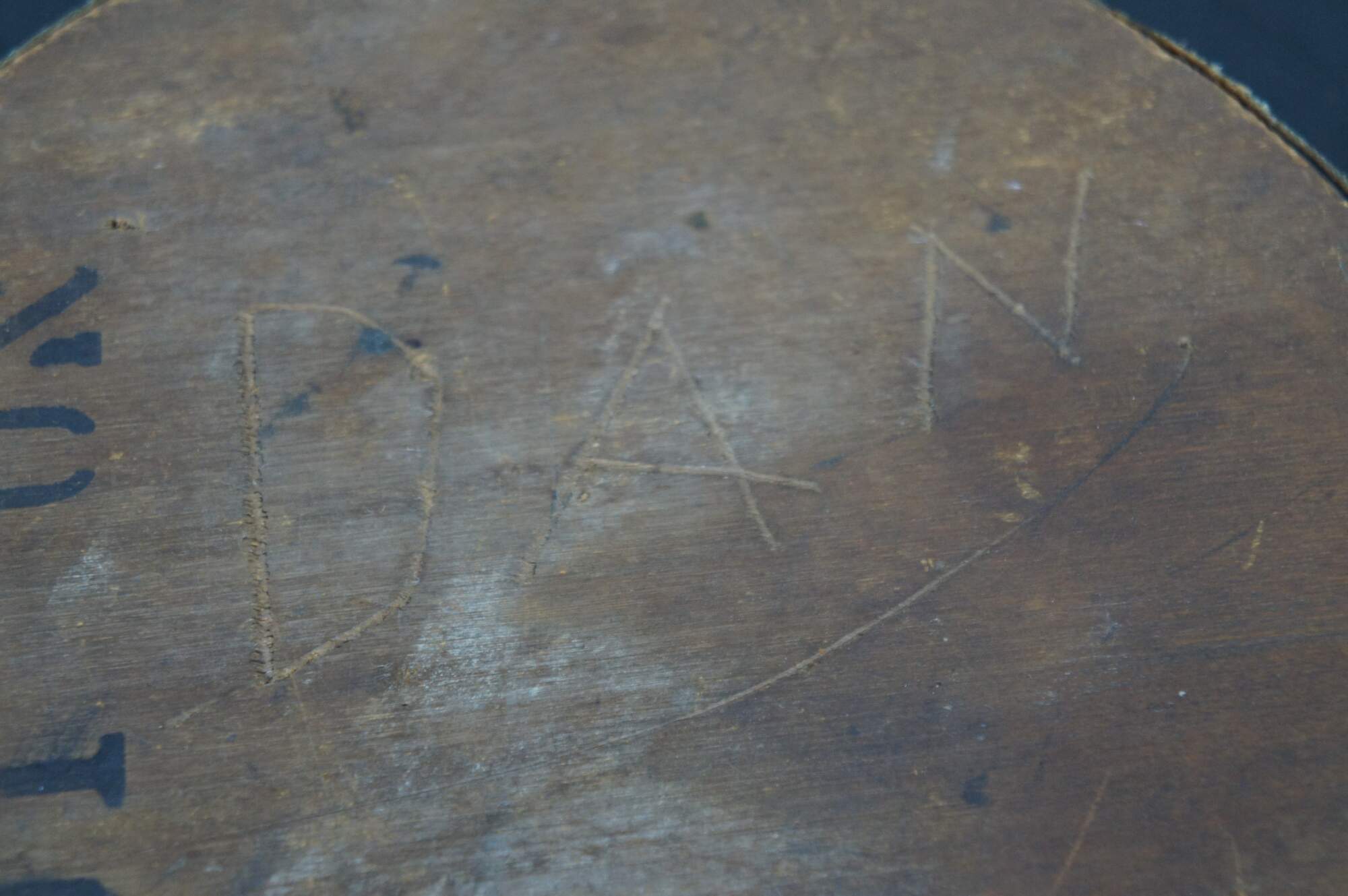 Good Overall – Scratched with the name Dan, gentle wear to wood finish, some wear to leather, tarnish/small dent to metal