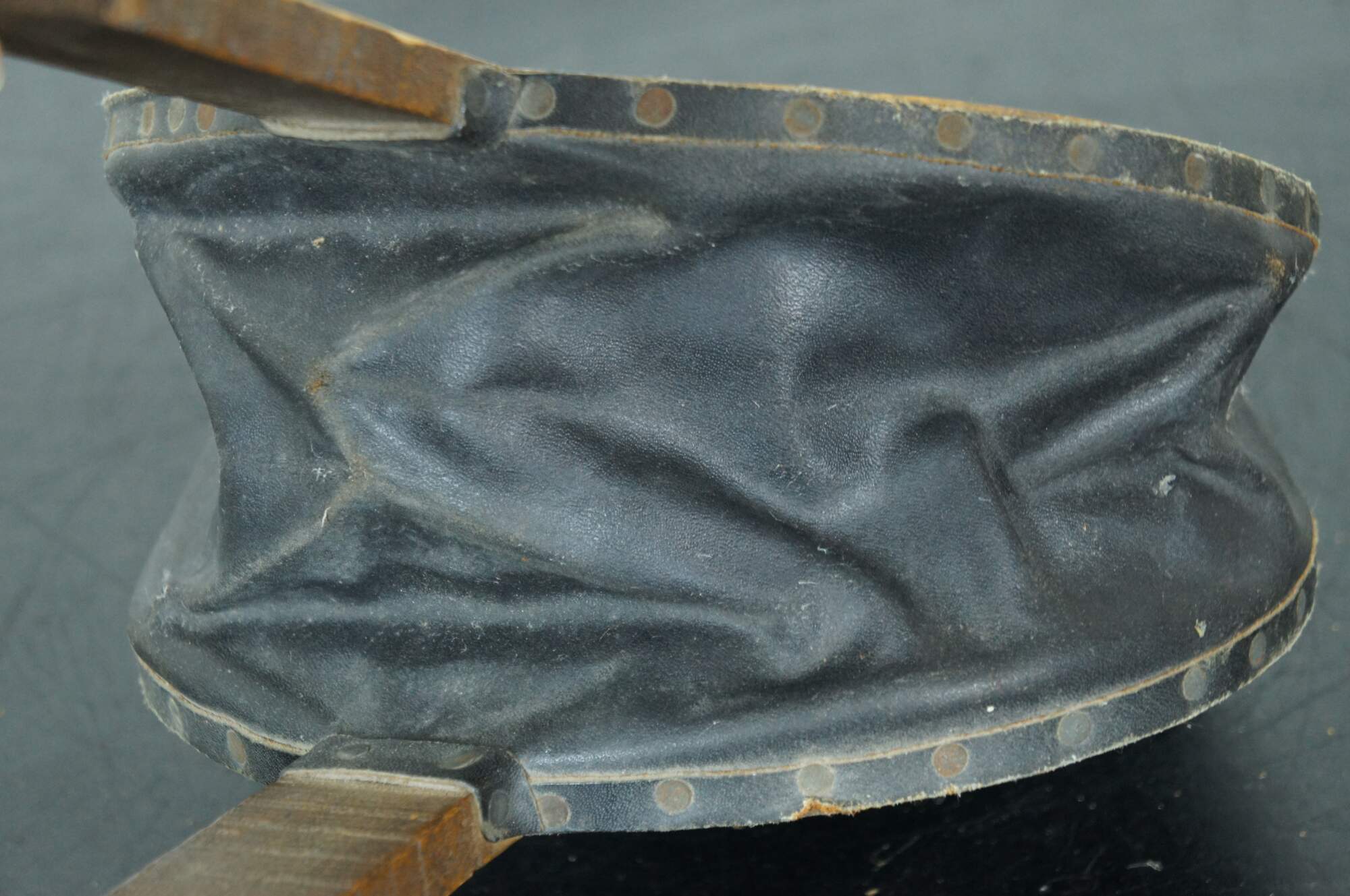 Antique wood and leather fireplace bellows, stamped “No. 102 – 10” and crudely etched by some previous owner with the name Dan.
