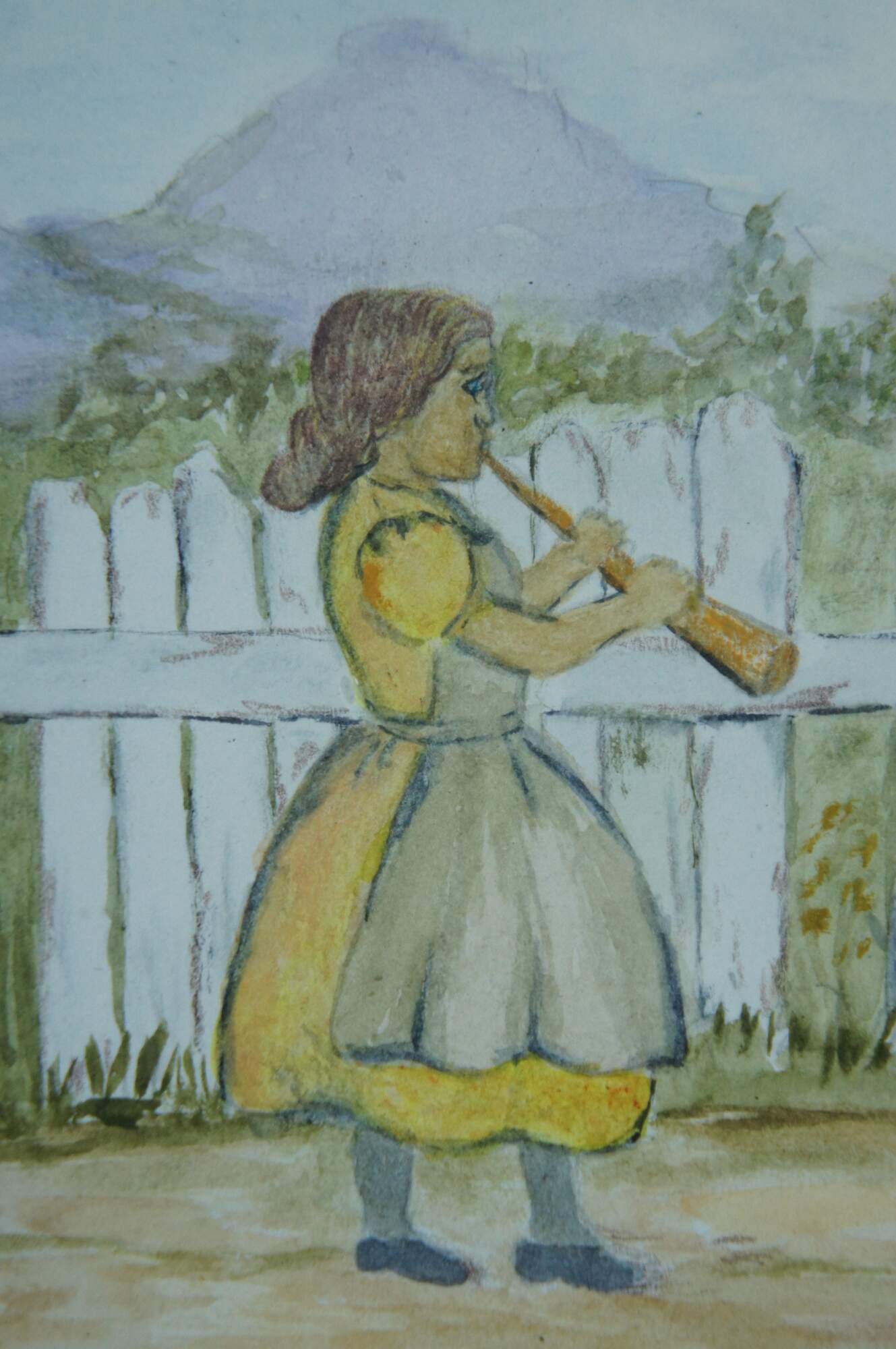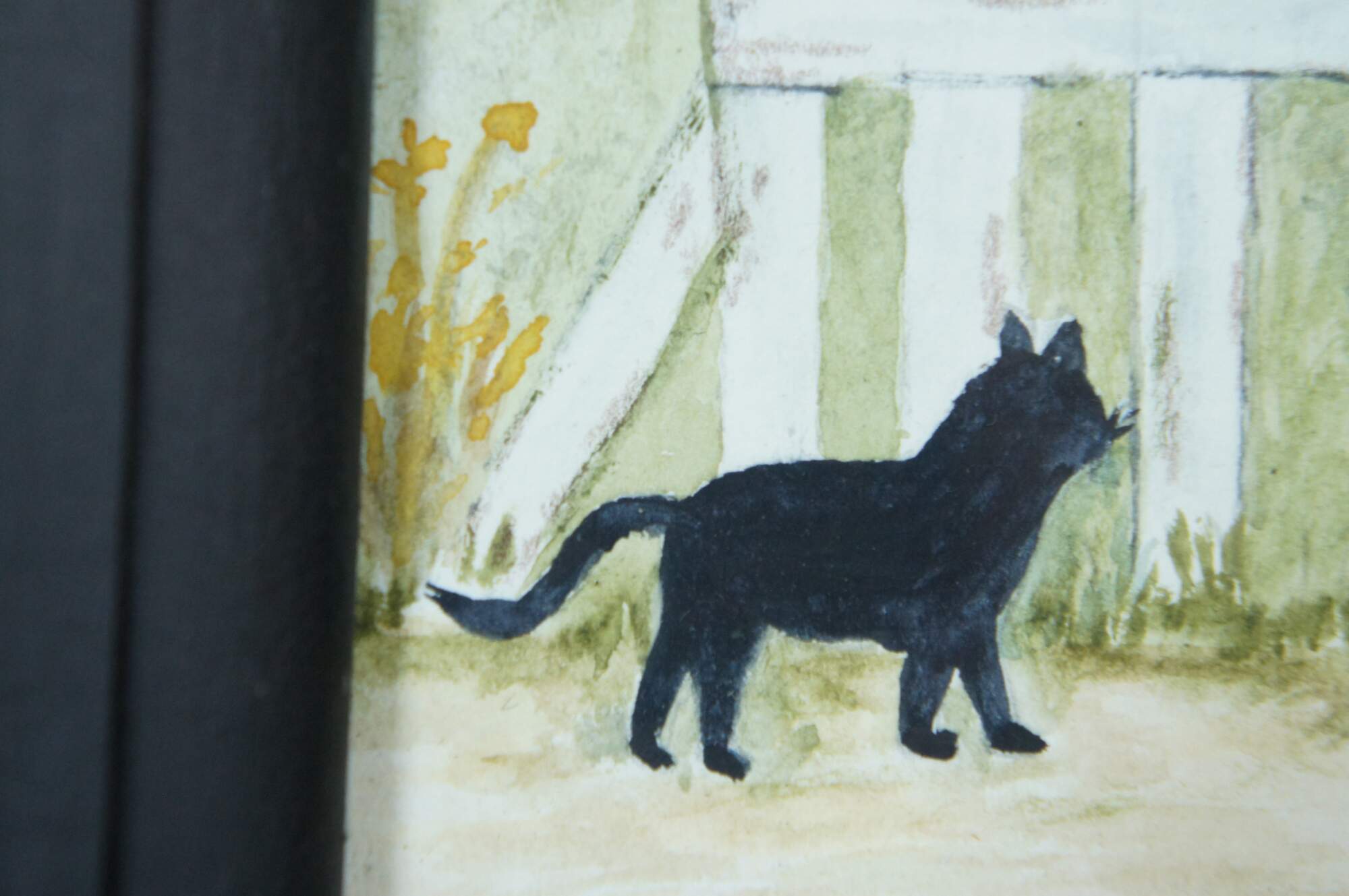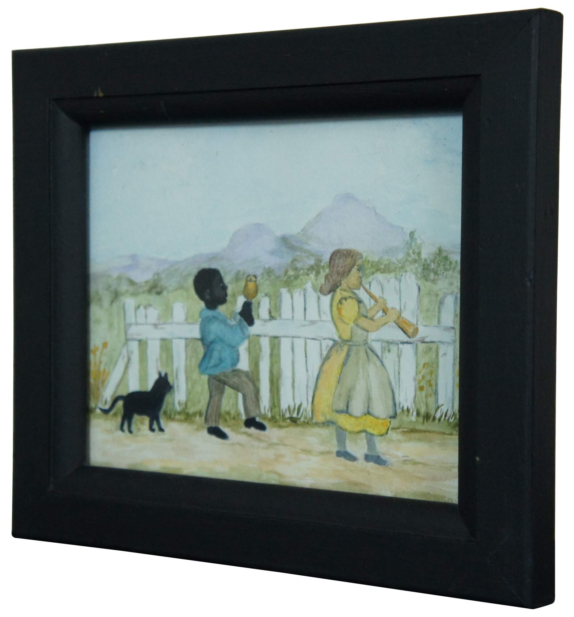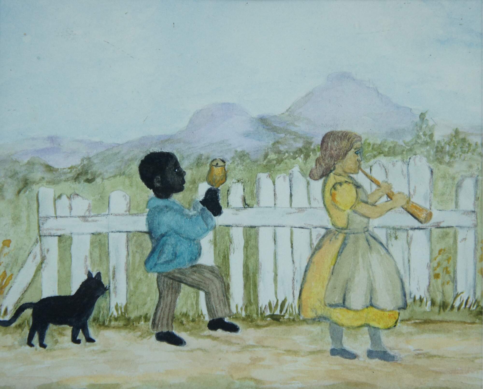 Antique folk art style watercolor painting of a pair of children with instruments and a cat walking down a road lined with a white fence.