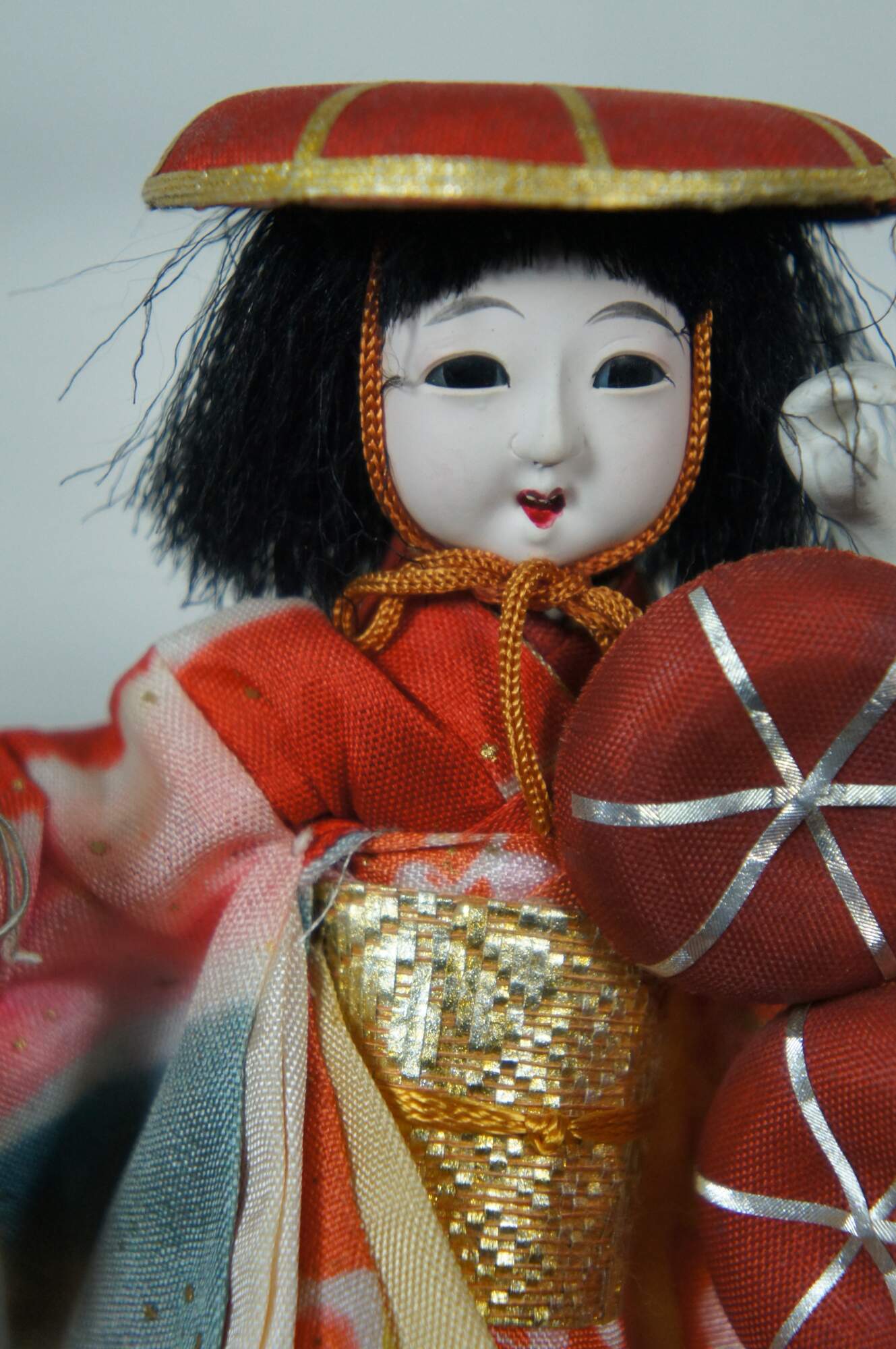 Vintage ningyô or Japanese doll with short cropped hair, dressed in red and gold Kimono, carrying strings of hats. Doll is set and displayed in a wood and glass display case. “Japanese dolls (人形, ningyō, lit. ""human form"") are one of the traditional Japanese crafts.