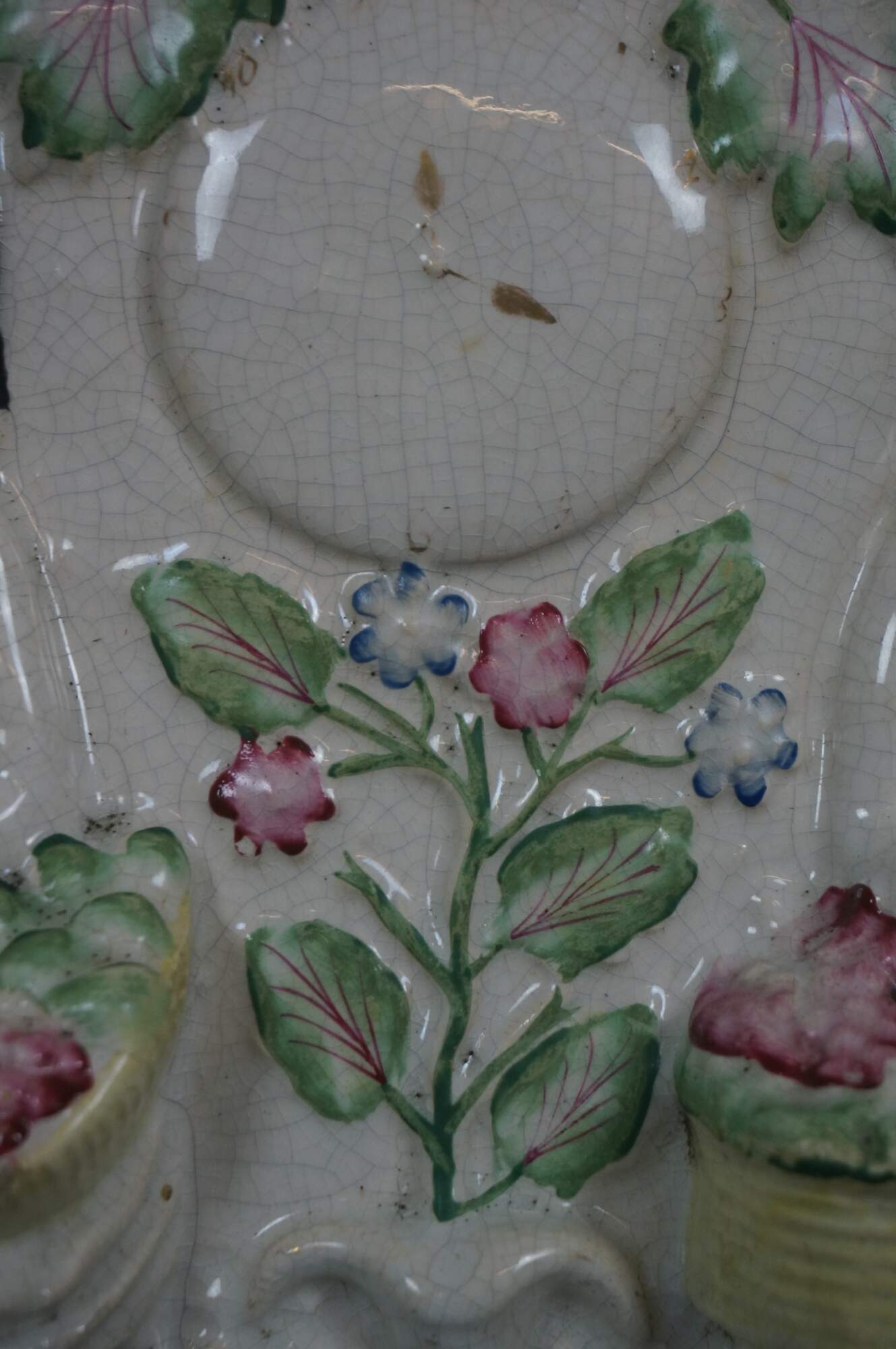 Antique 19th century English Staffordshire porcelain flatback figurine in the shape of a pair of male and female figures in Scottish dress, carrying baskets of grapes, standing on either side of a vase of flowers and painted clock face. Circa 1850s.