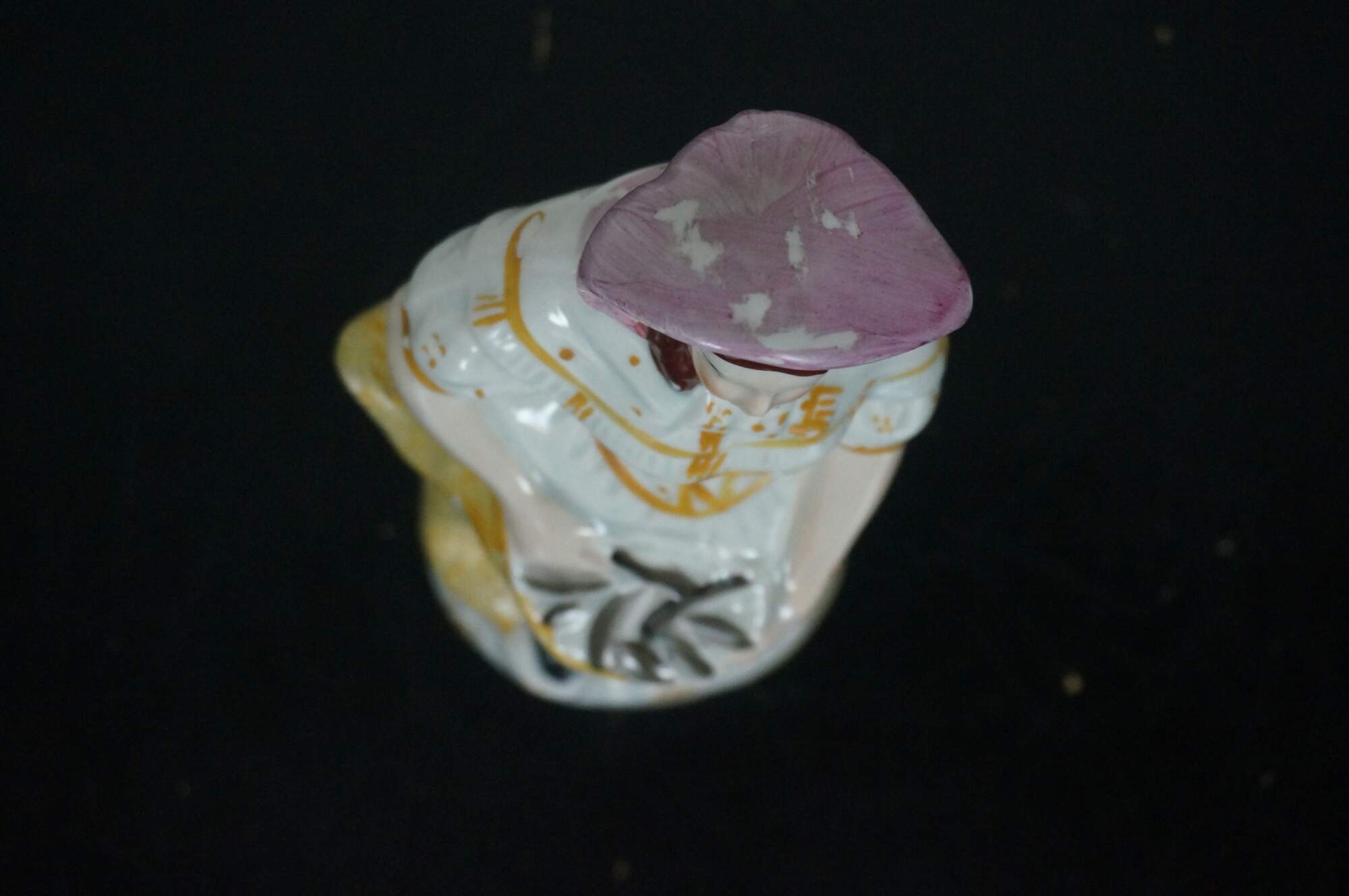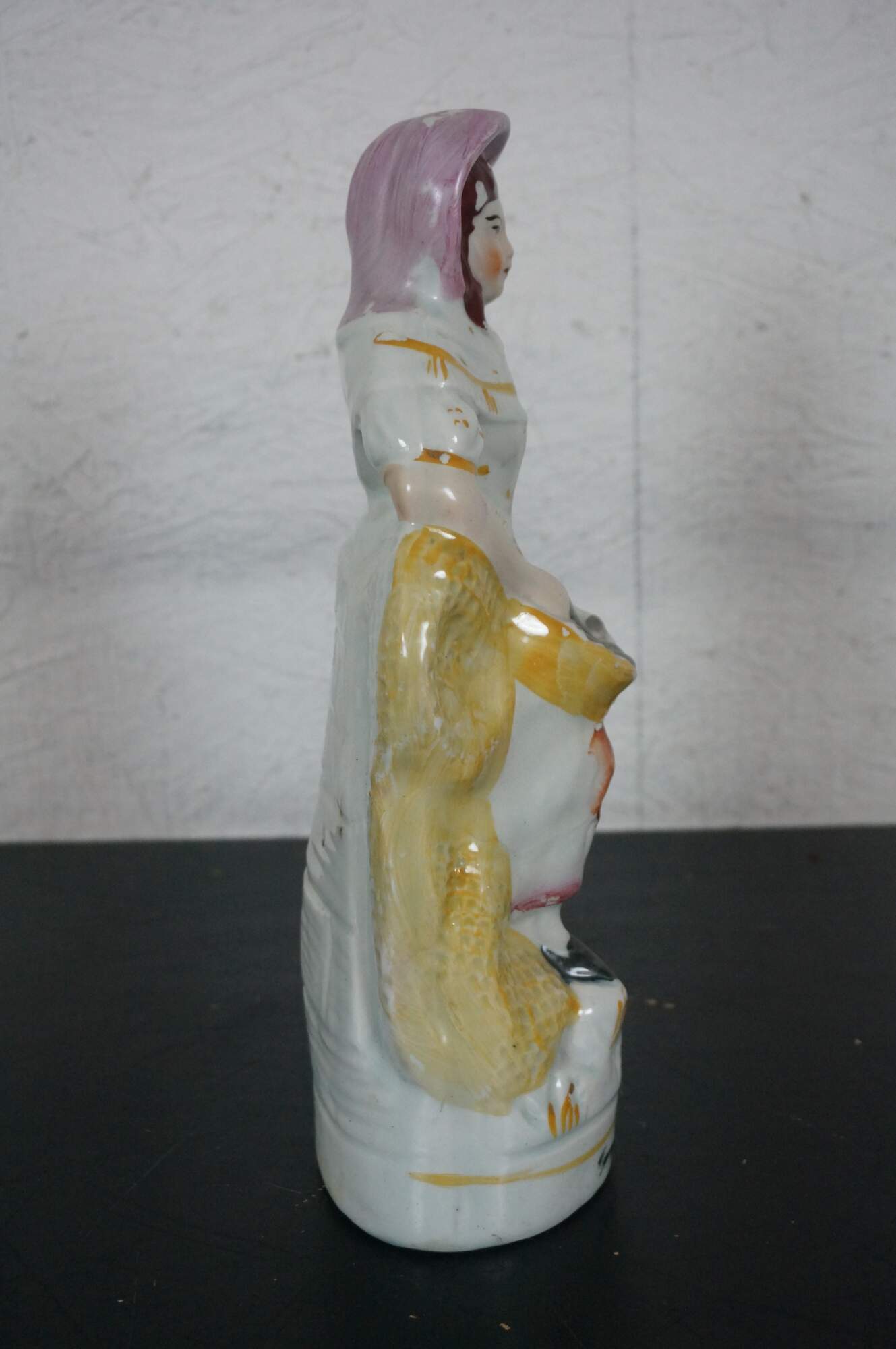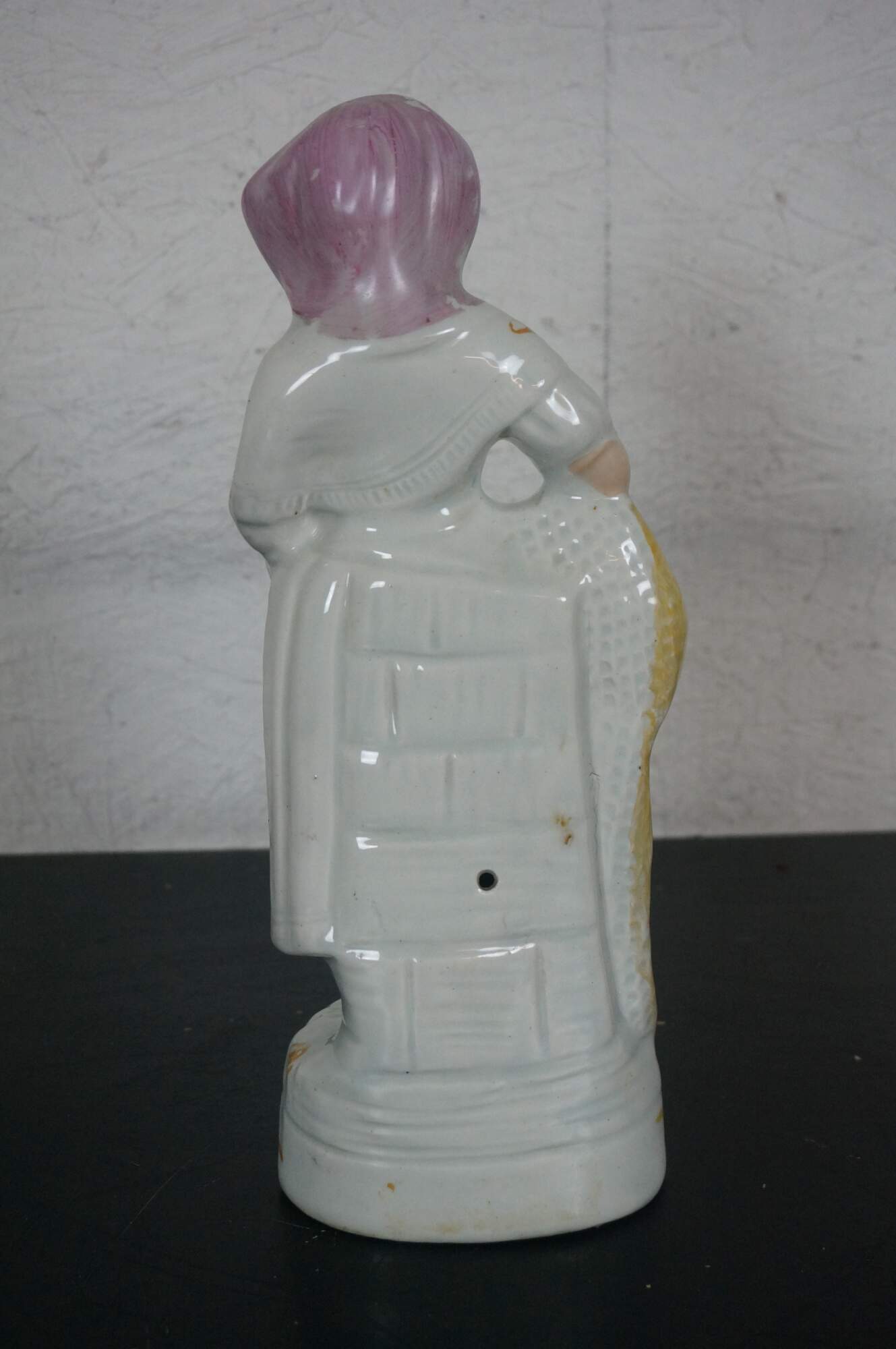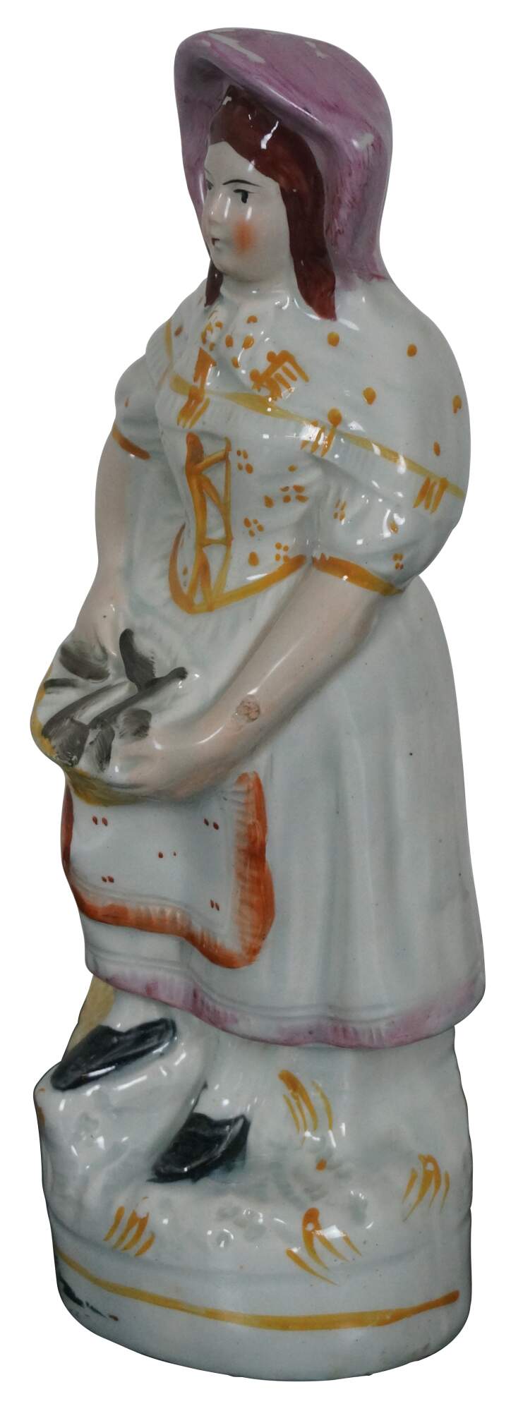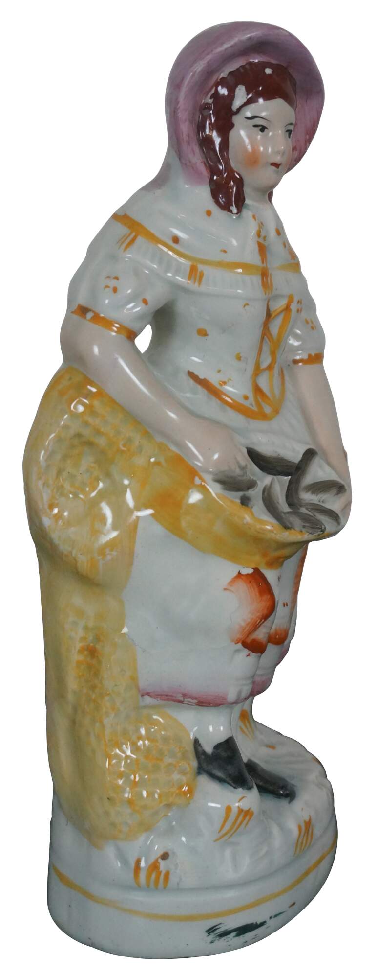 Antique 19th century English Staffordshire porcelain figurine in the shape of a female fishmonger or Fishwife with a fishing net, wearing a pink hat and carrying a small basket of fish or eels.