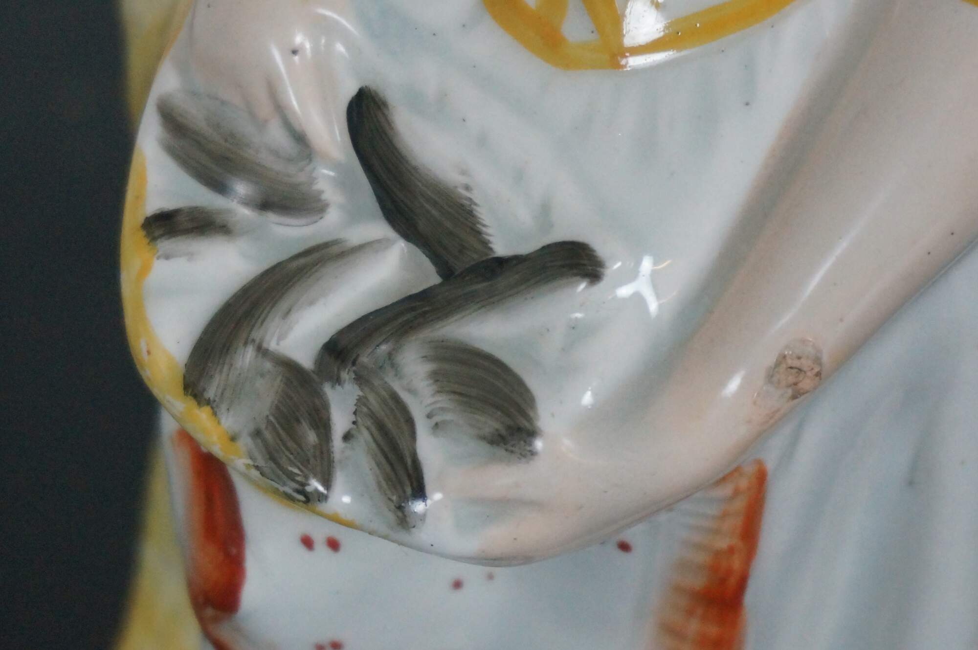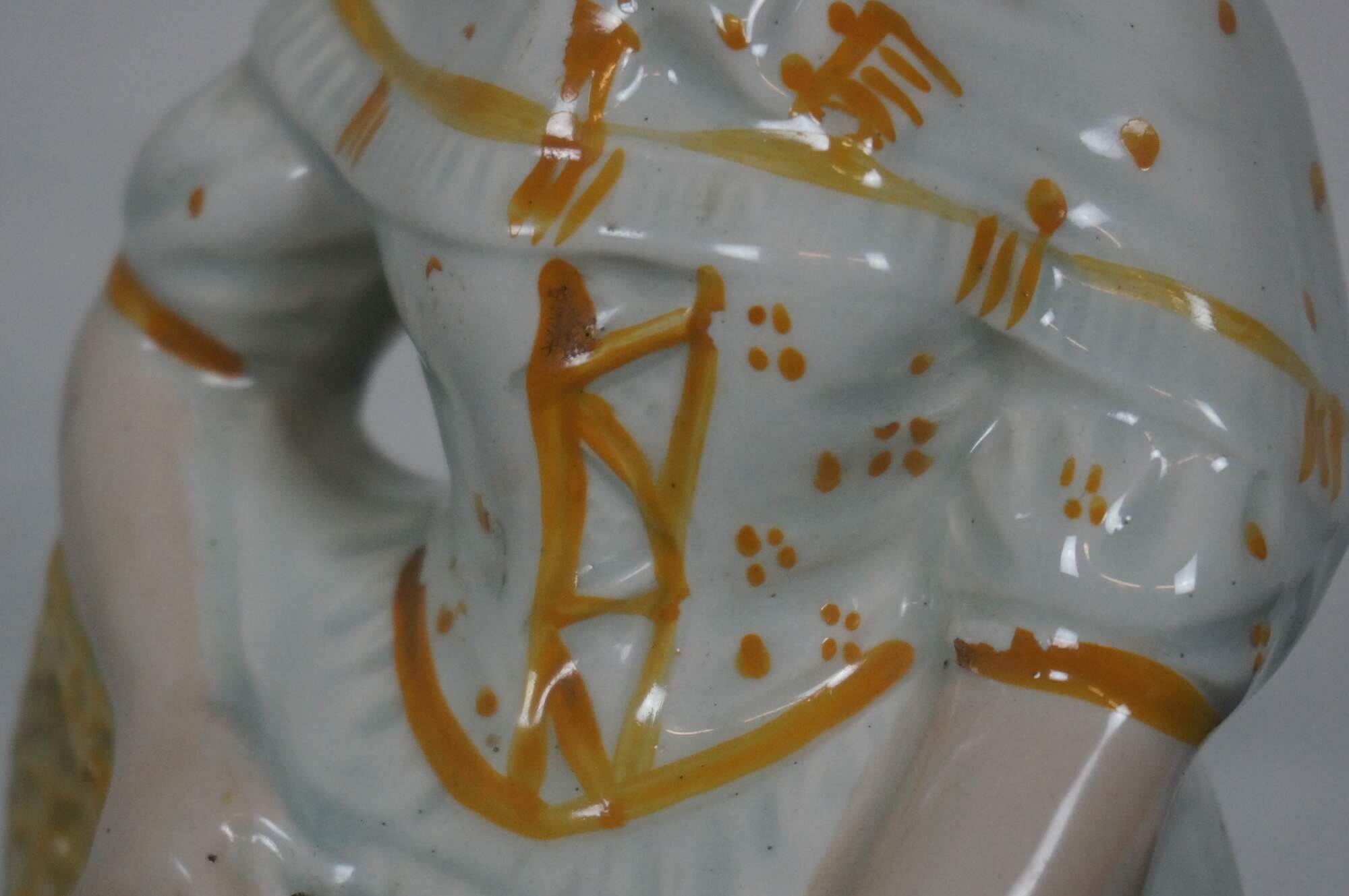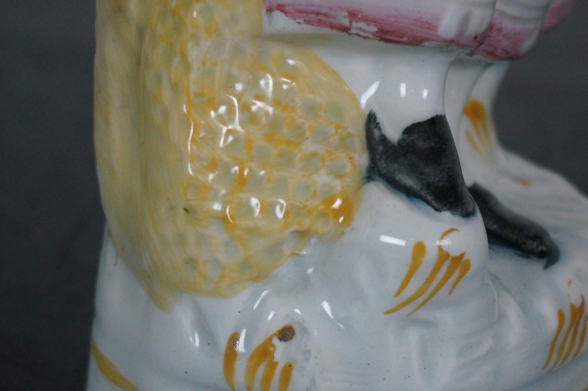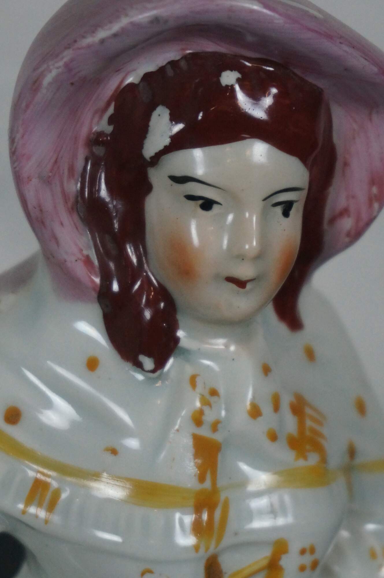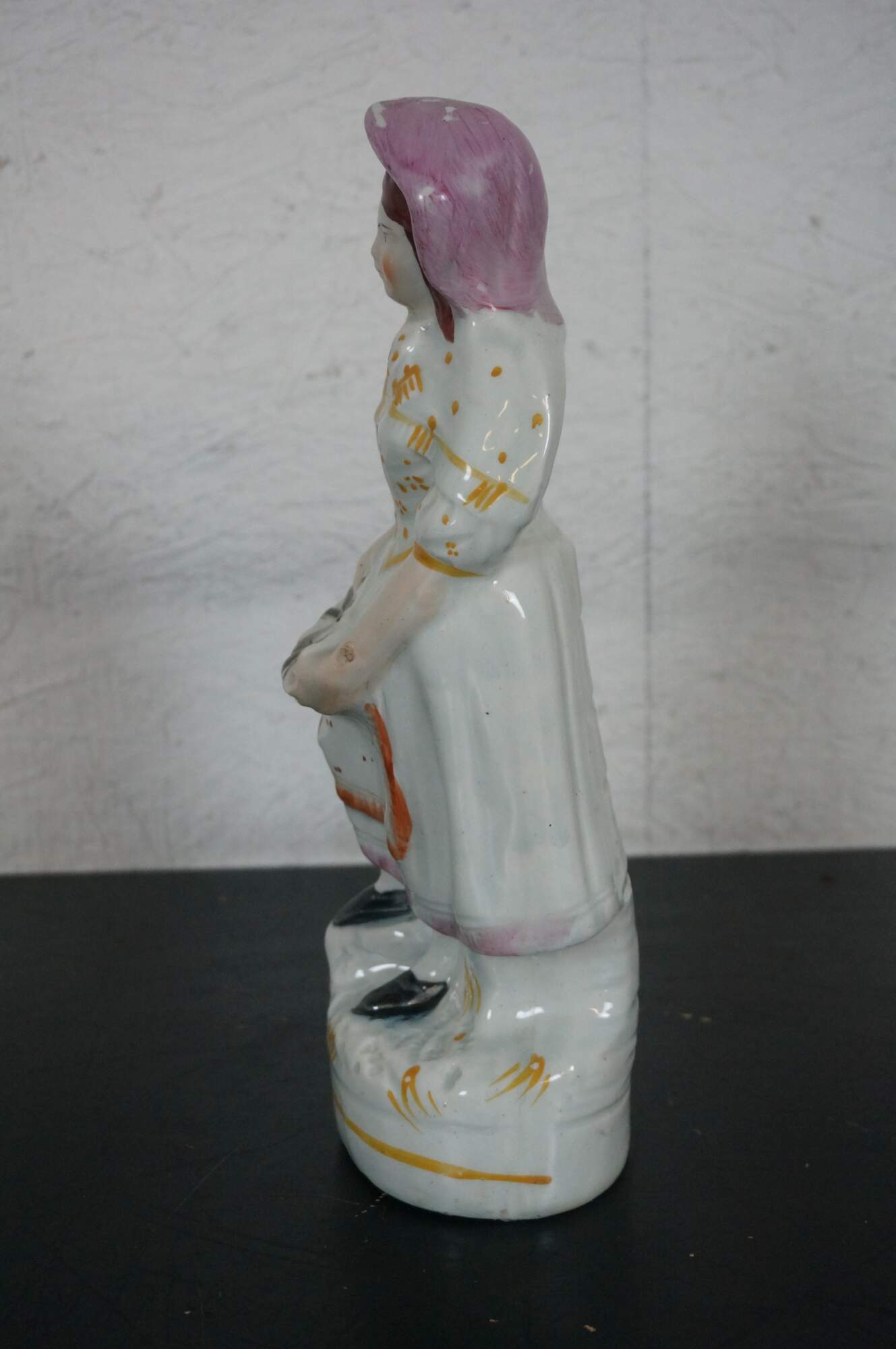 Antique 19th century English Staffordshire porcelain figurine in the shape of a female fishmonger or Fishwife with a fishing net, wearing a pink hat and carrying a small basket of fish or eels.
