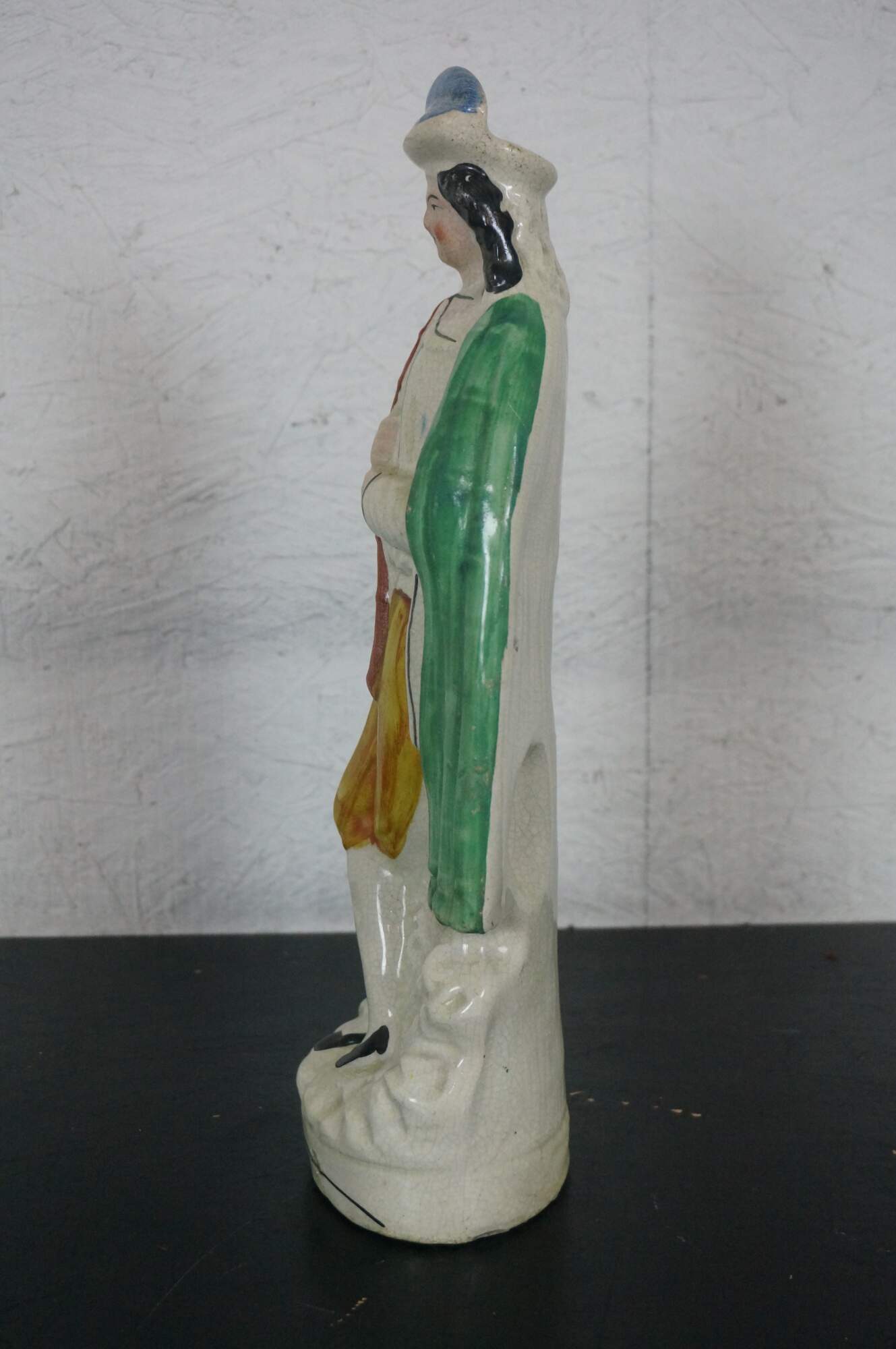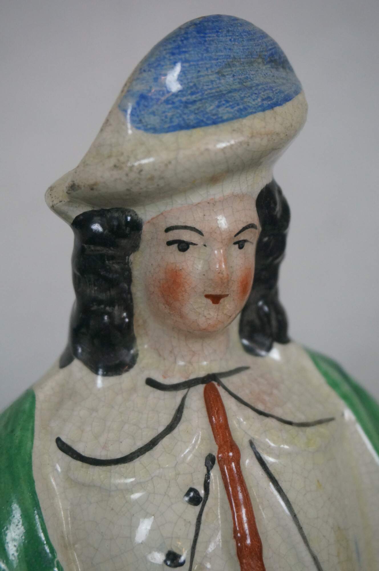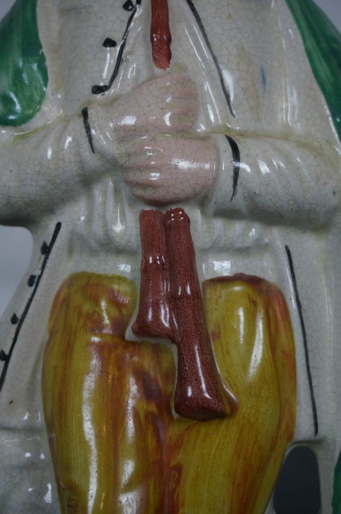 Antique 19th century English Staffordshire porcelain musician figurine in the shape of a man holding a pair of pipes or a chanter for bagpipes.