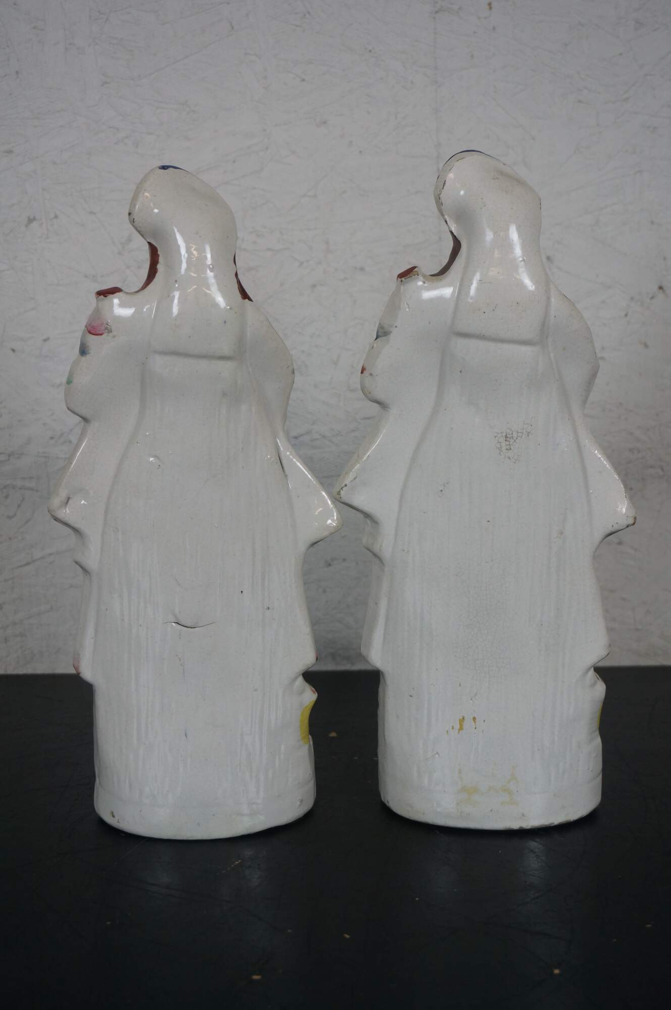 Pair of antique English Staffordshire porcelain mantel figures in the shape of Victorian woman in feathered hats holding mandolins.
