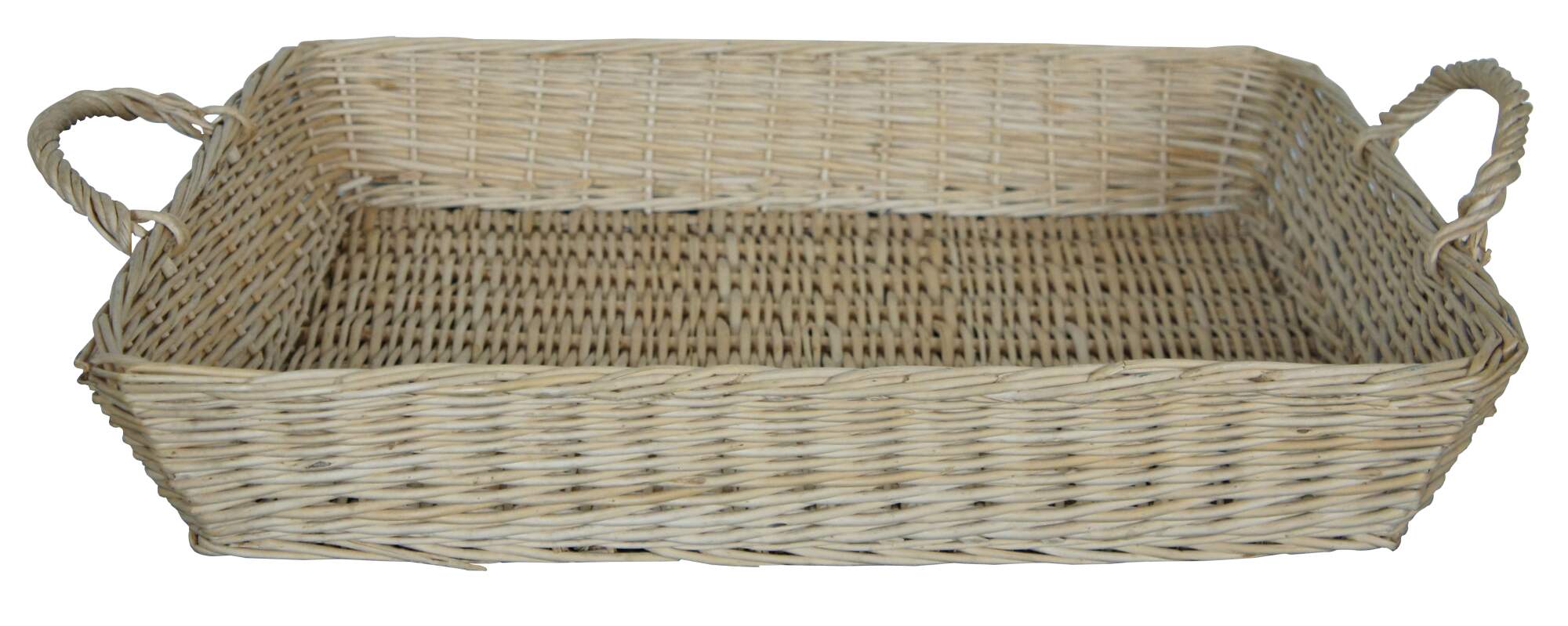 Vintage rectangular wicker basket or serving tray with handles on the ends.