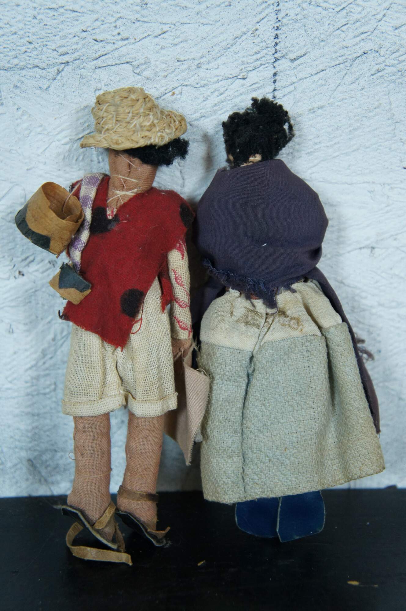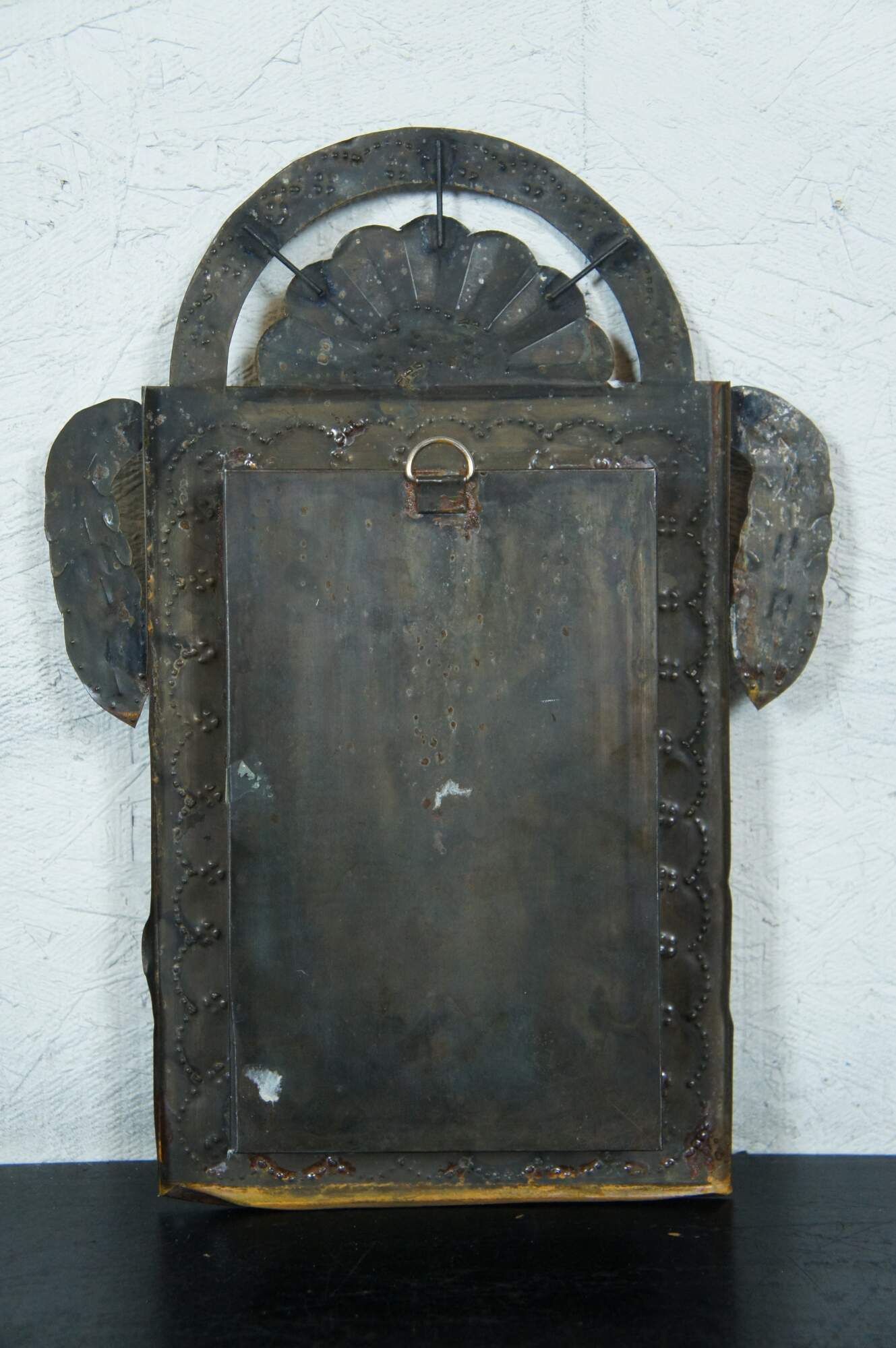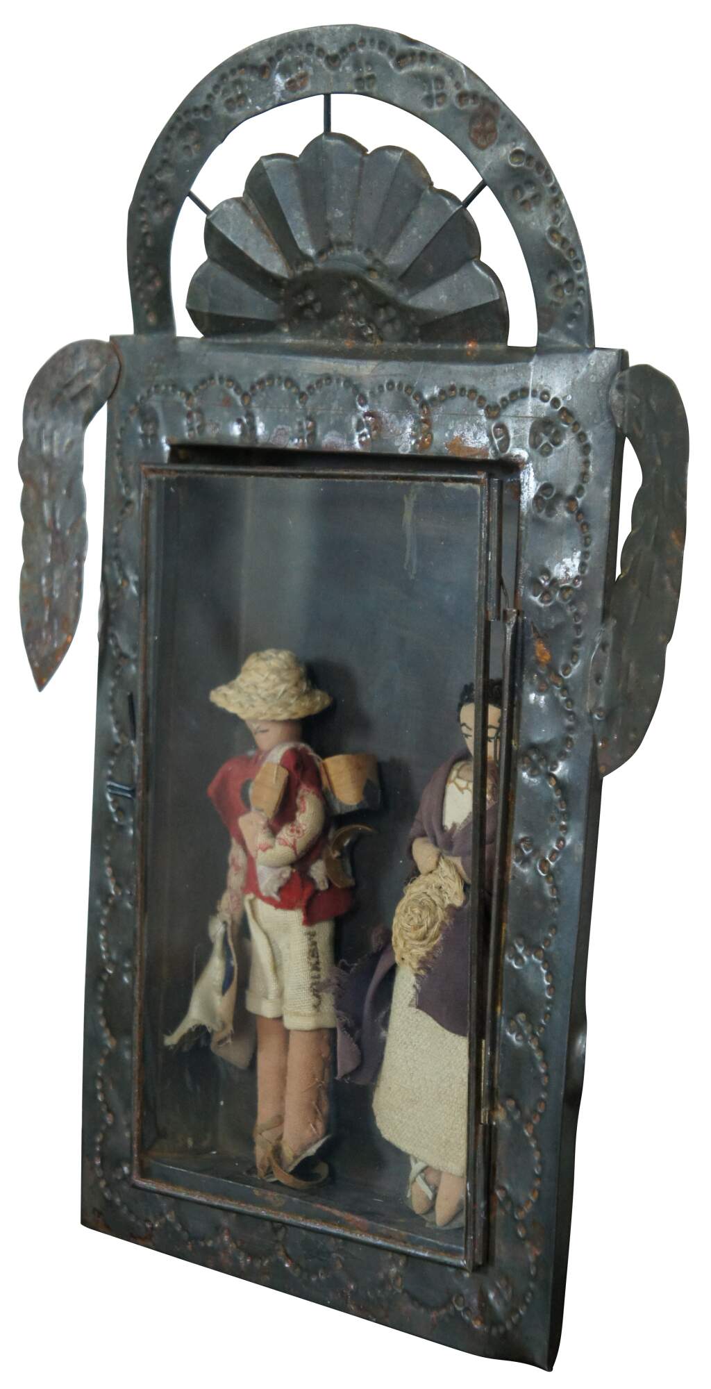 Vintage Mexican punched tin shadow box frame or nicho with glass front, containing a pair of South American folk art cloth dolls.
