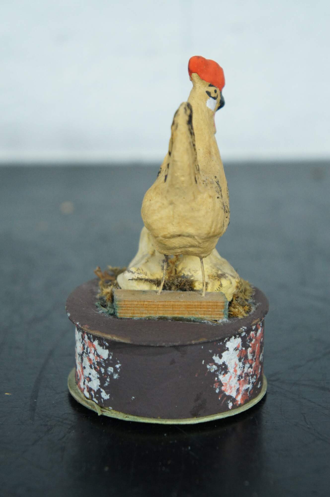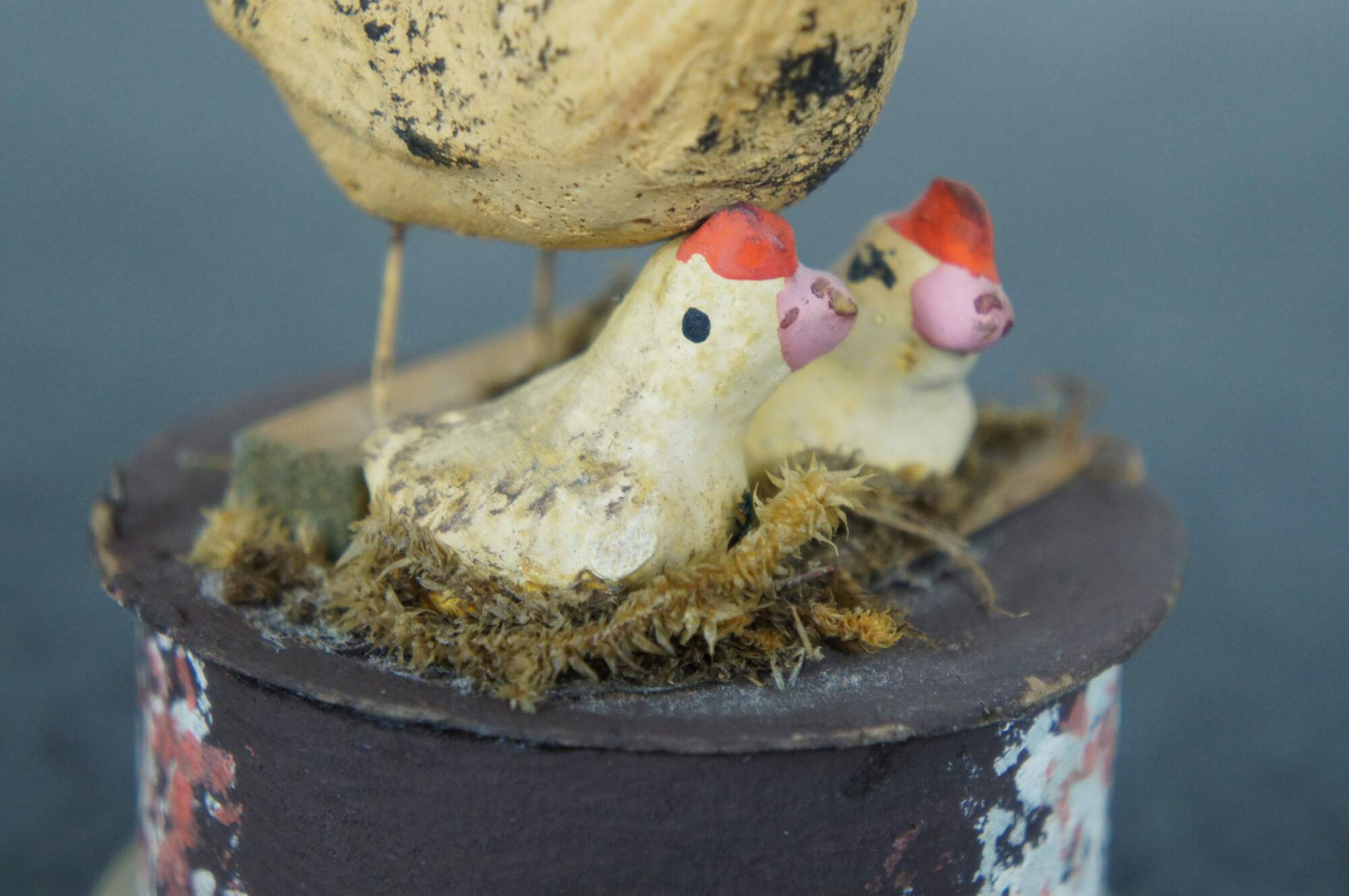 Antique German paper mache Easter candy container in the shape of yellow chicken with two chicks in a nest, standing on a simple brown base.
