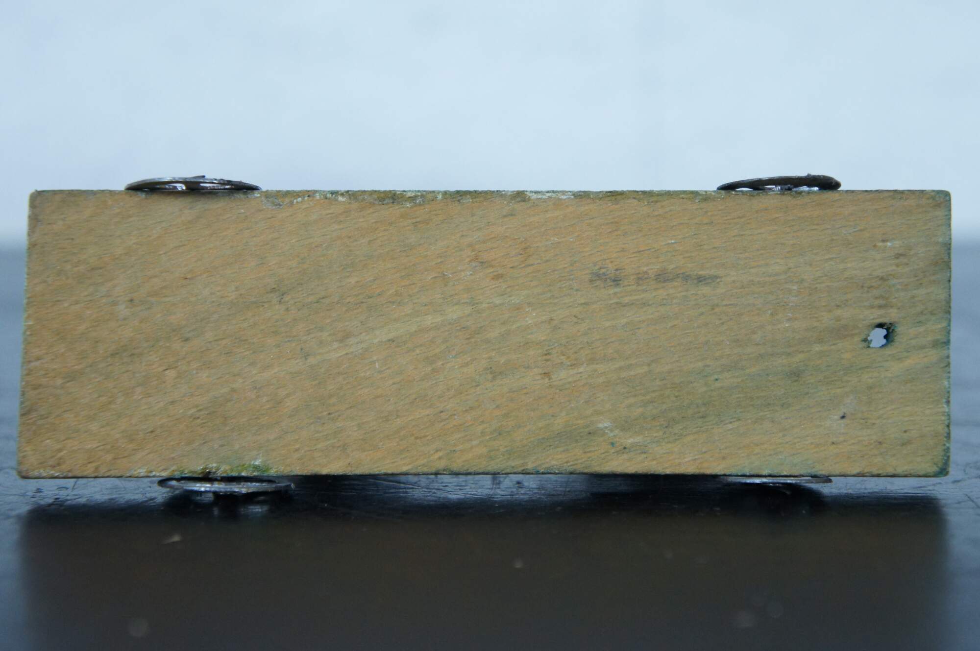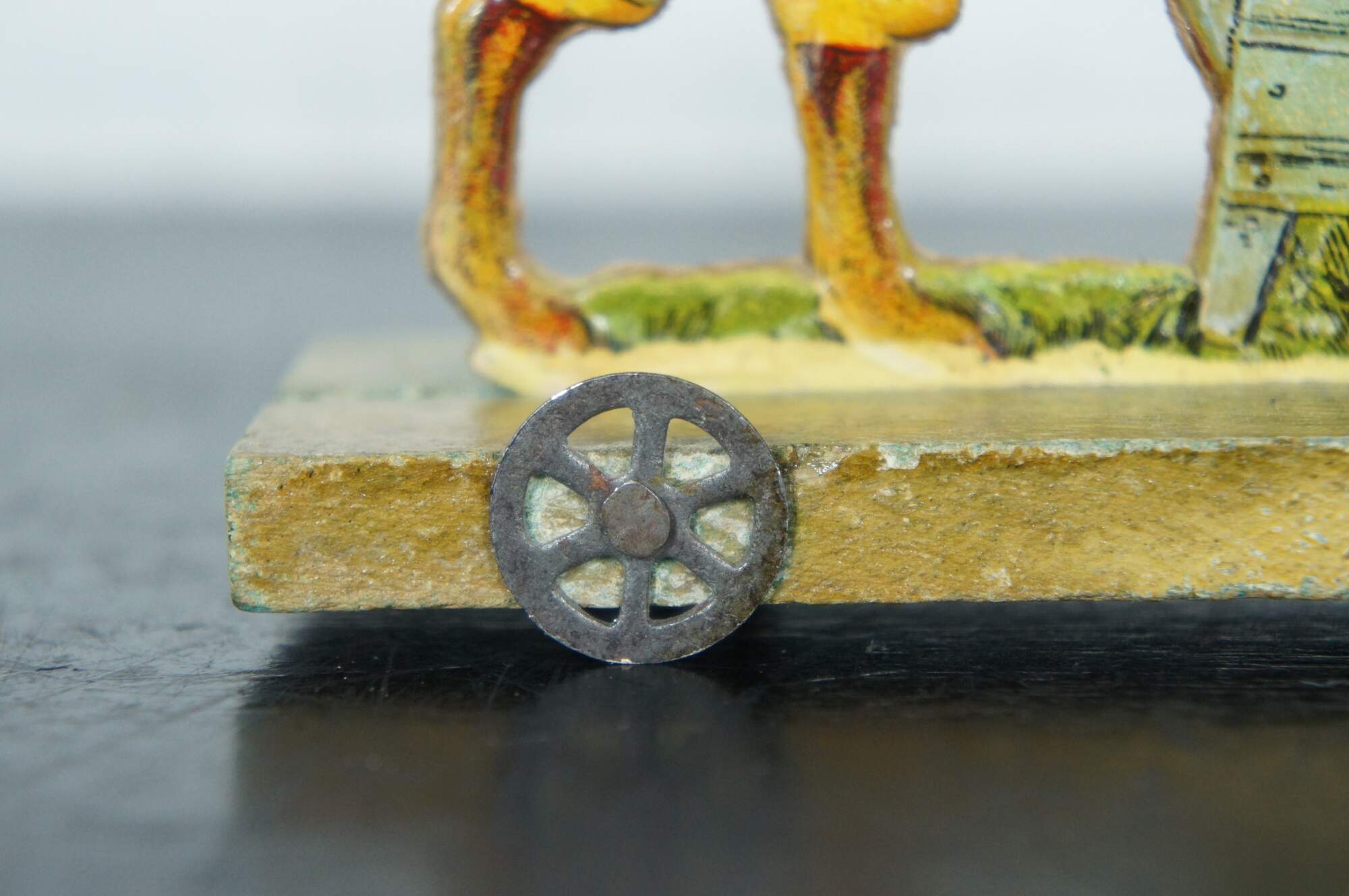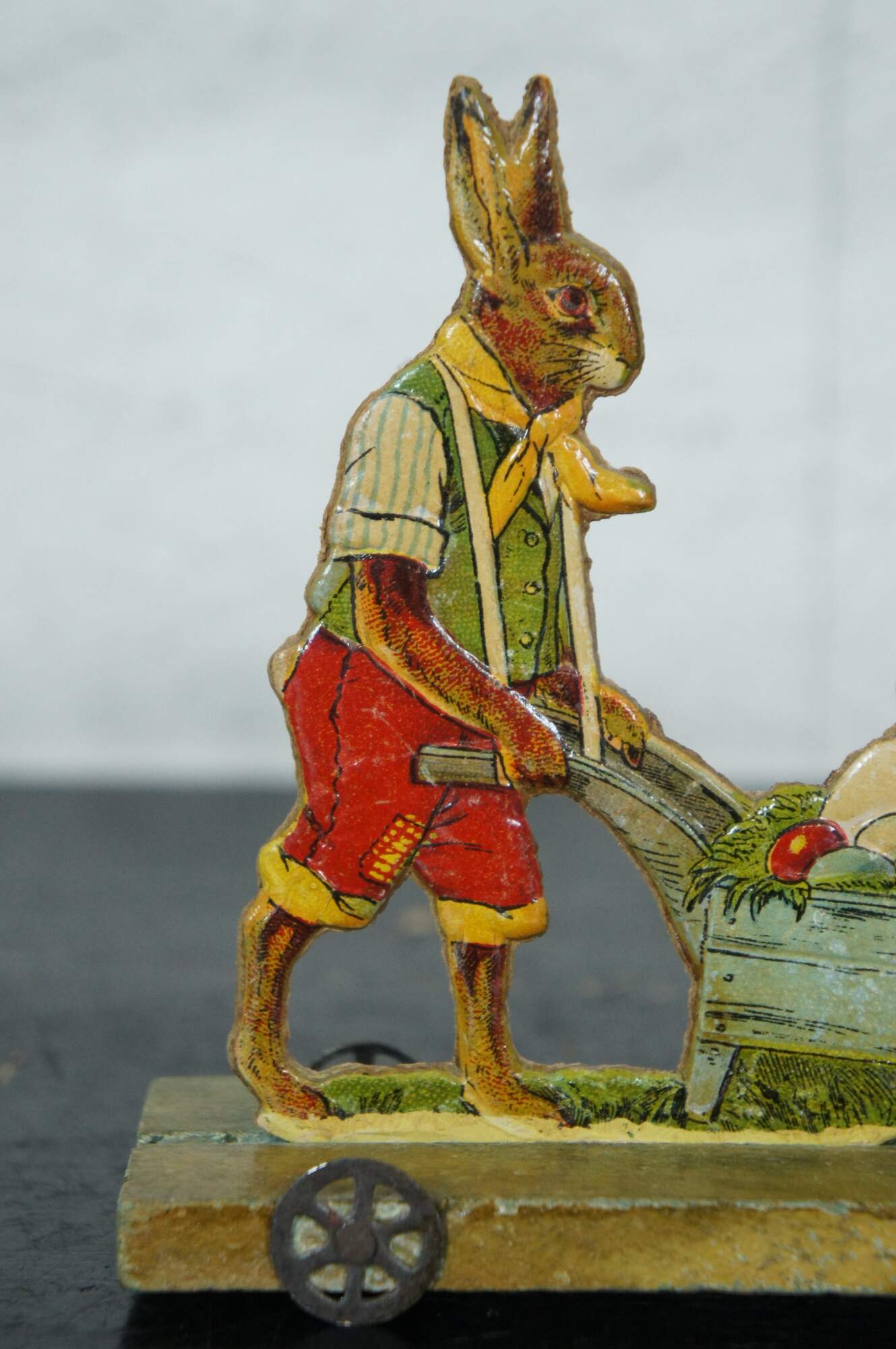 Primitive antique German pull toy featuring a wooden platform with metal wheels, topped with an inset cardboard lithograph print of two anthropomorphic rabbits with a wheelbarrow filled with eggs.