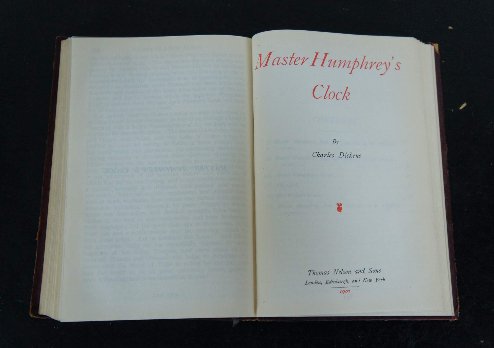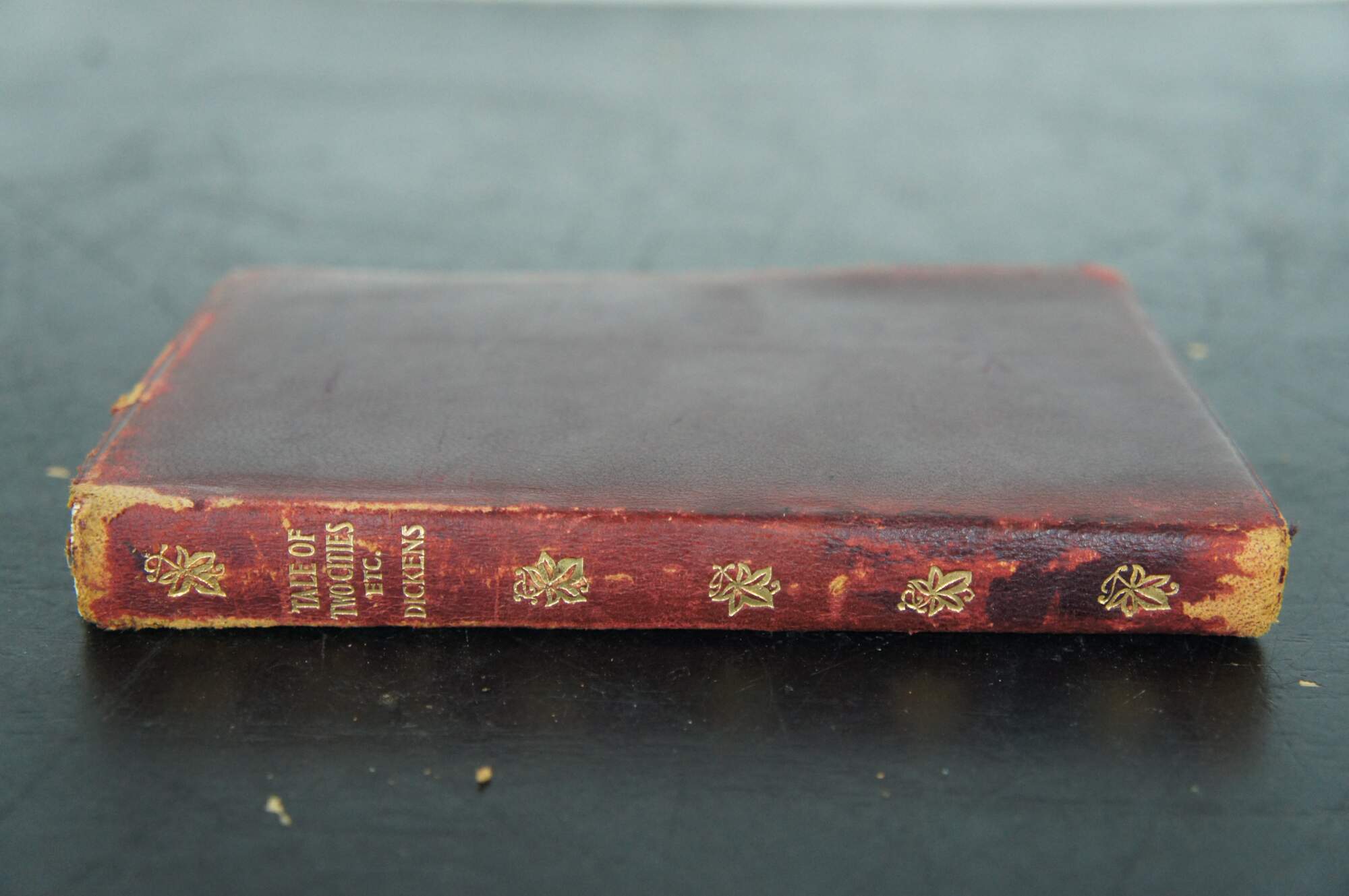 Antique red leather soft cover copy of “A Tales of Two Cities, Pictures from Italy, and Master Humphrey’s Clock” by Charles Dickens, published by Thomas Nelson and Sons, 1907.