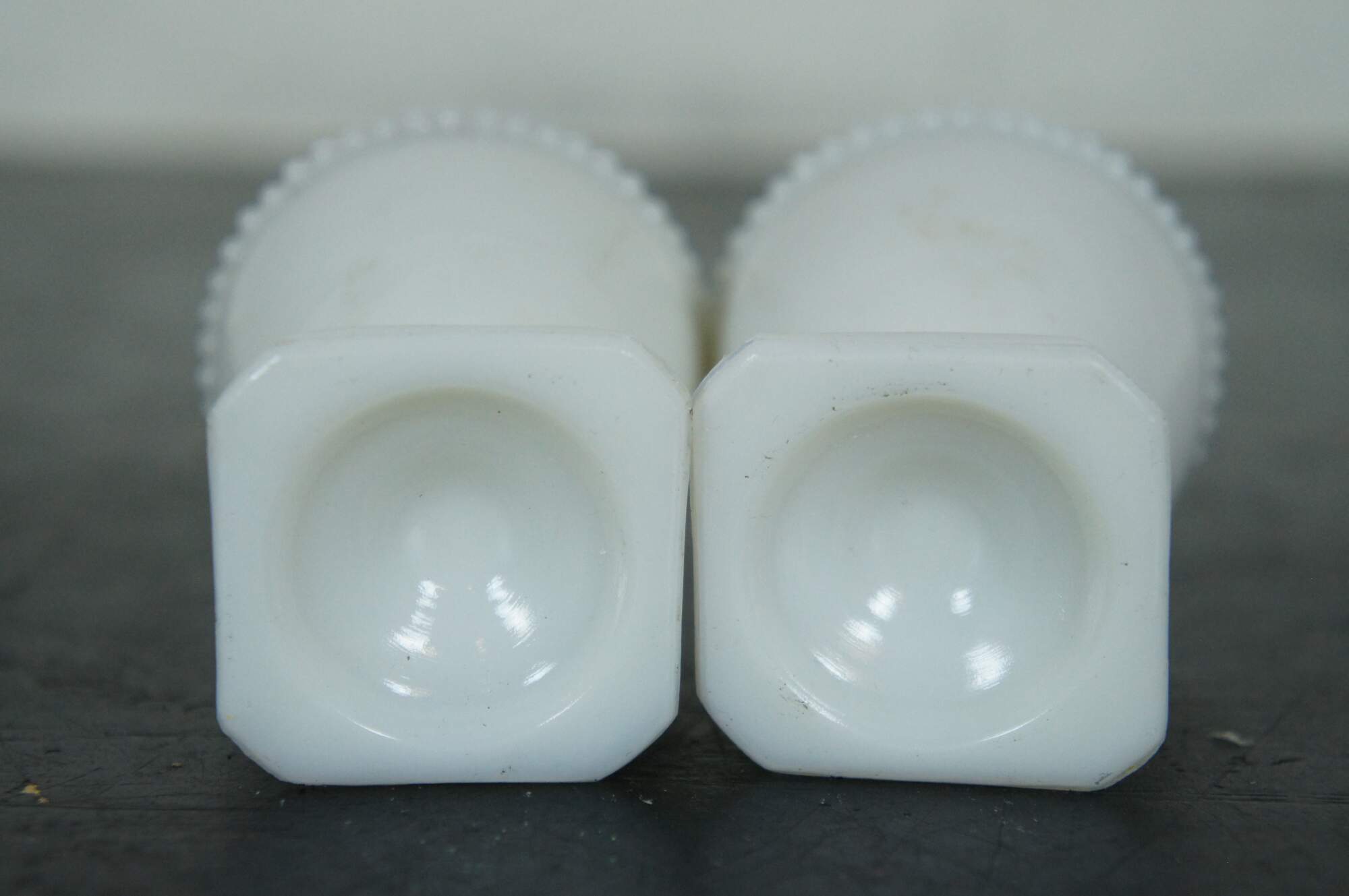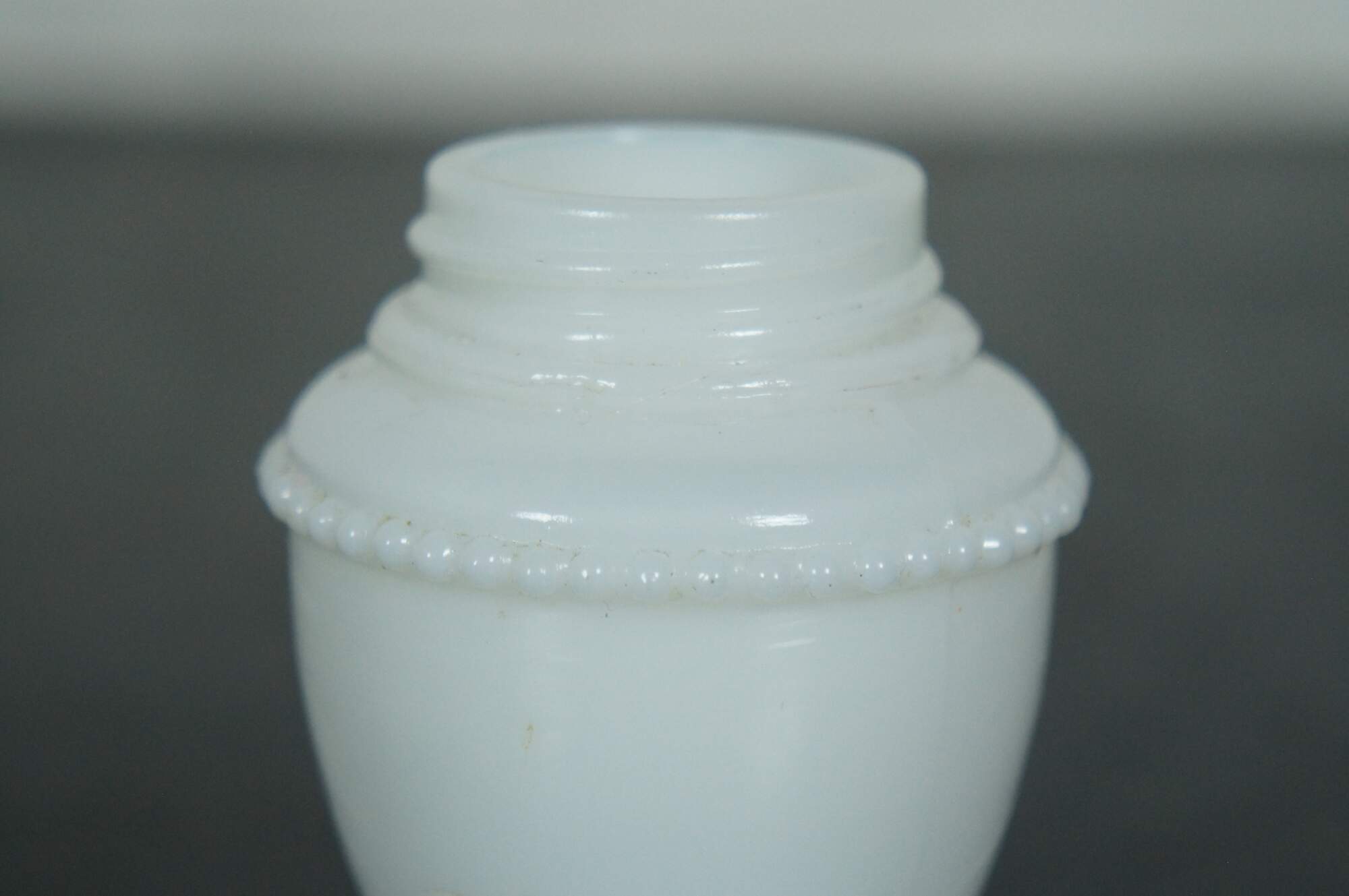 Pair of vintage urn shaped milk glass salt and pepper shakers with metal lids.
