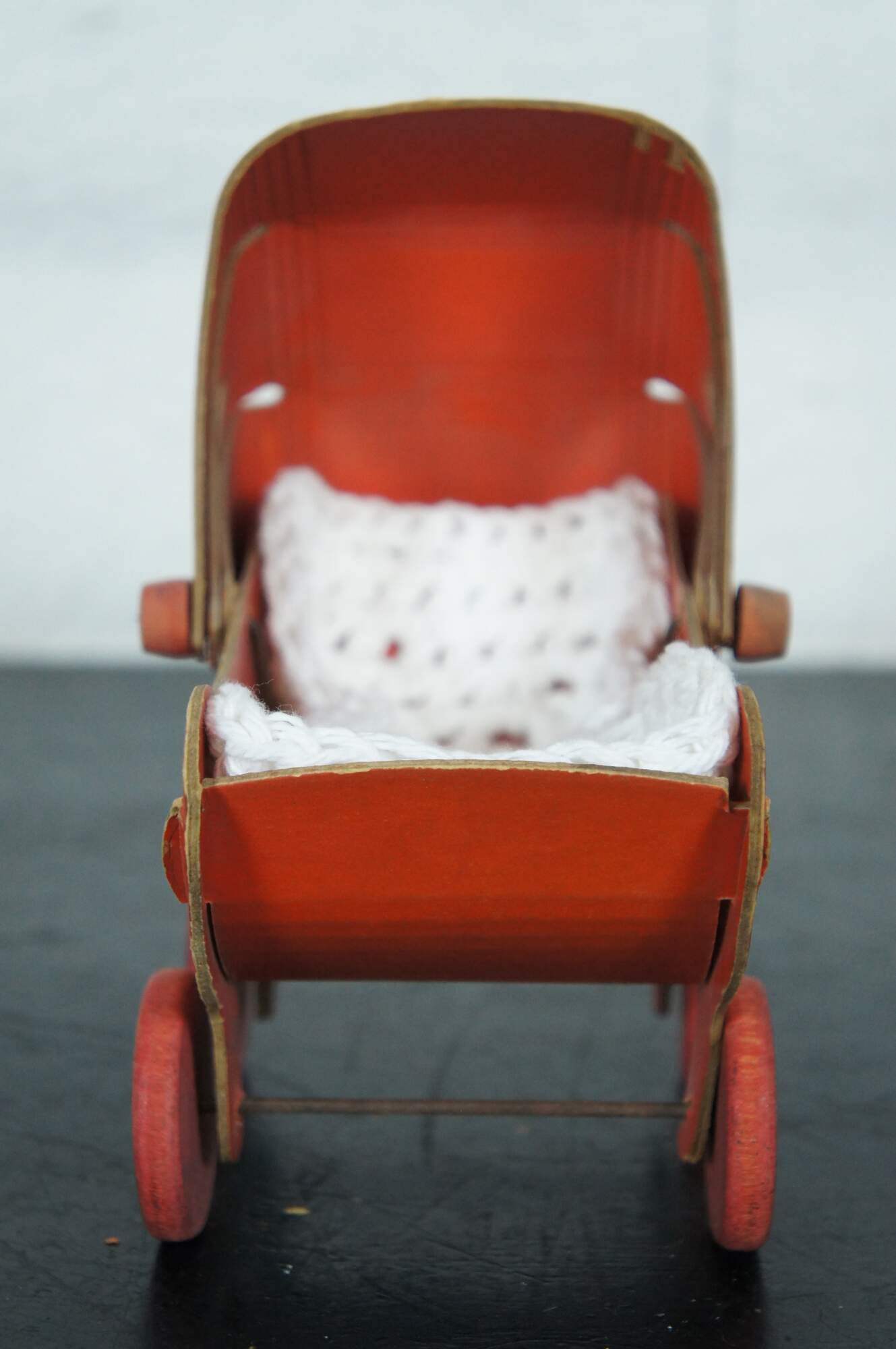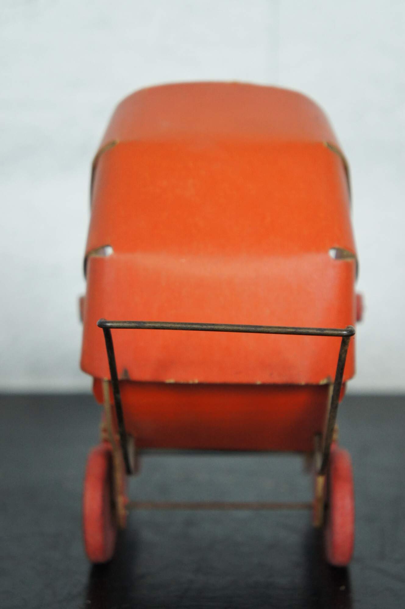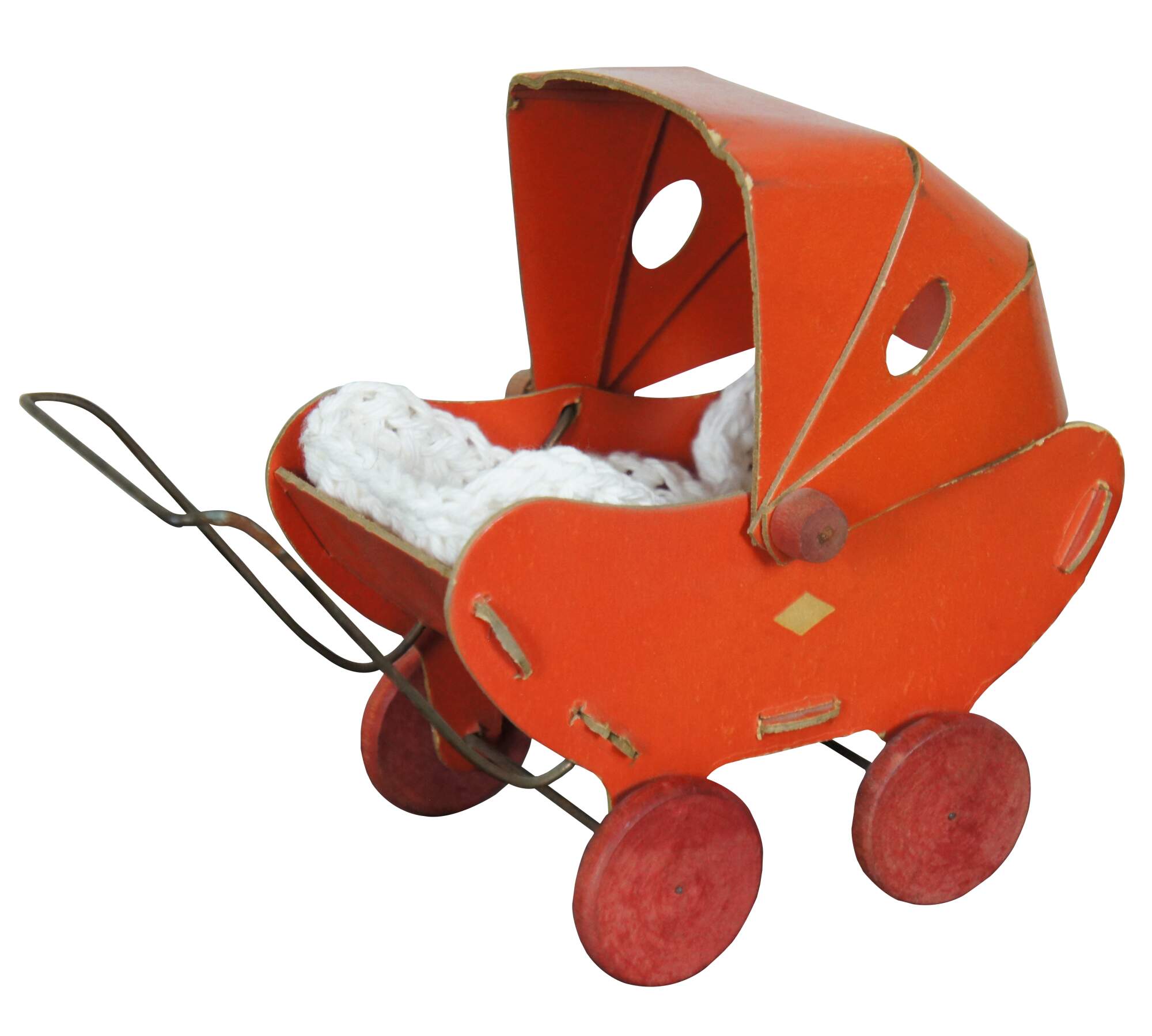Antique 1930s red cardboard baby doll stroller Easter candy container with rotating hood and wooden wheels, a Fibro Toy by The Dolly Folding Kite and Toy Company of Dayton, Ohio.