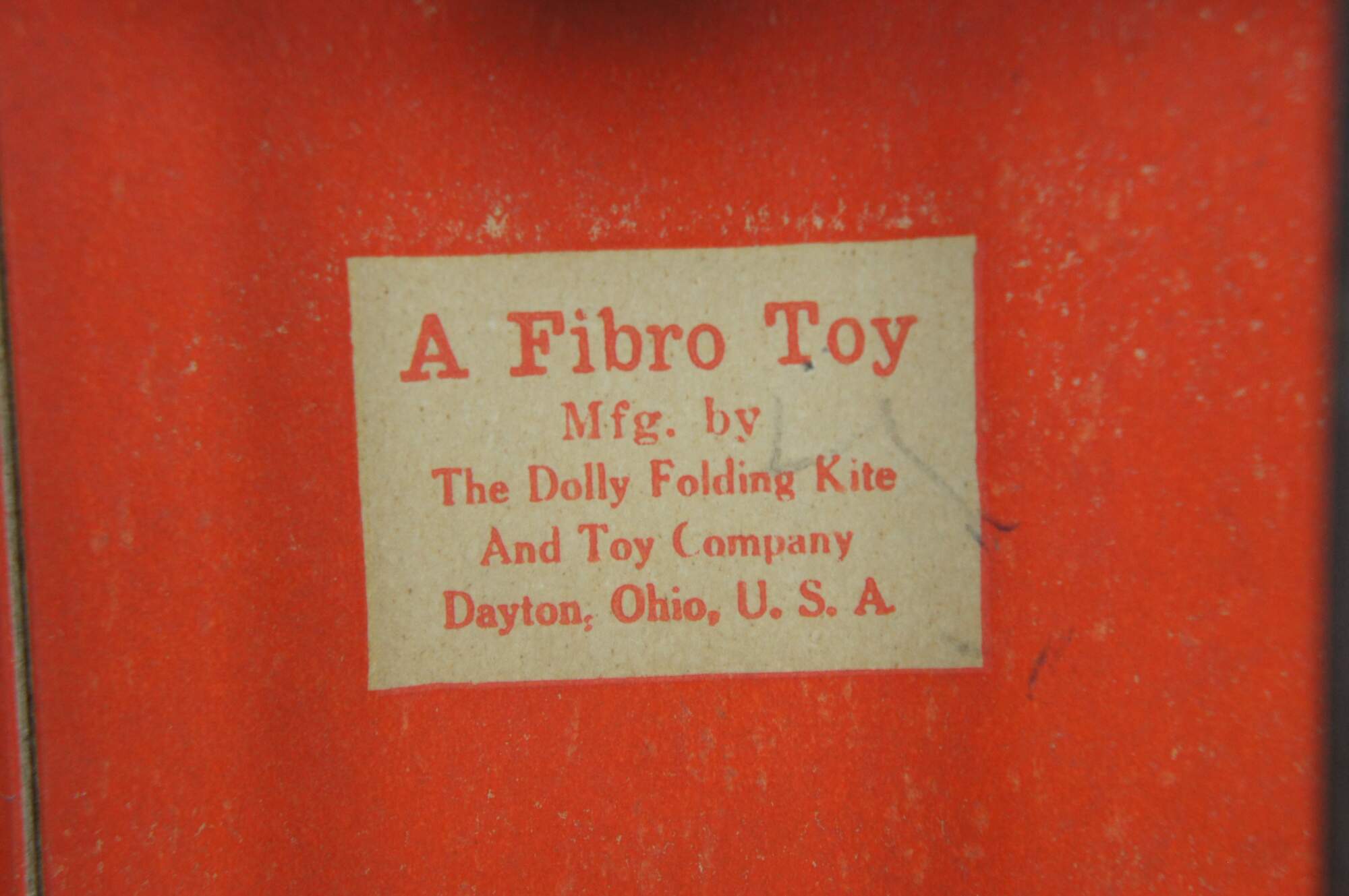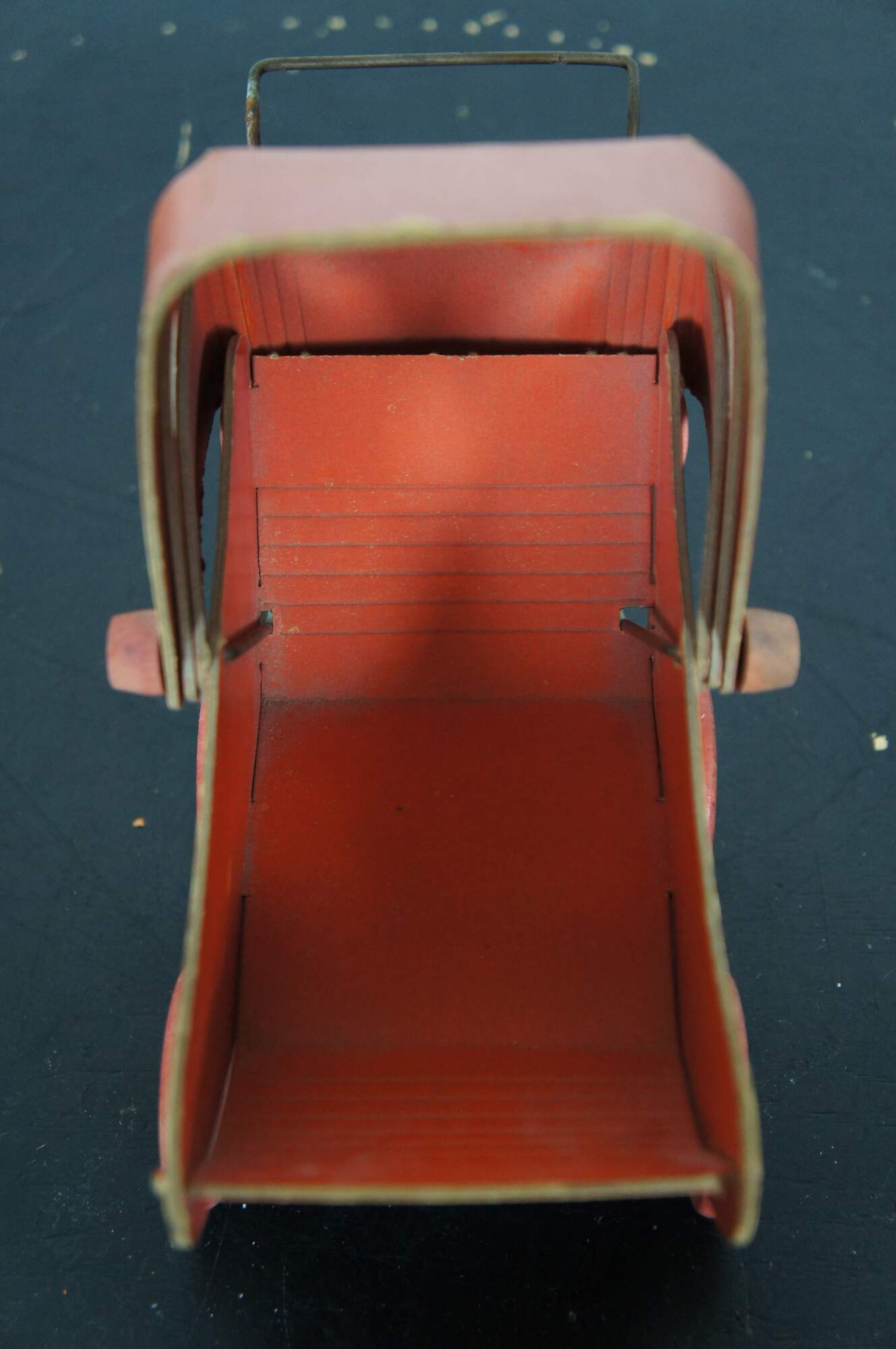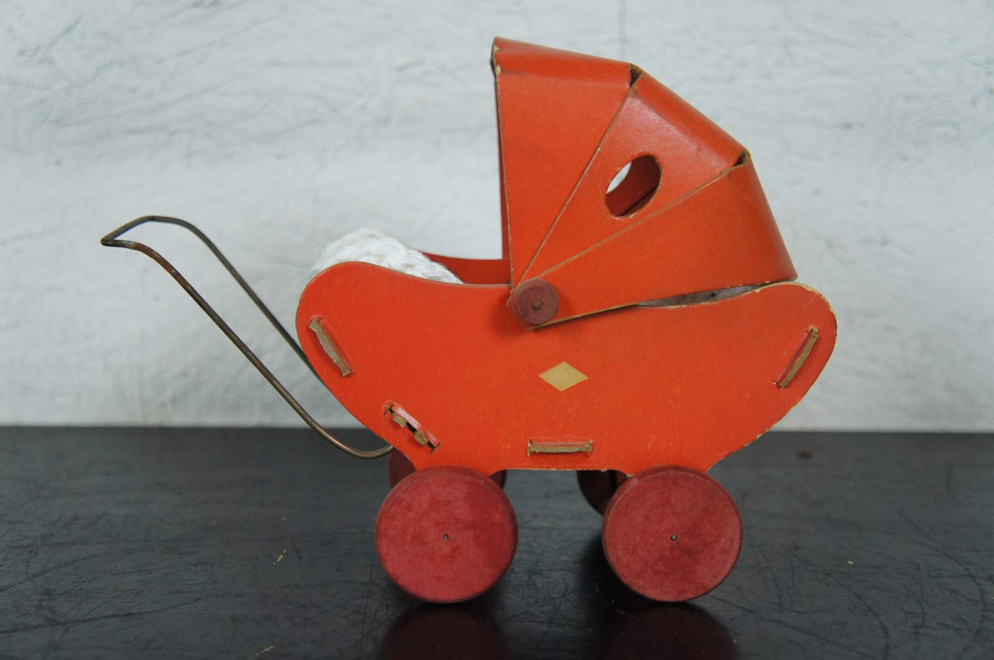 Antique 1930s red cardboard baby doll stroller Easter candy container with rotating hood and wooden wheels, a Fibro Toy by The Dolly Folding Kite and Toy Company of Dayton, Ohio.