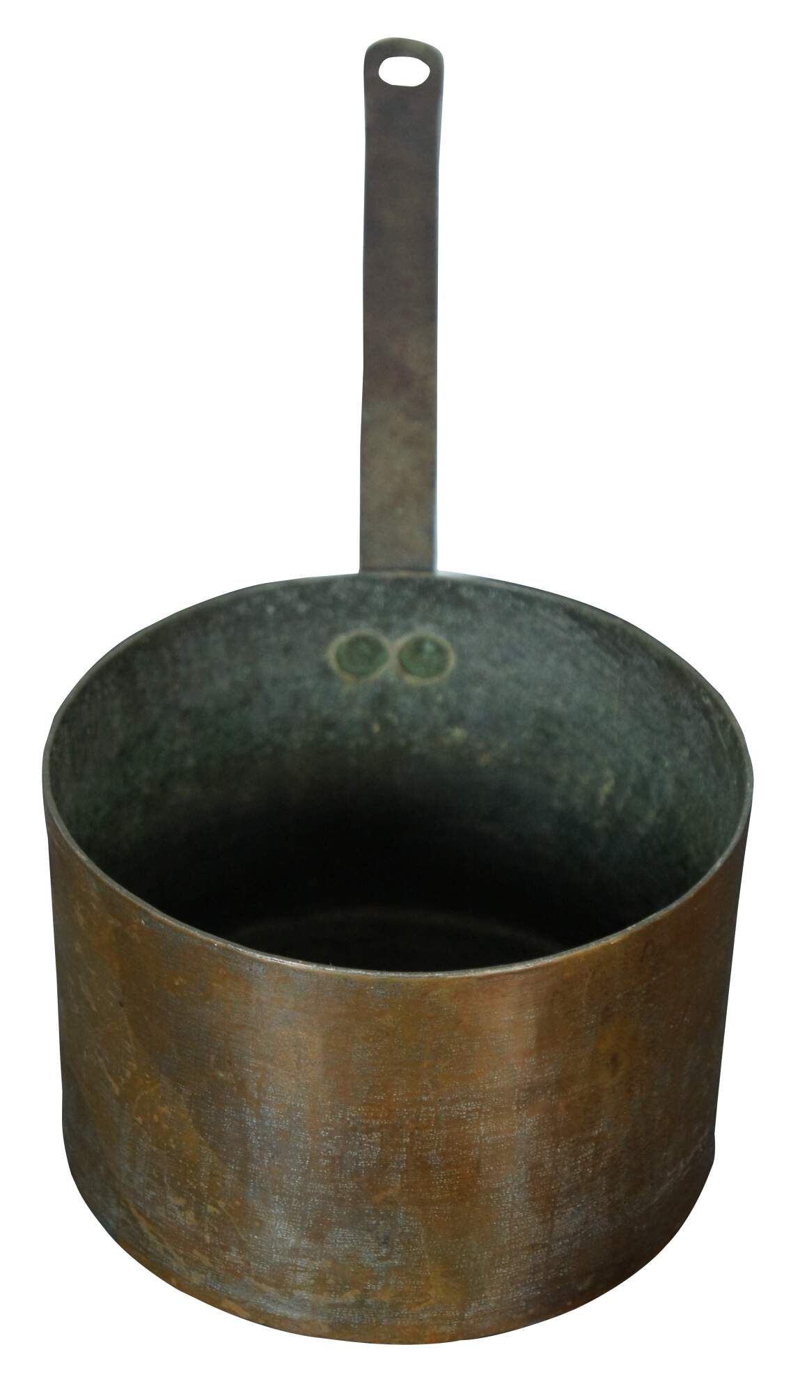 Antique copper sauce pan with iron handle; possibly marked with an M at the base of the handle.