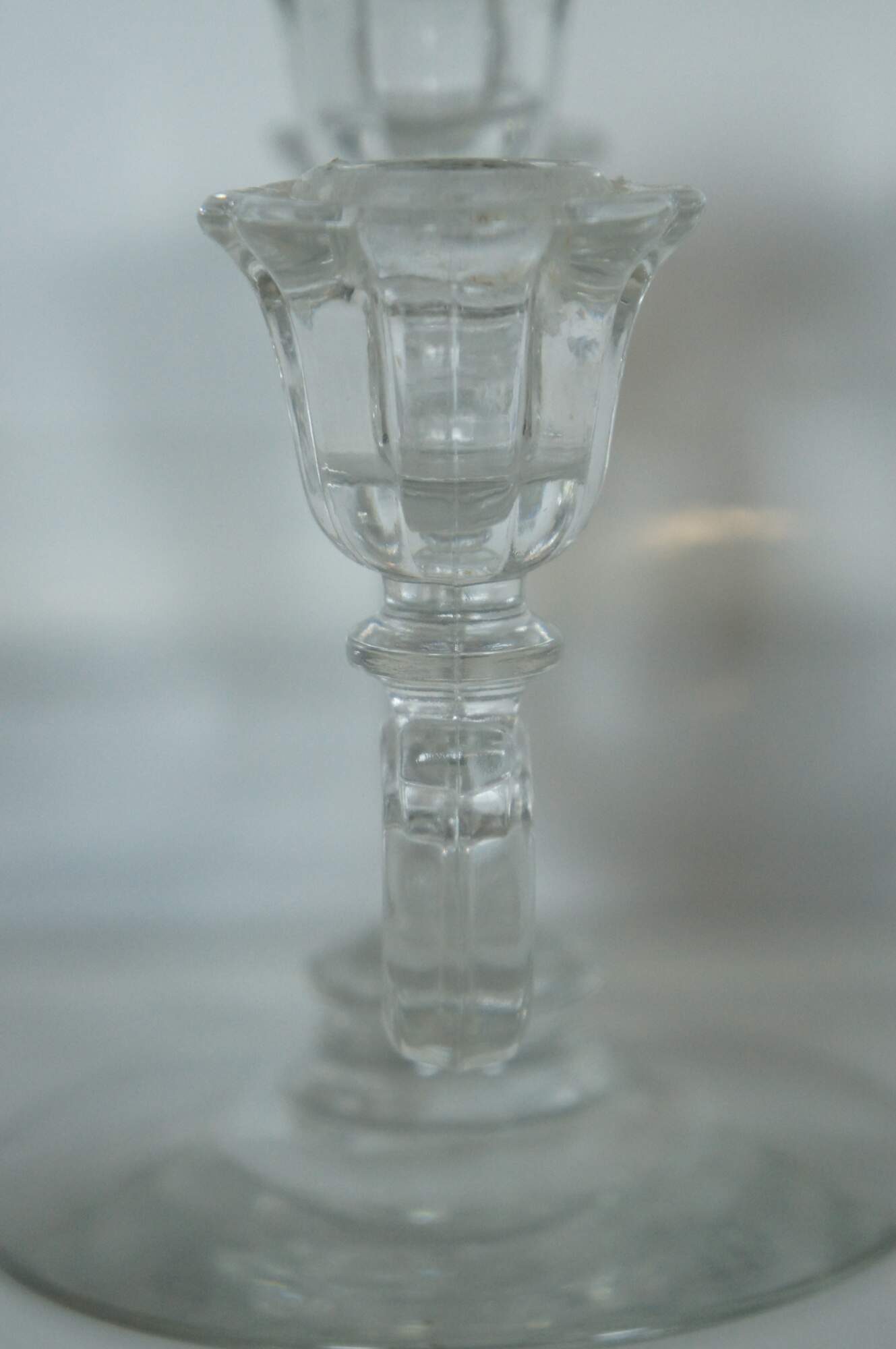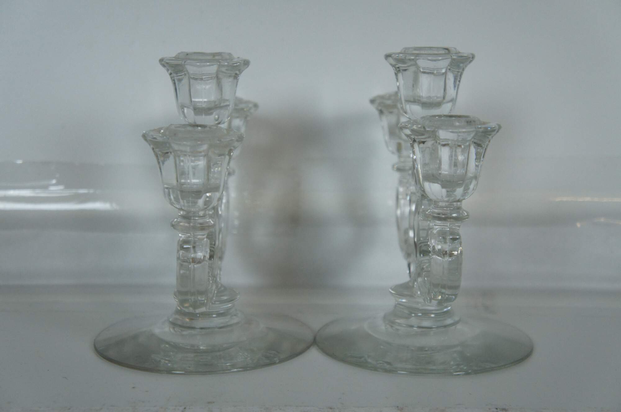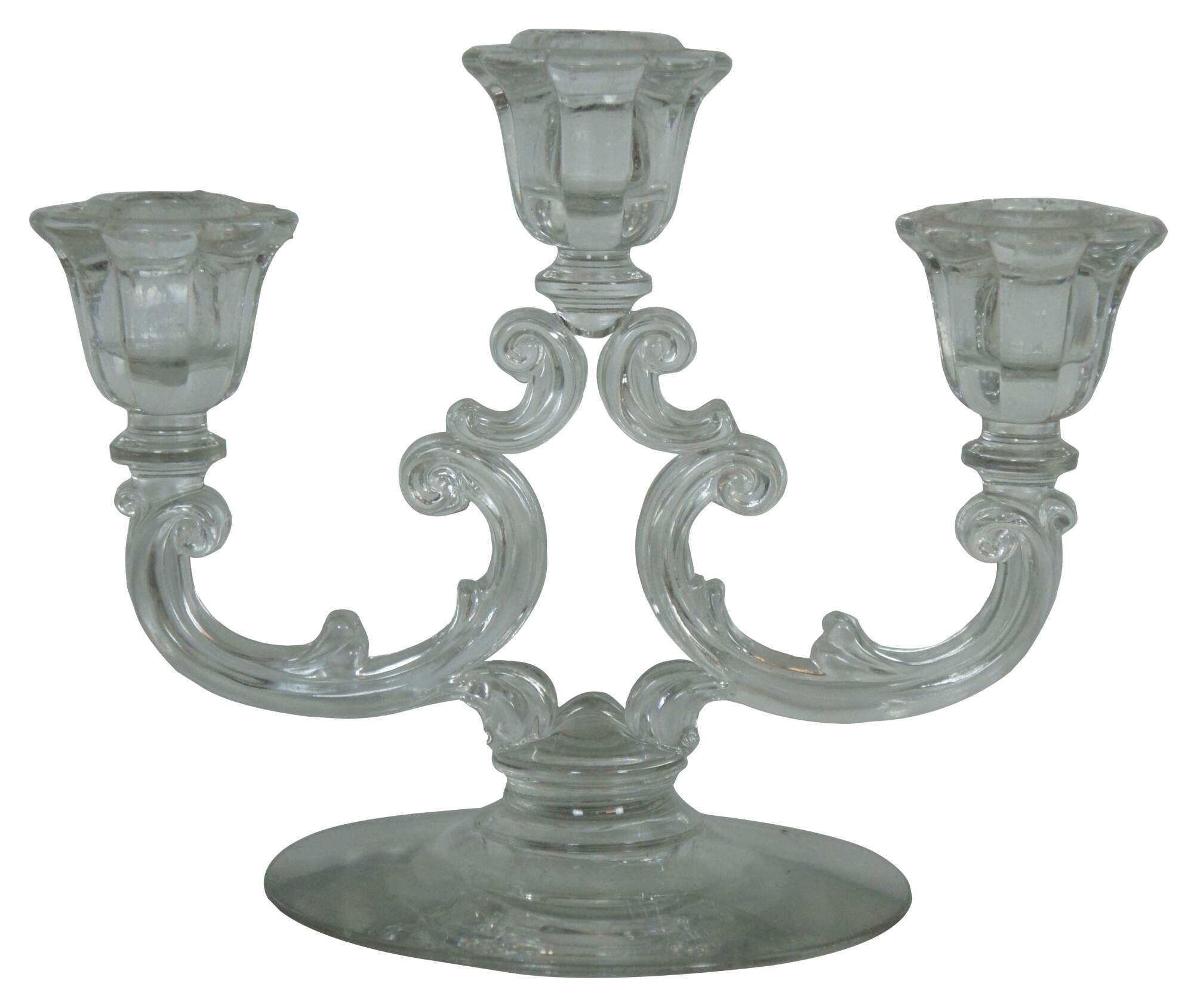 Pair of 1940’s Fostoria clear glass, Lafayette style triple light candle holders.