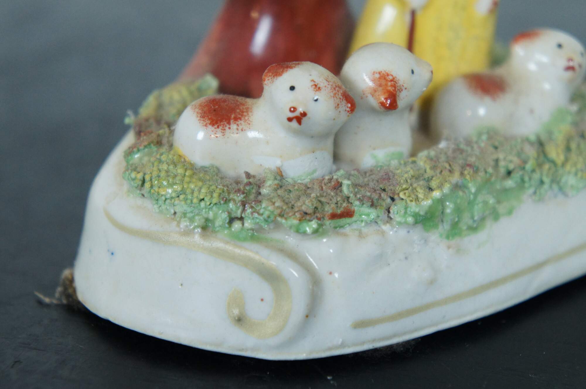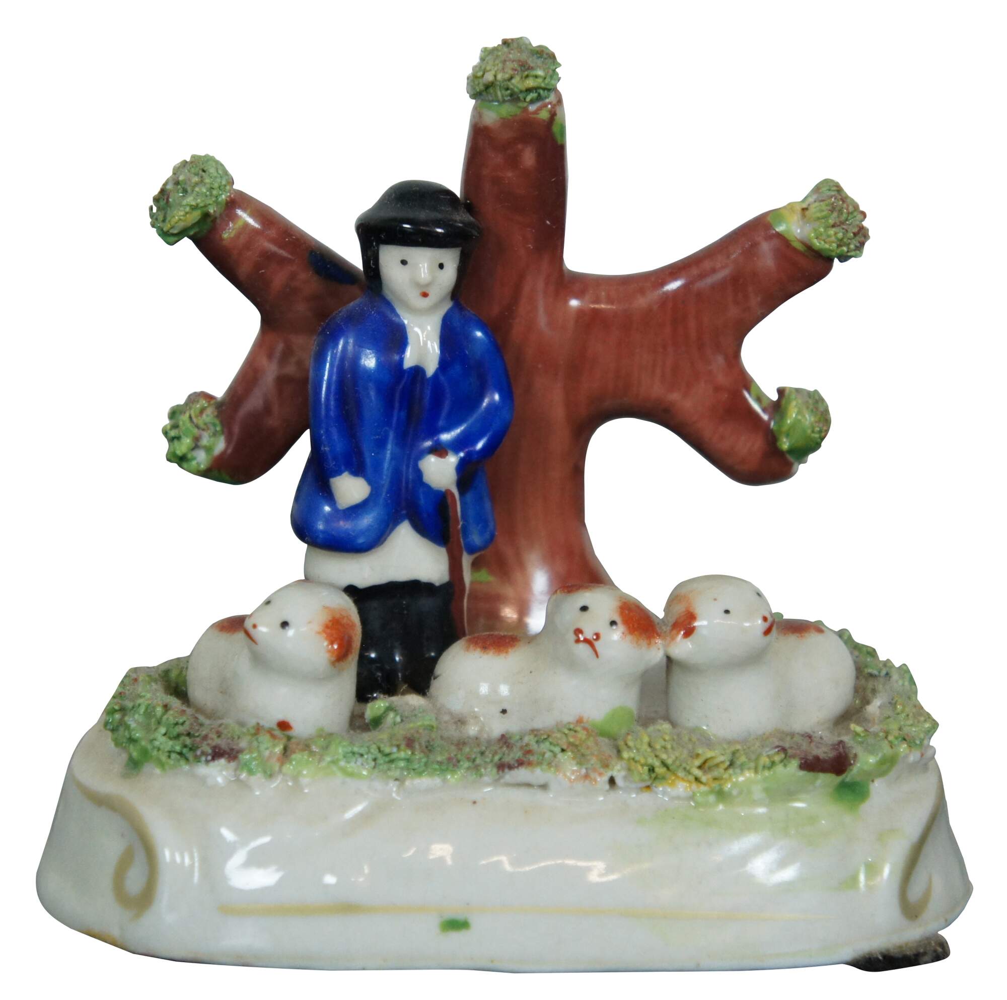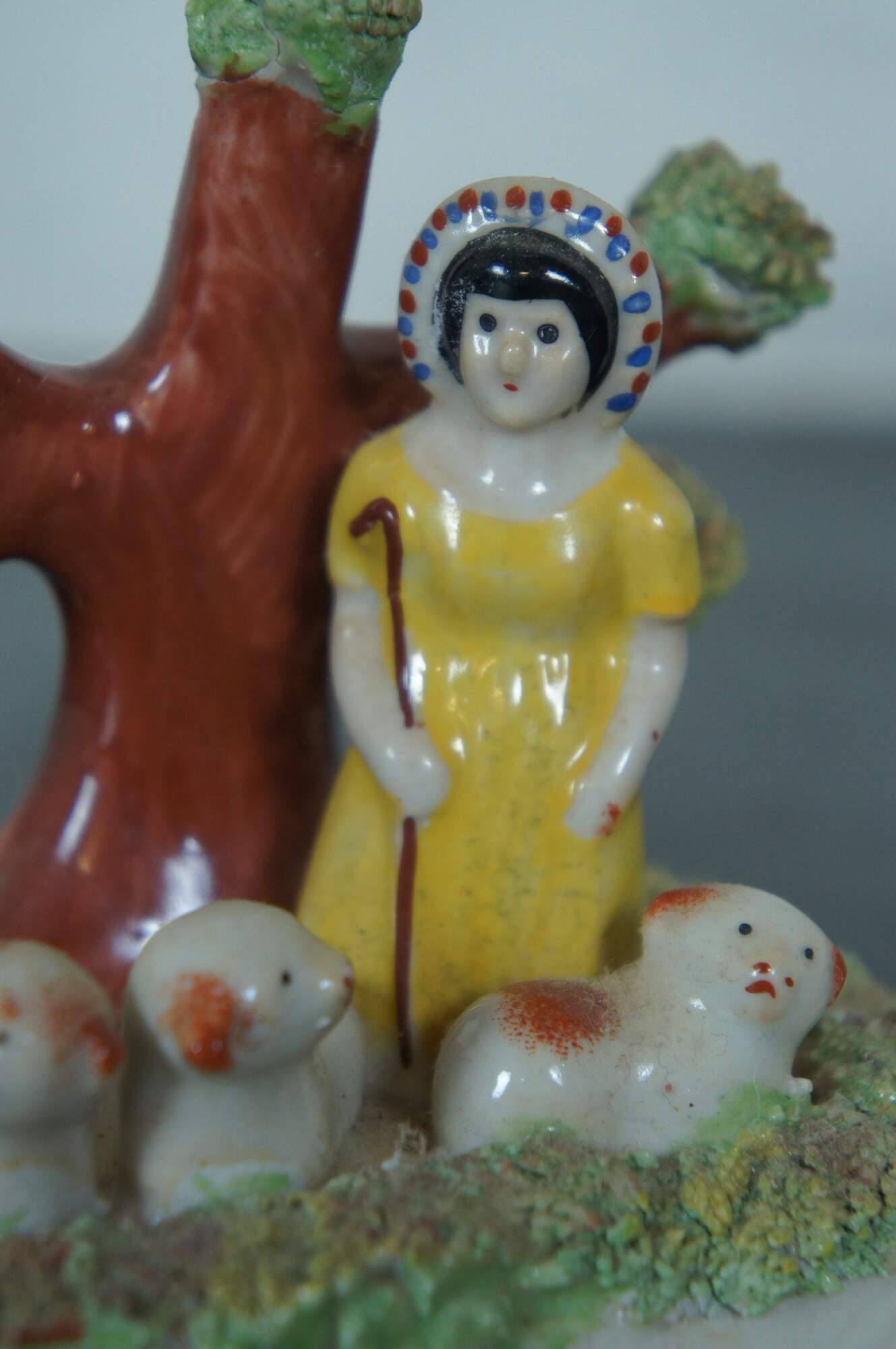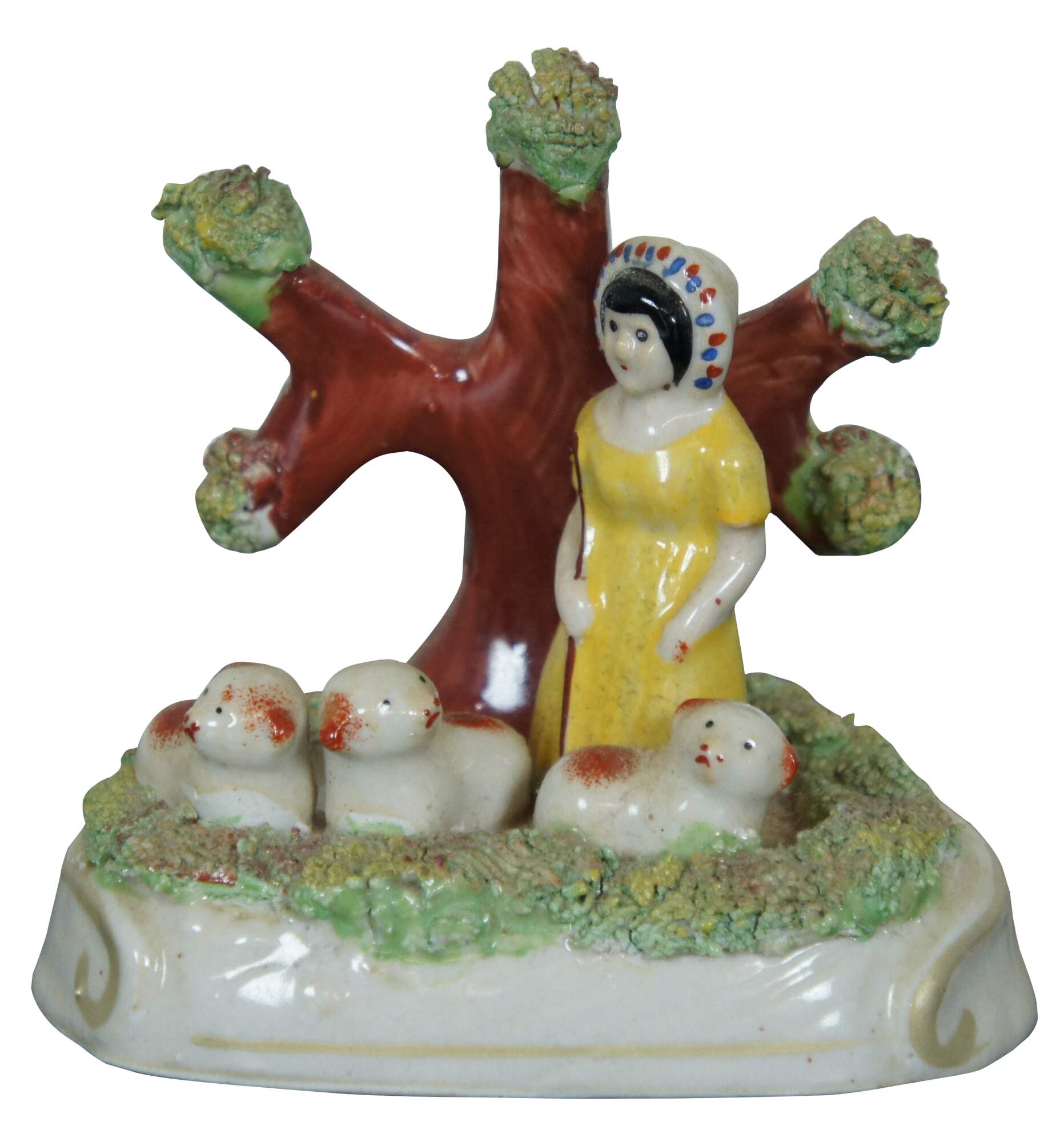Pair of antique early Staffordshire pearlware bocage figures, a shepherd and a shepherdess each standing in front of a tree with three red and white sheep / lambs. Each piece uses shredded clay to simulate grass and foliage. Attributed to the James Dudson factory at Stoke on Trent, circa 1830-1860.