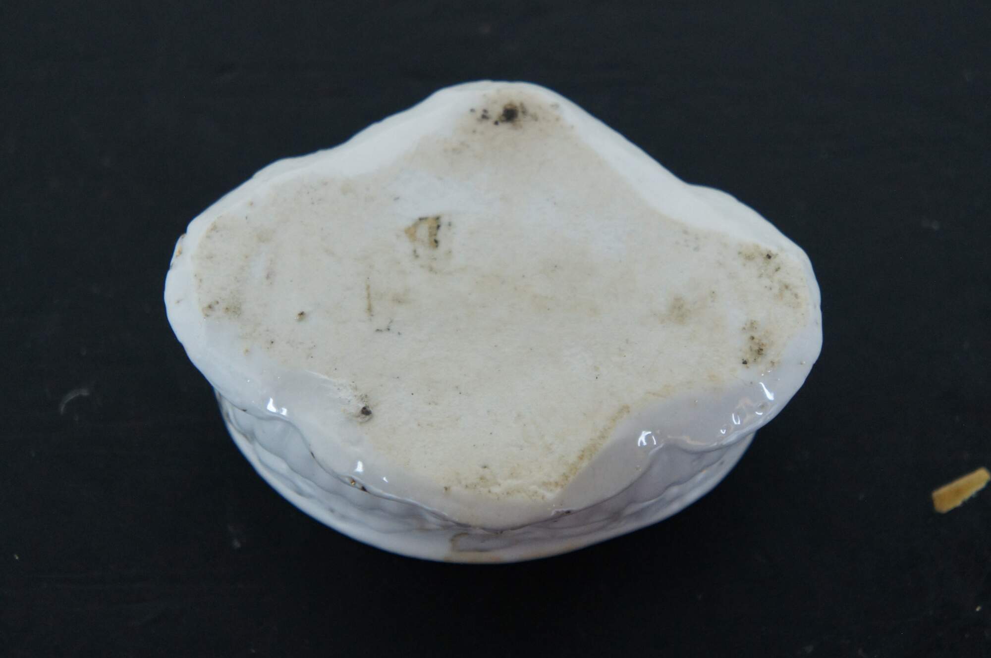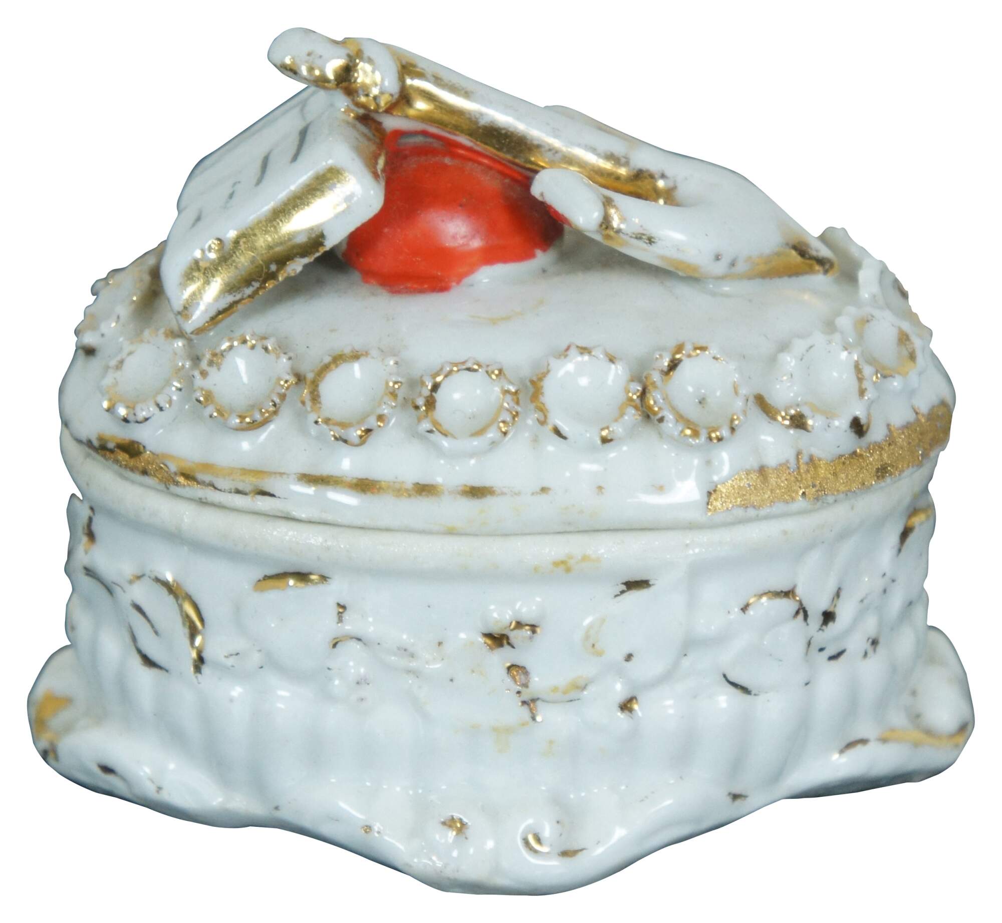 Antique Victorian Conta Boehme porcelain martime keepsake trinket box, oval shaped with ornate details and topped with flowers, an anchor, book and red object.“Fairings, which are small porcelain groups of gaily colored animal and human china figures, were given away as prizes or purchased at English fairs. Fairings were a popular fair souvenir during the middle of the Victorian era through 1915. Commemorative buildings and people, along with popular music and songs, inspired some of the fairings. Because beds were featured so prominently in many fairings, fairings often were referred to as “bedpieces.” Small trinket boxes were common souvenir items sold at fairs or seaside resorts. Staffordshire or other English potters did not make fairings. They were imported from Germany. Production of fairings ceased in 1914, resulting from tension associated with the coming of World War I.”
