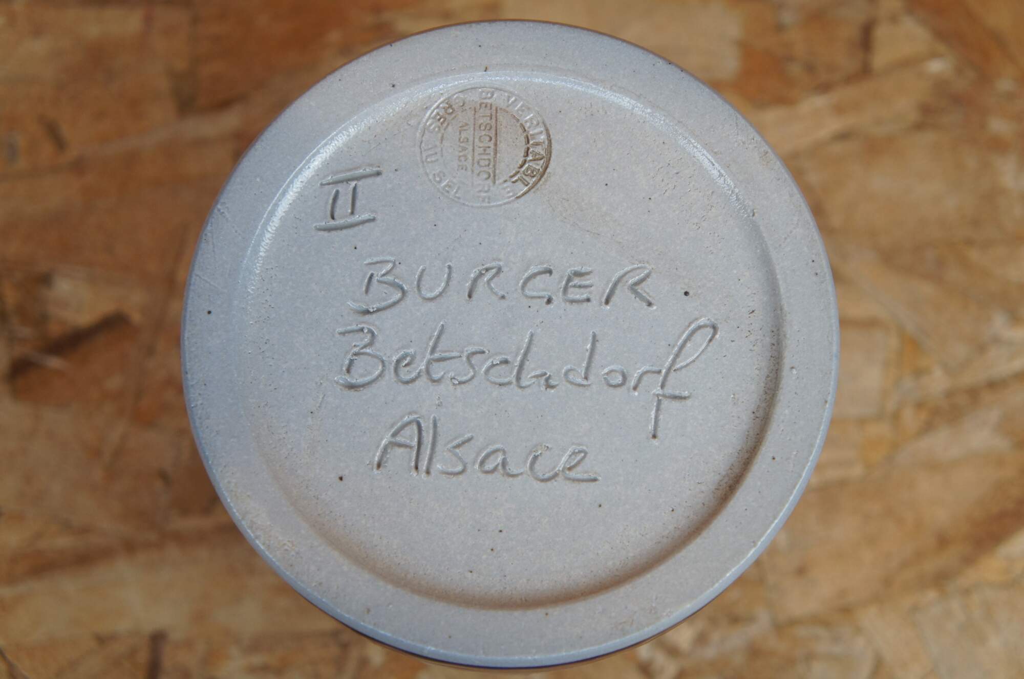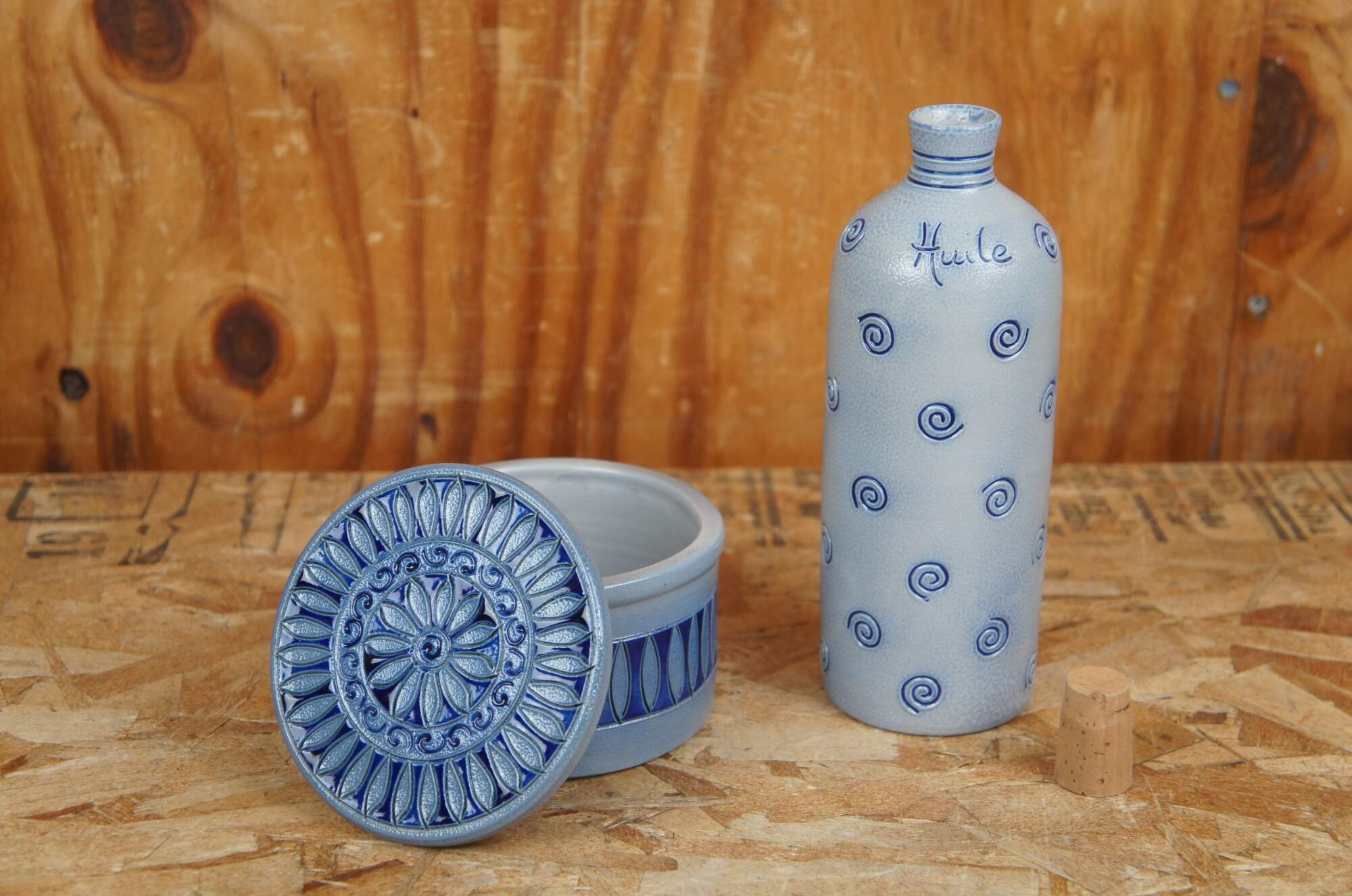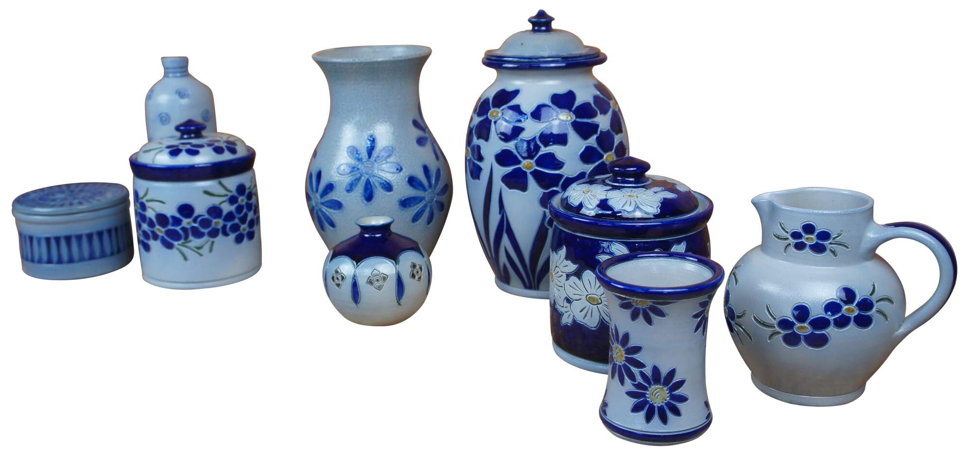 Vintage lot of French Betscdorf salt glaze pottery featuring floral motifs with cobalt blue accents. Includes 9 pieces: pitcher / creamer, jars, bud vases, a few with lids, one cork stopper.