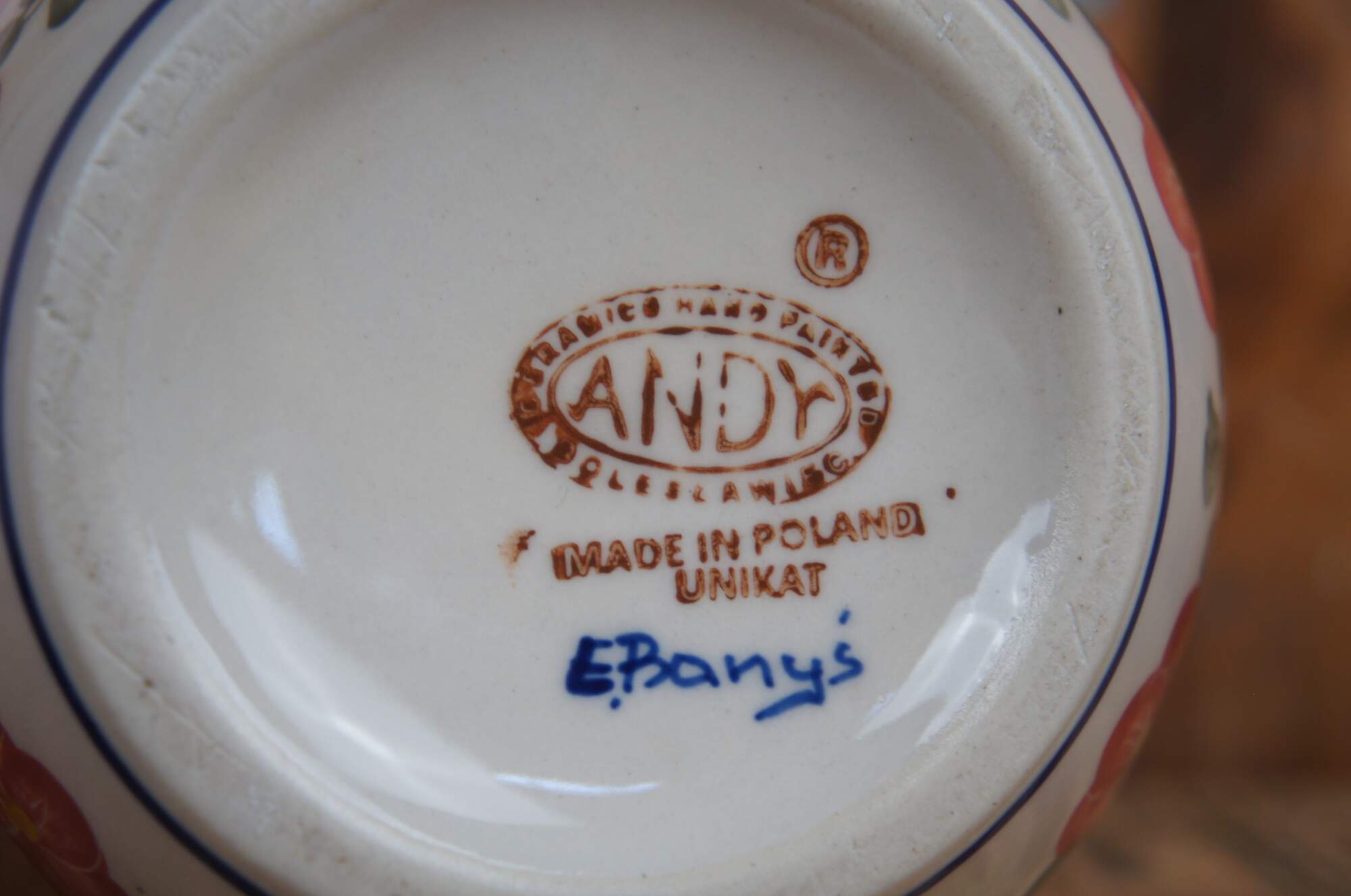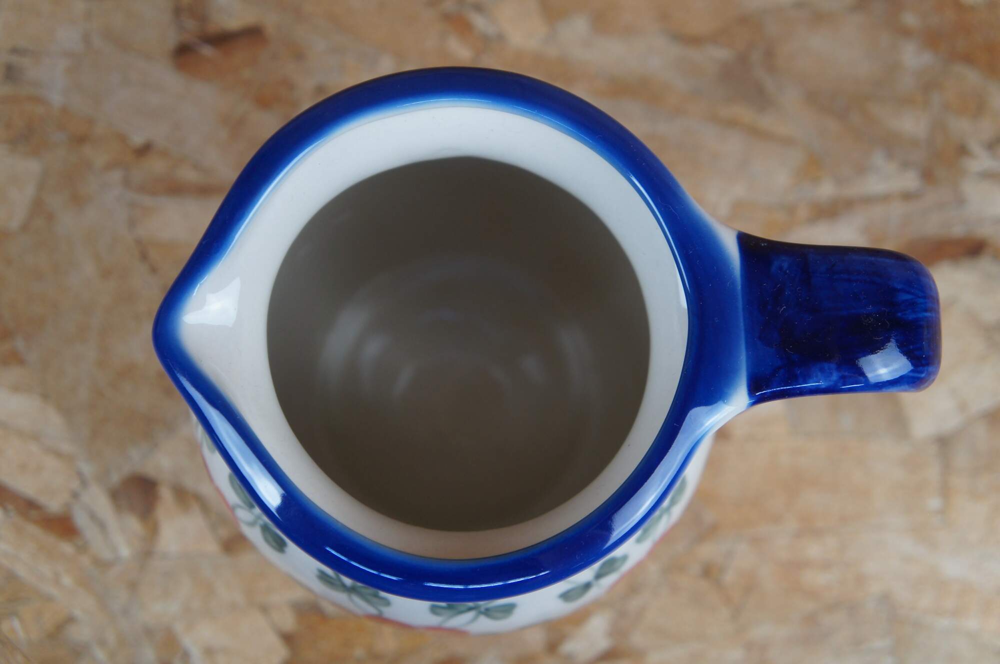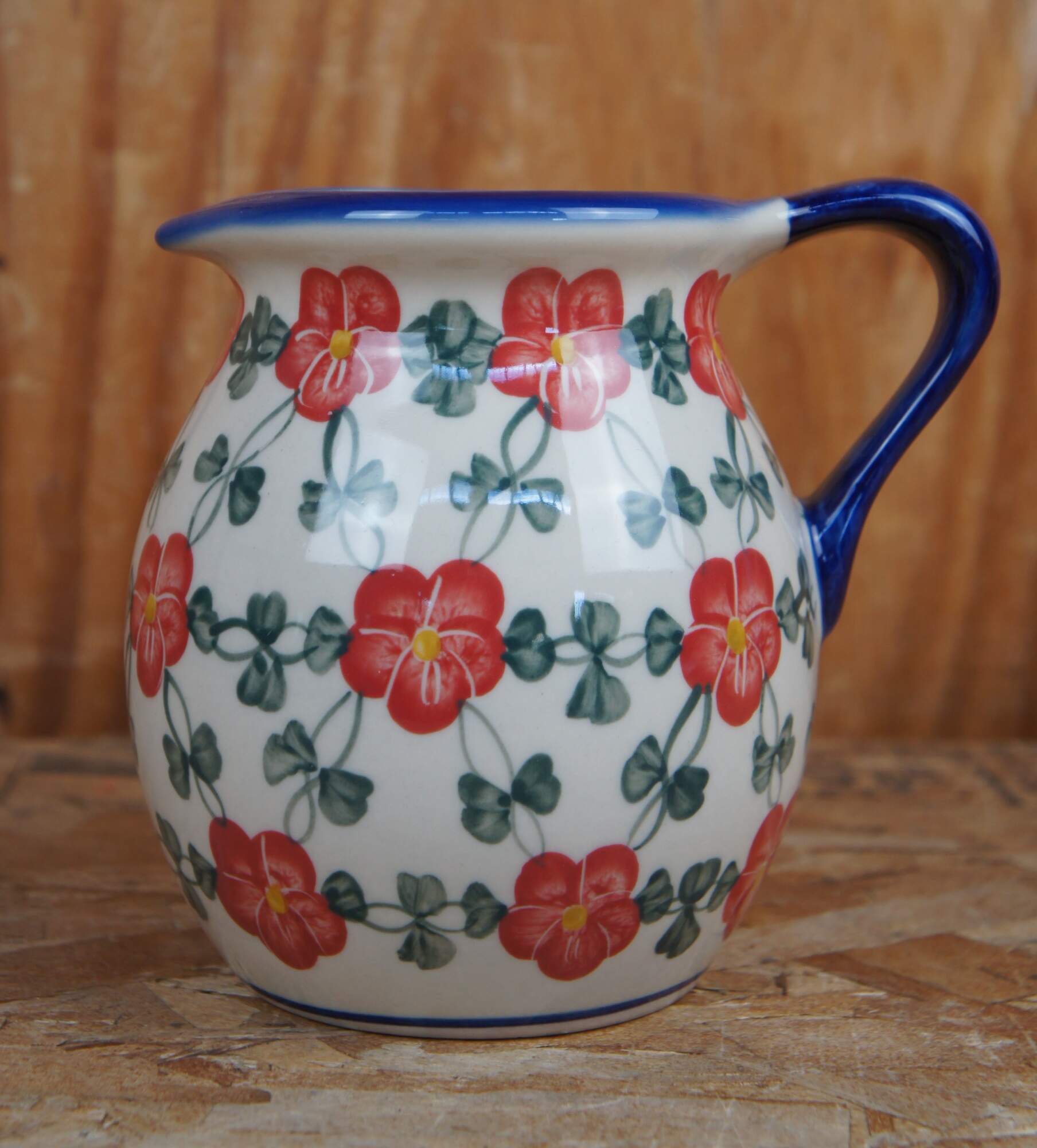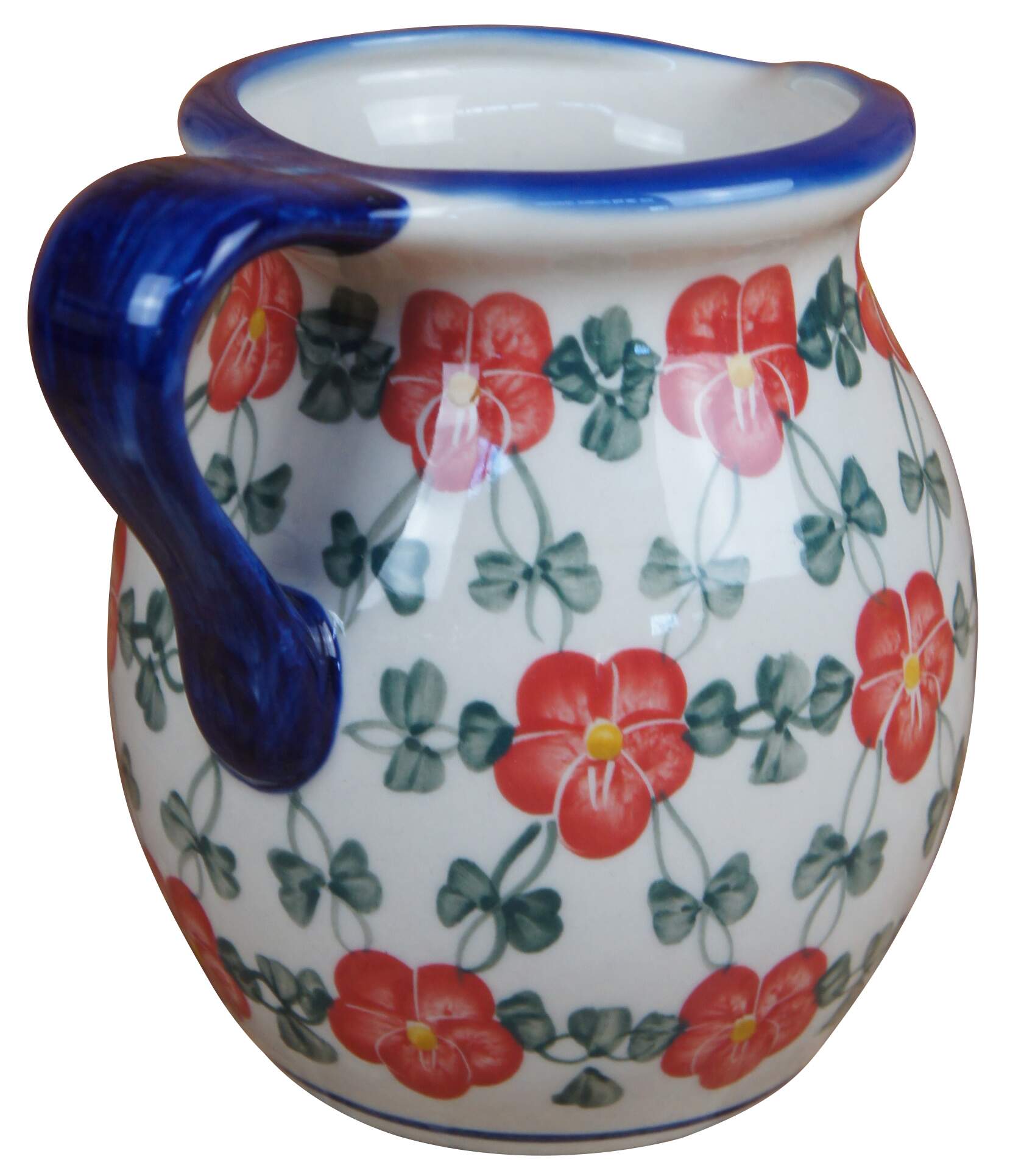 Stonewarepitcher featuring red flowers with cobalt blue trim made by Unikat in Poland.