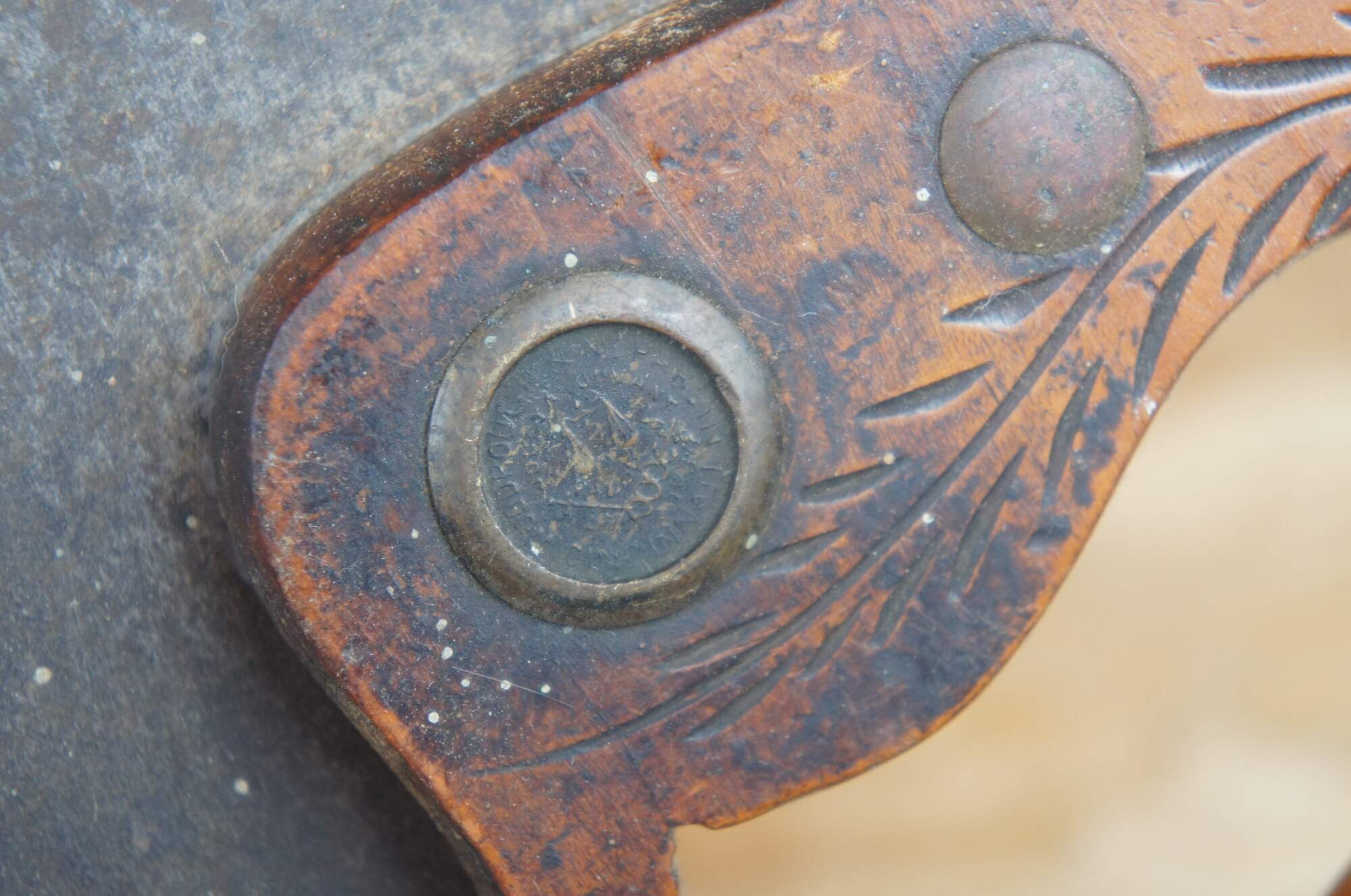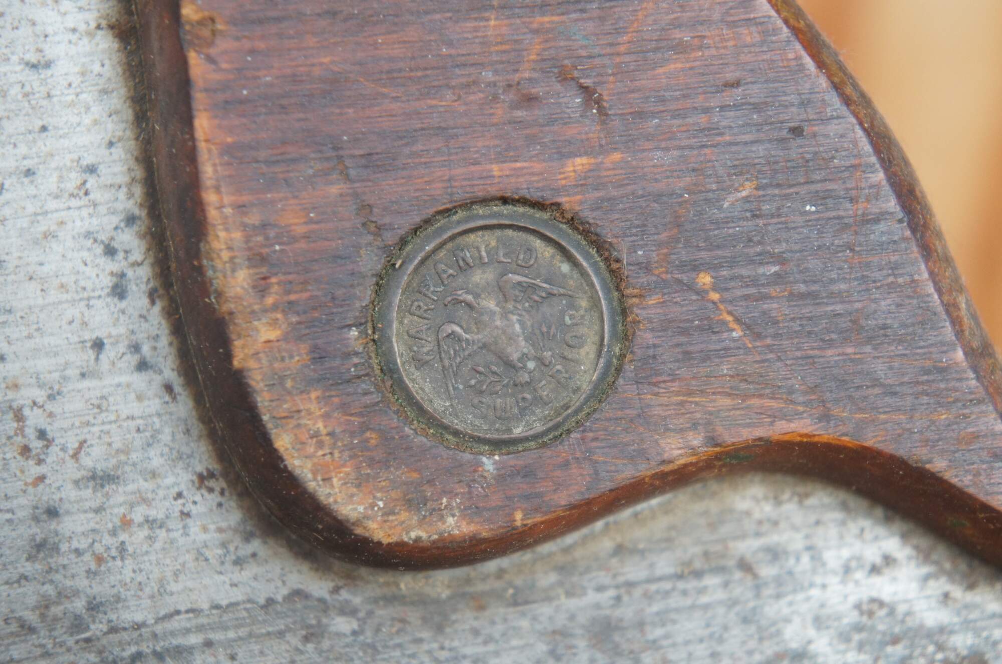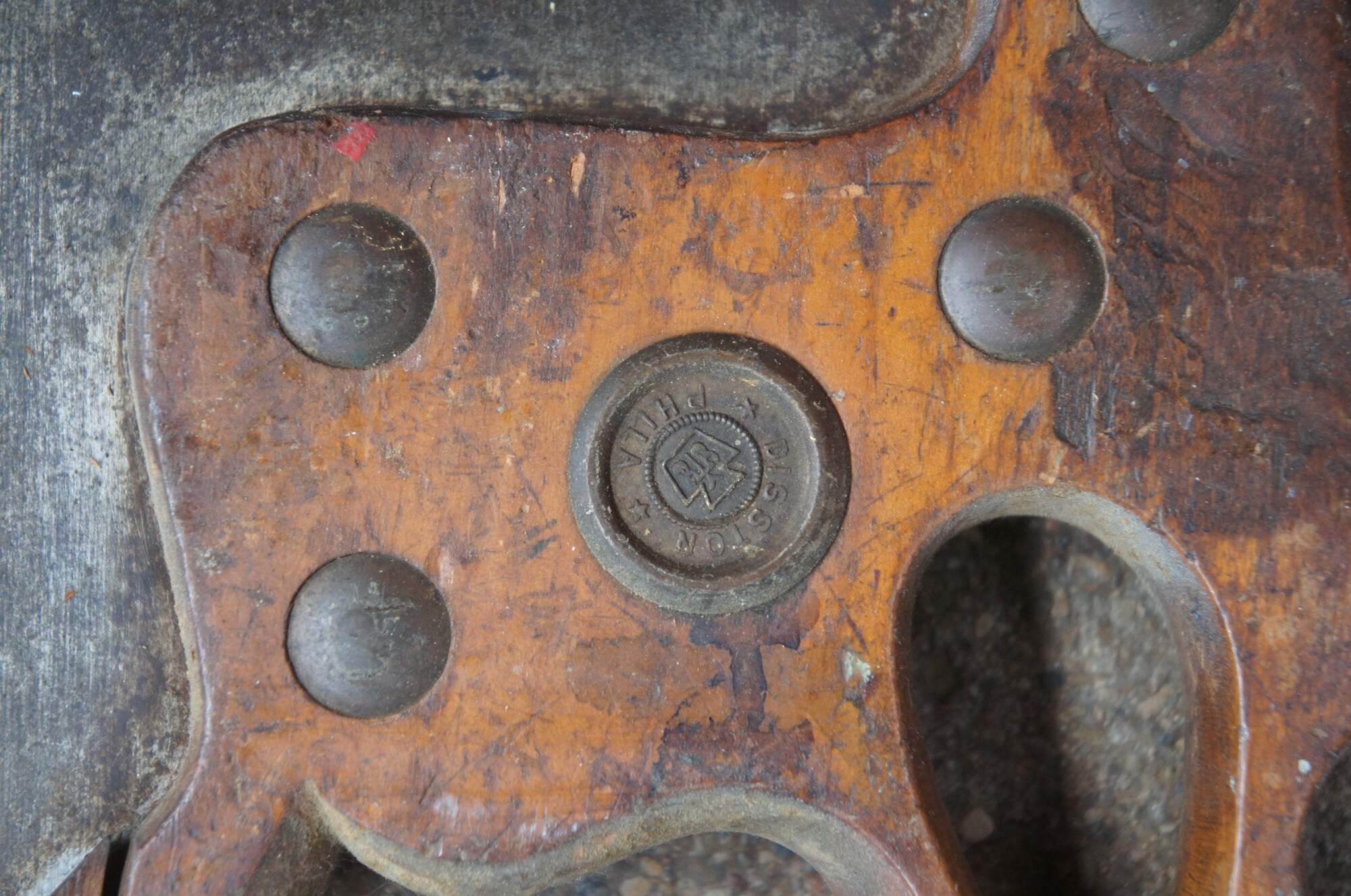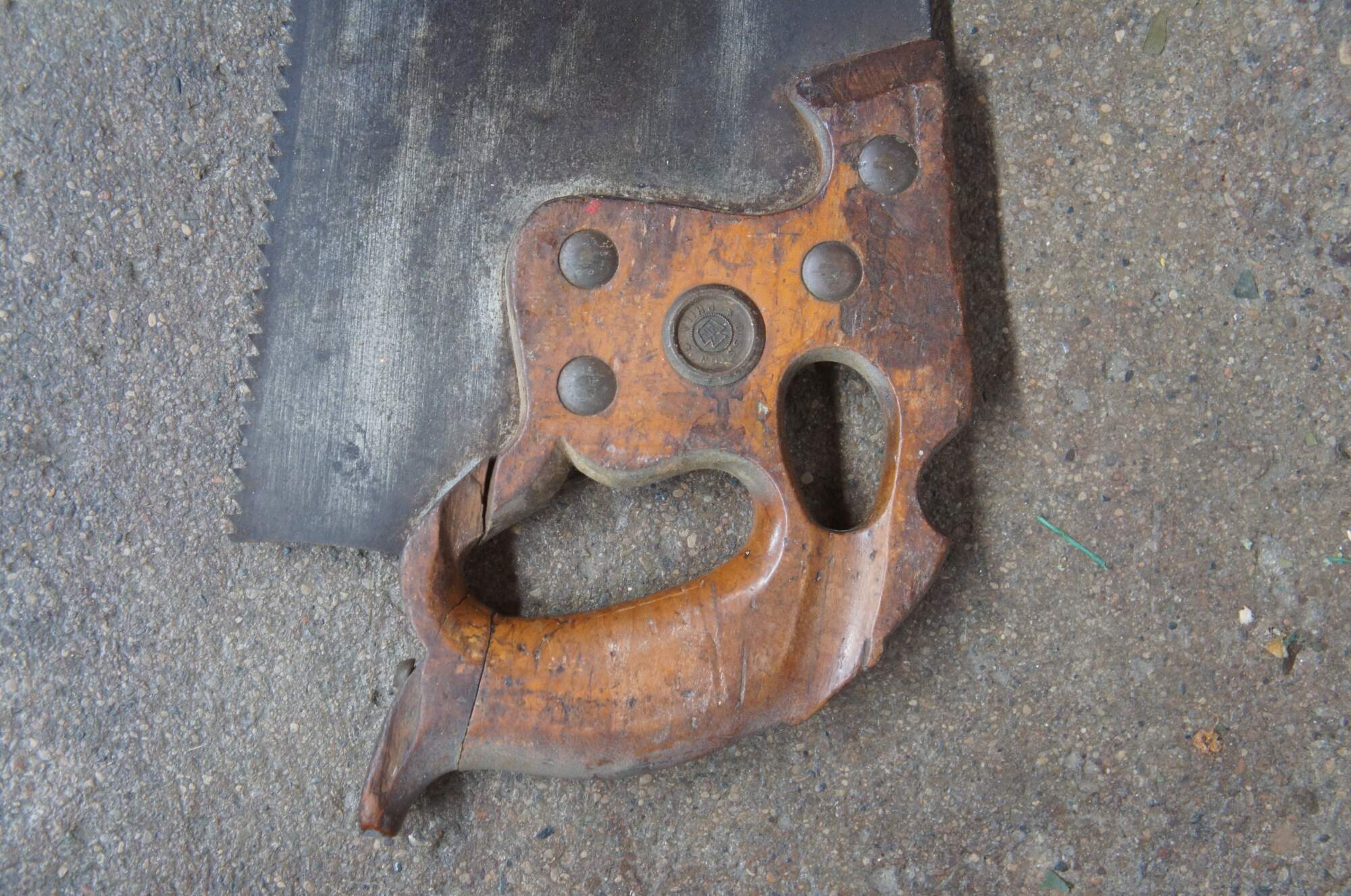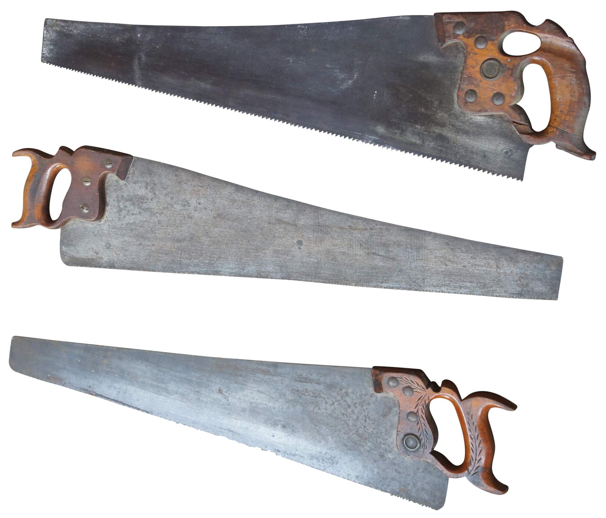 3 vintage hand saws marked Disston, warranted superior featuring wood handles and thumb holes.