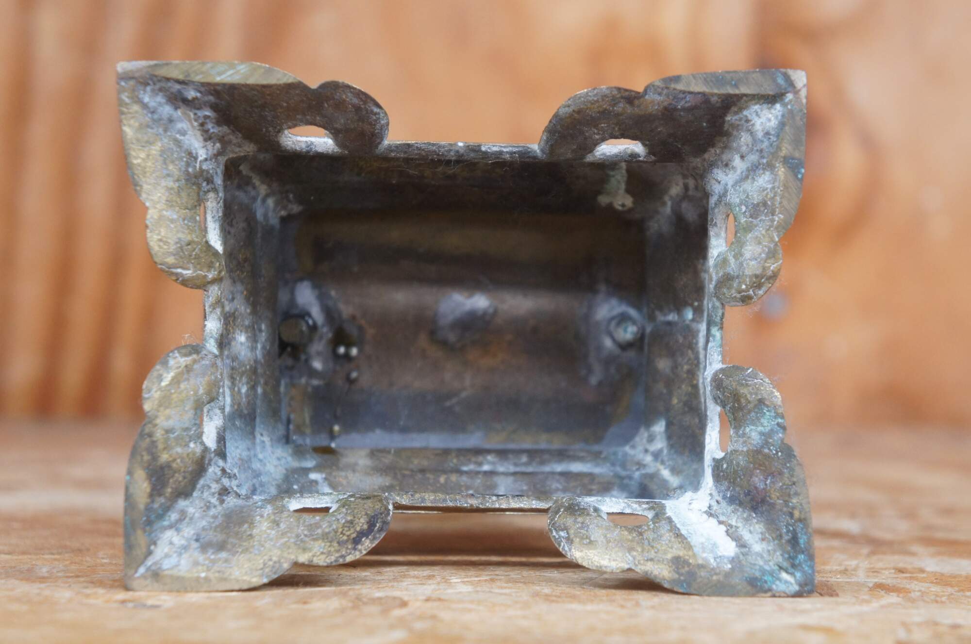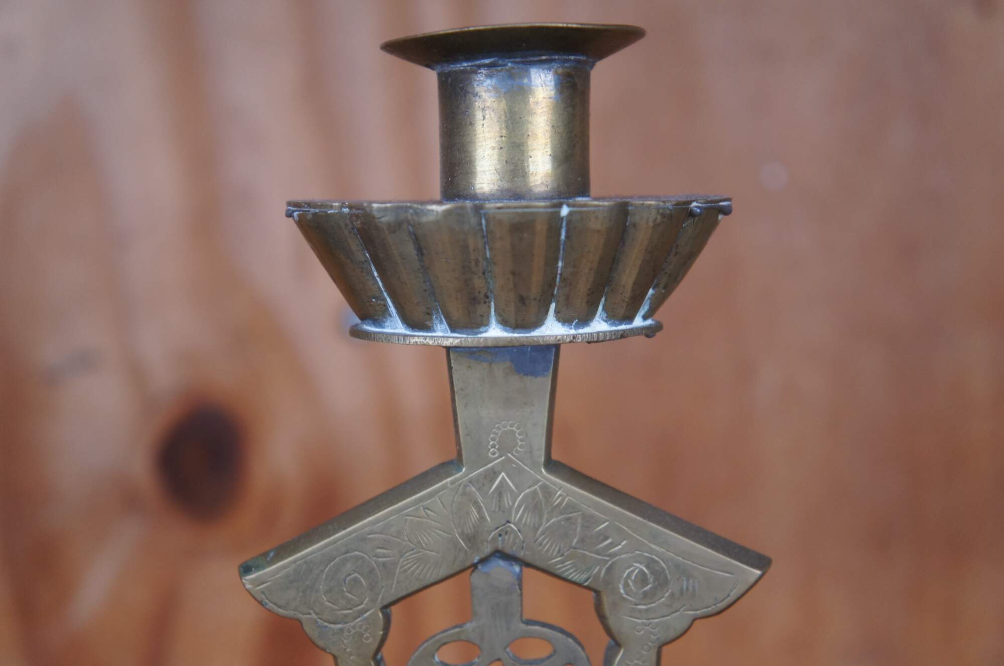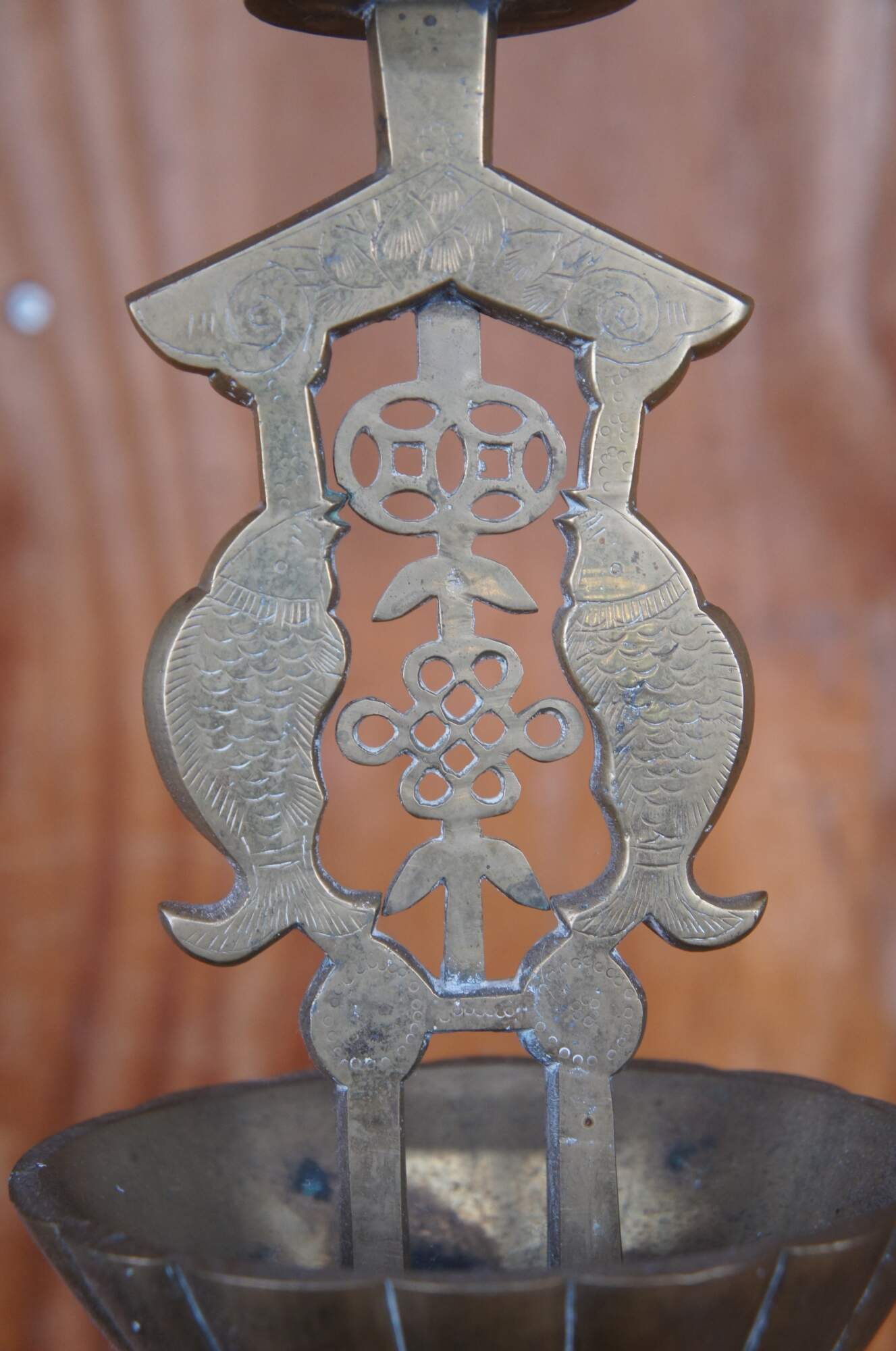 Two vintage Korean brass candlestick holders decorated with birds, fish, gems and wax catchers.