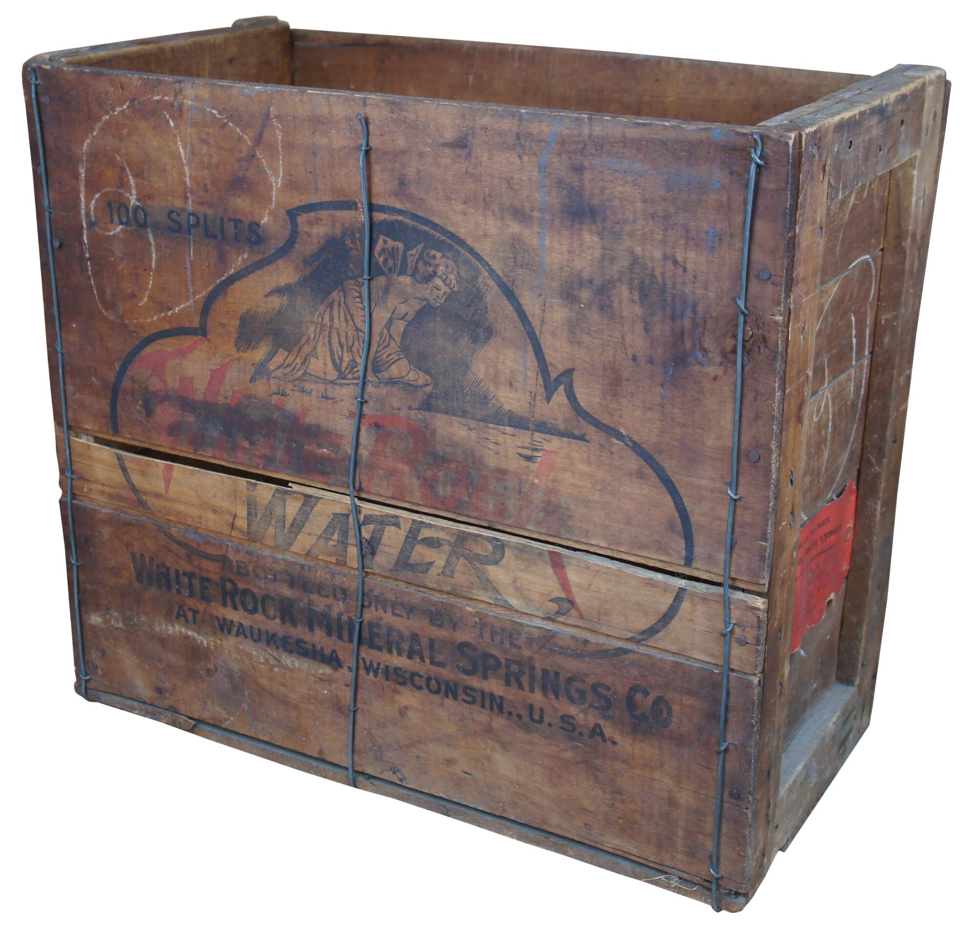 Large antique wire lined wooden bottle crate marked with White Rock Mineral Springs Co from Waukesha Wisconsin. 100 Splits.