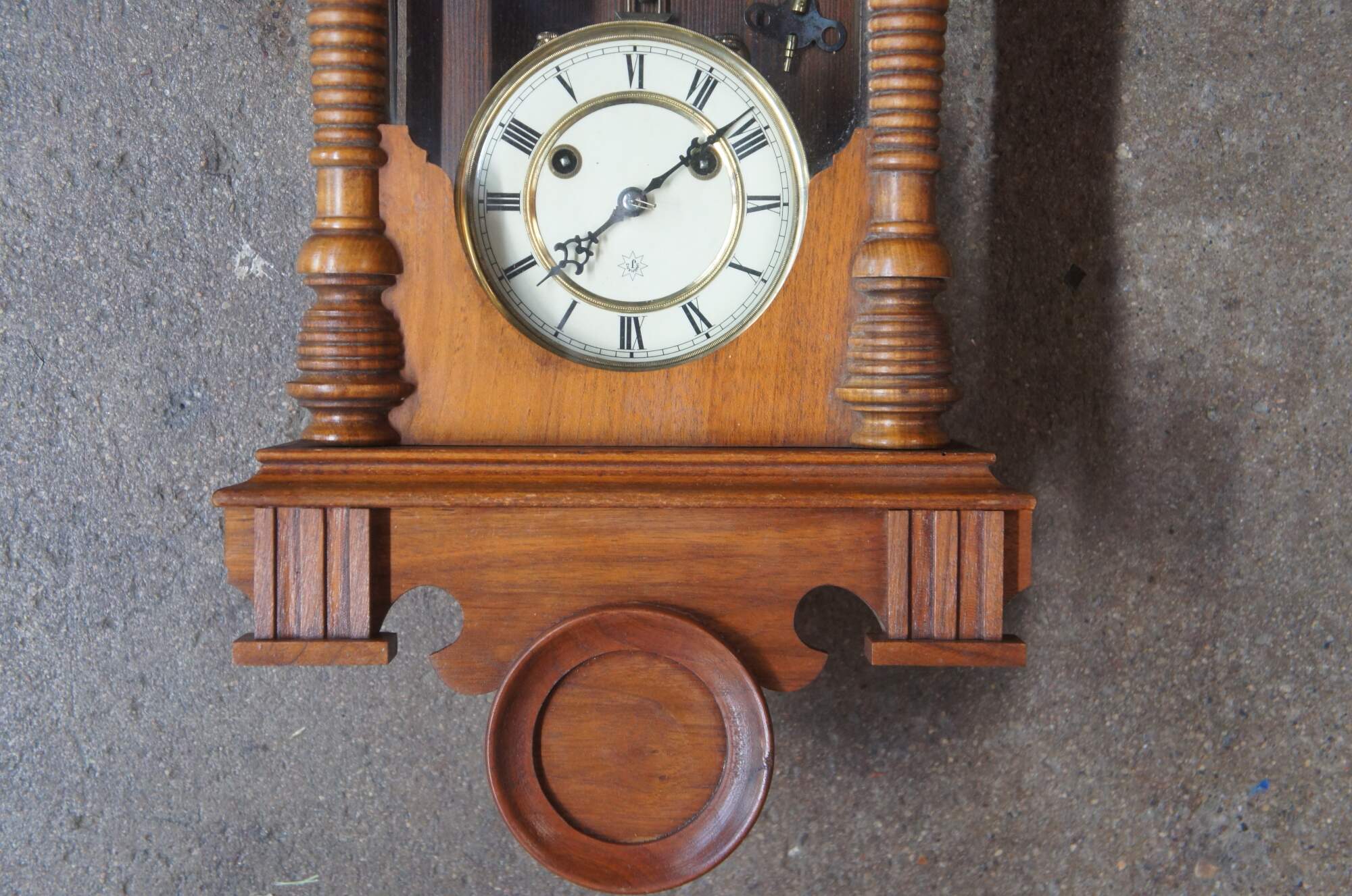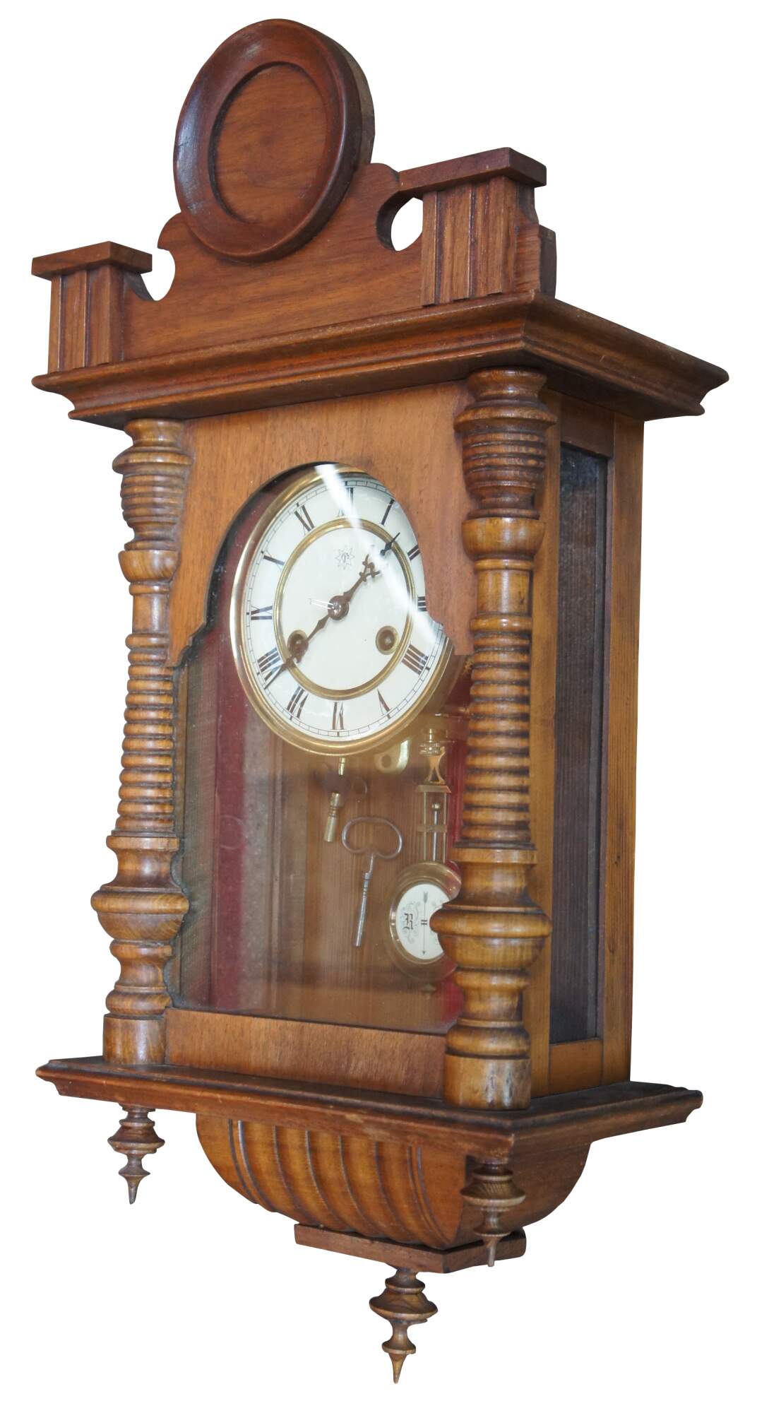 Antique German wall mounted Vienna Regulator clock by Junghans in a walnut case with ribbed / turned accents, drop finials, serpentine and circular crown and roman number face accented with brass.