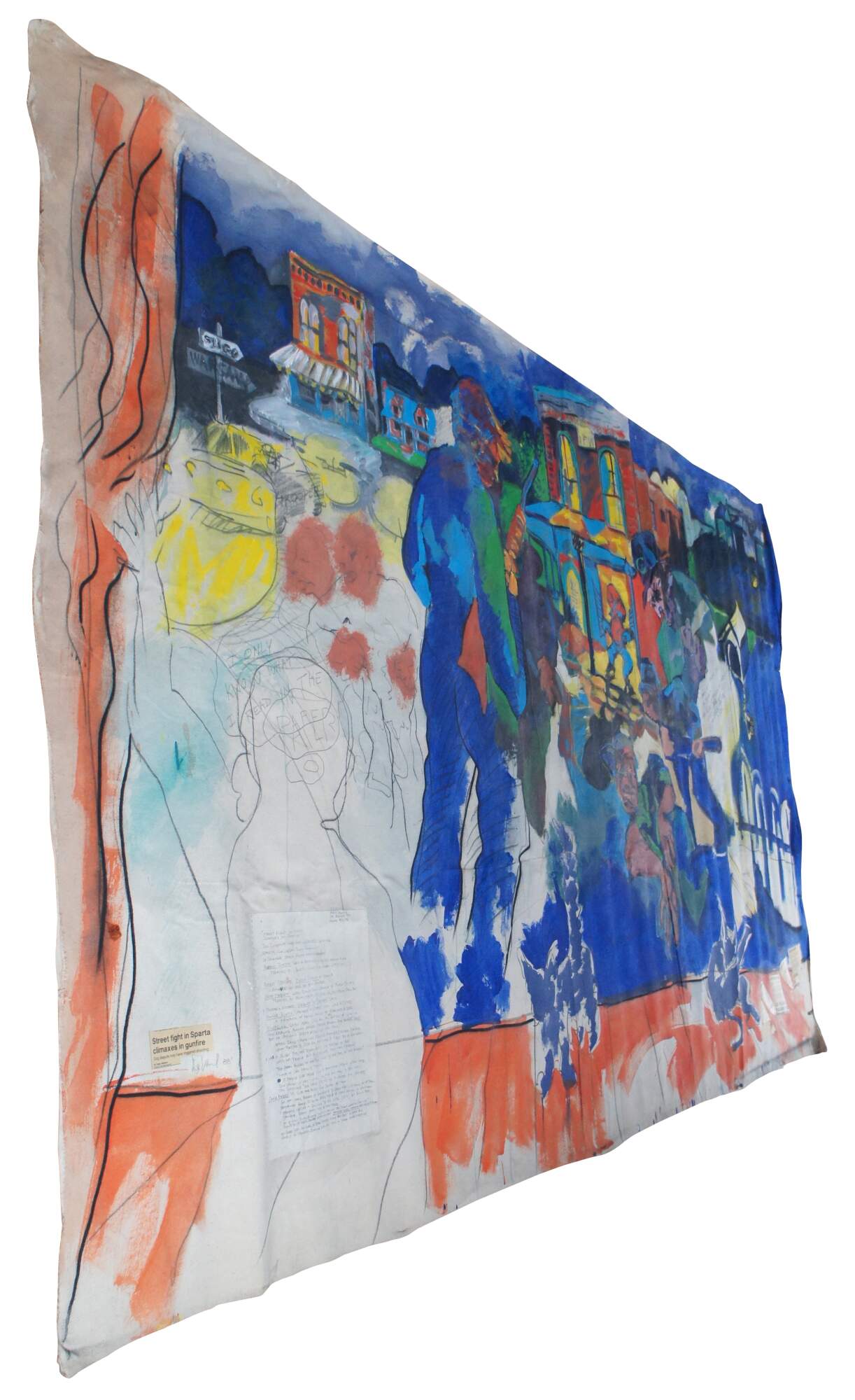 Vintage 1988 David Devaul mixed media expressionist artwork depicting a gunfight in Sparta Kentucky that triggered from a dog dispute. The mural features vibrant abstract acrylic and mixed media.