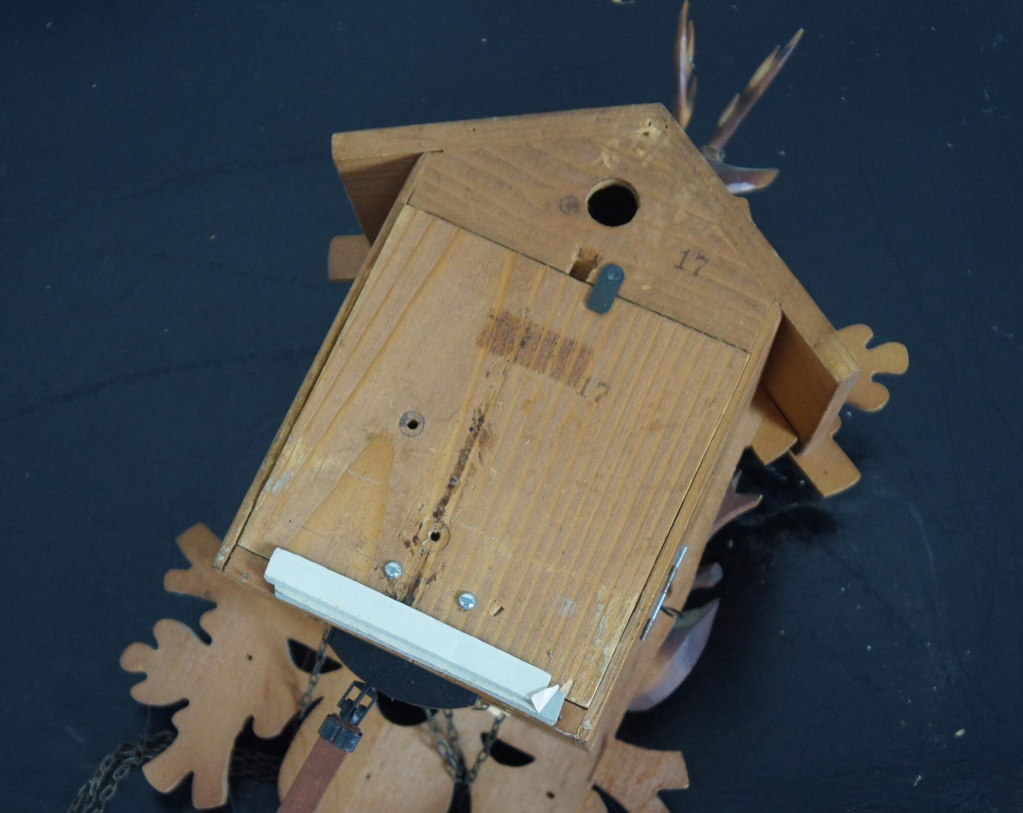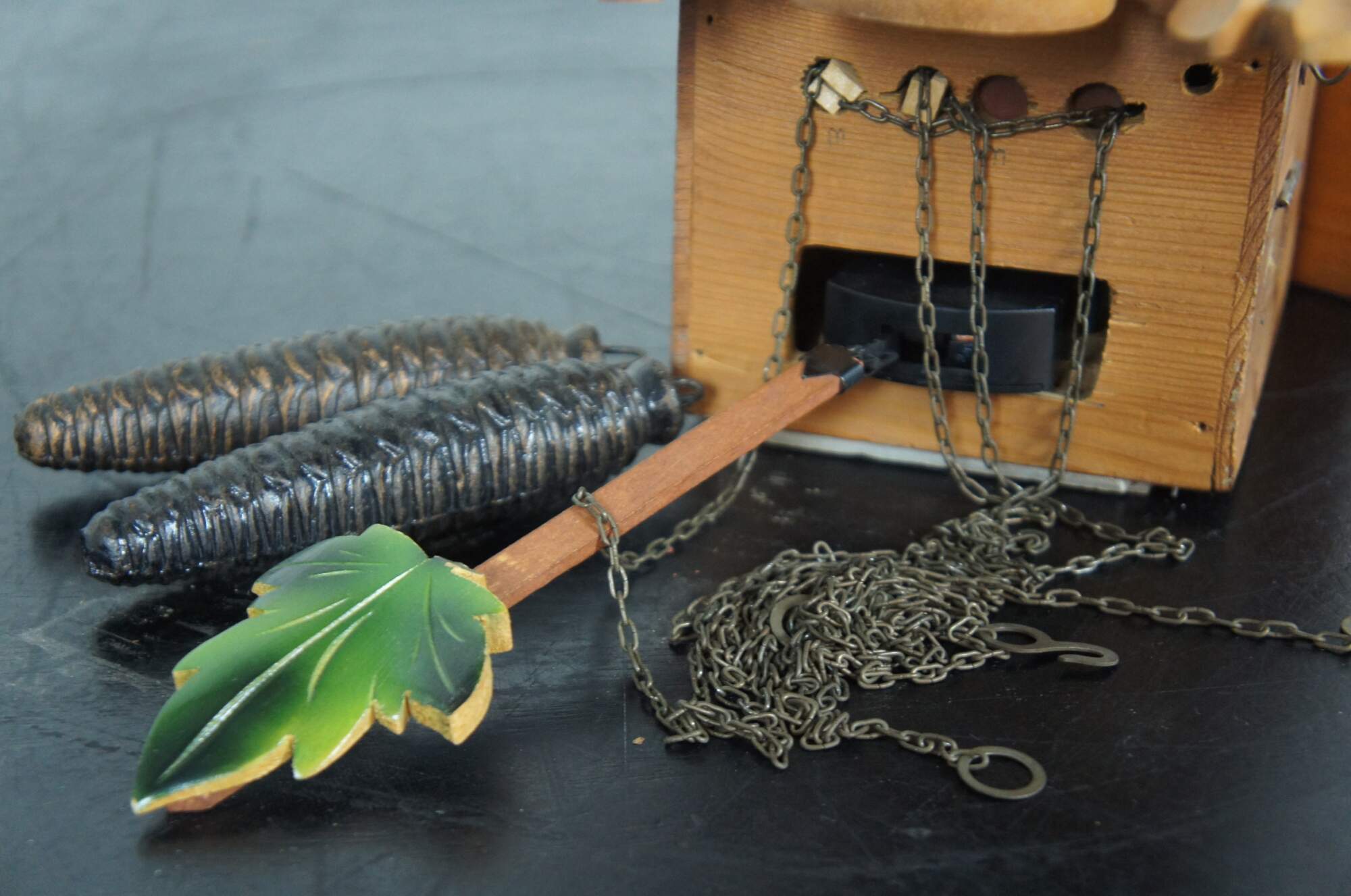Vintage German Black Forest cuckoo clock with a colorful hunting motif featuring a game bag, leaf pendulum, rabbit, birds, leaves, and a deer head. No cuckoo bird in door, only a bell chime. Works and pendulum are battery operated. Includes two pine cone shaped weights. May have been modified from mechanical works to current battery operation.