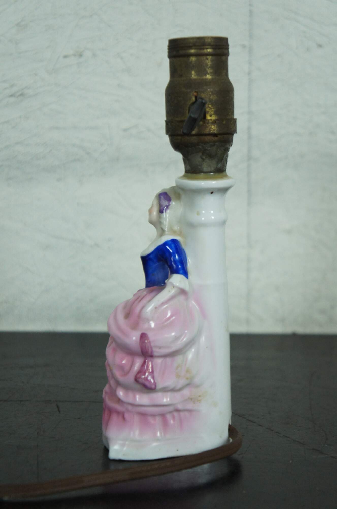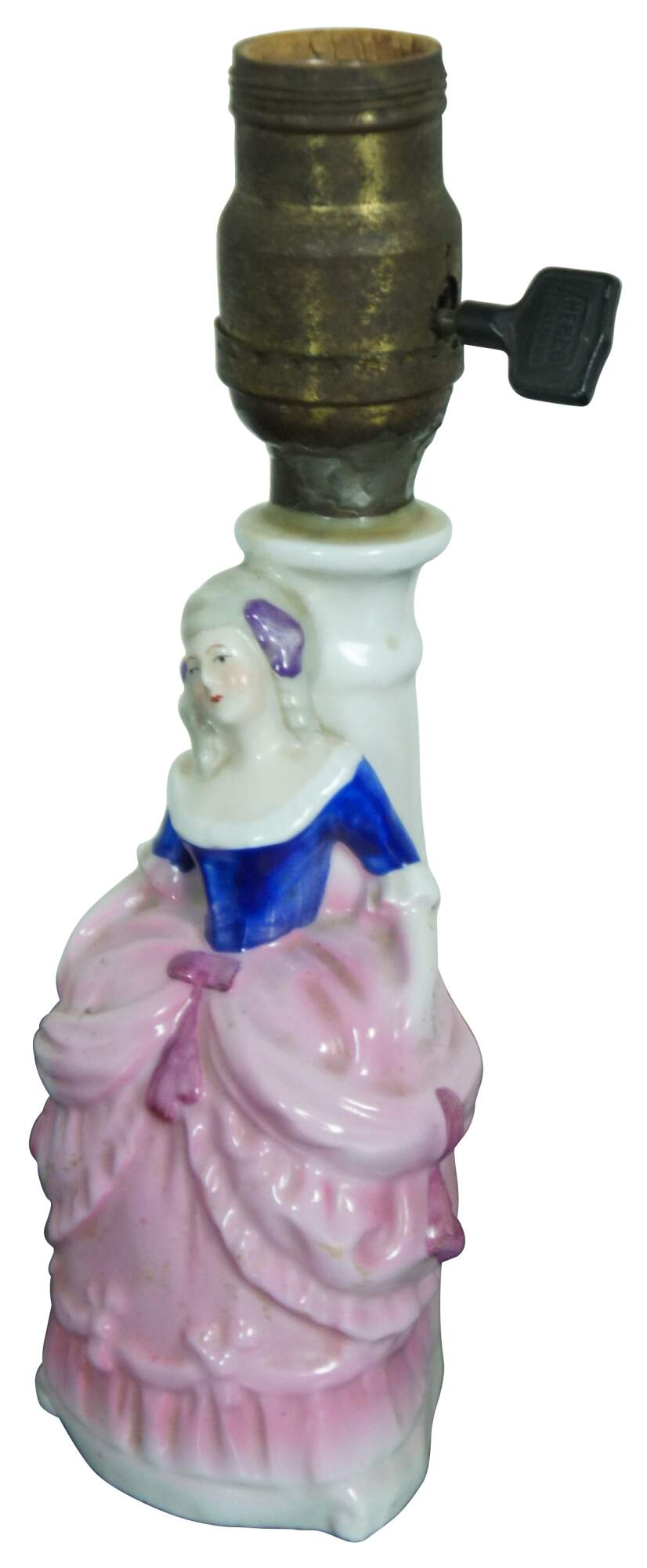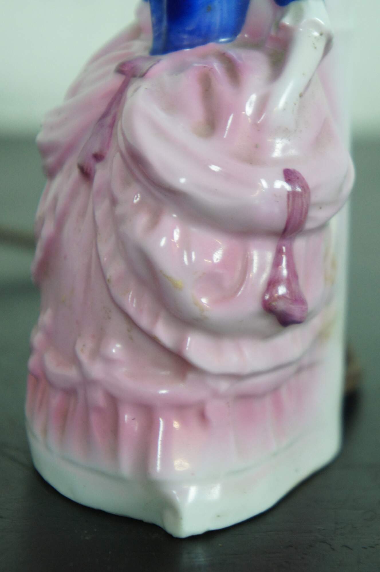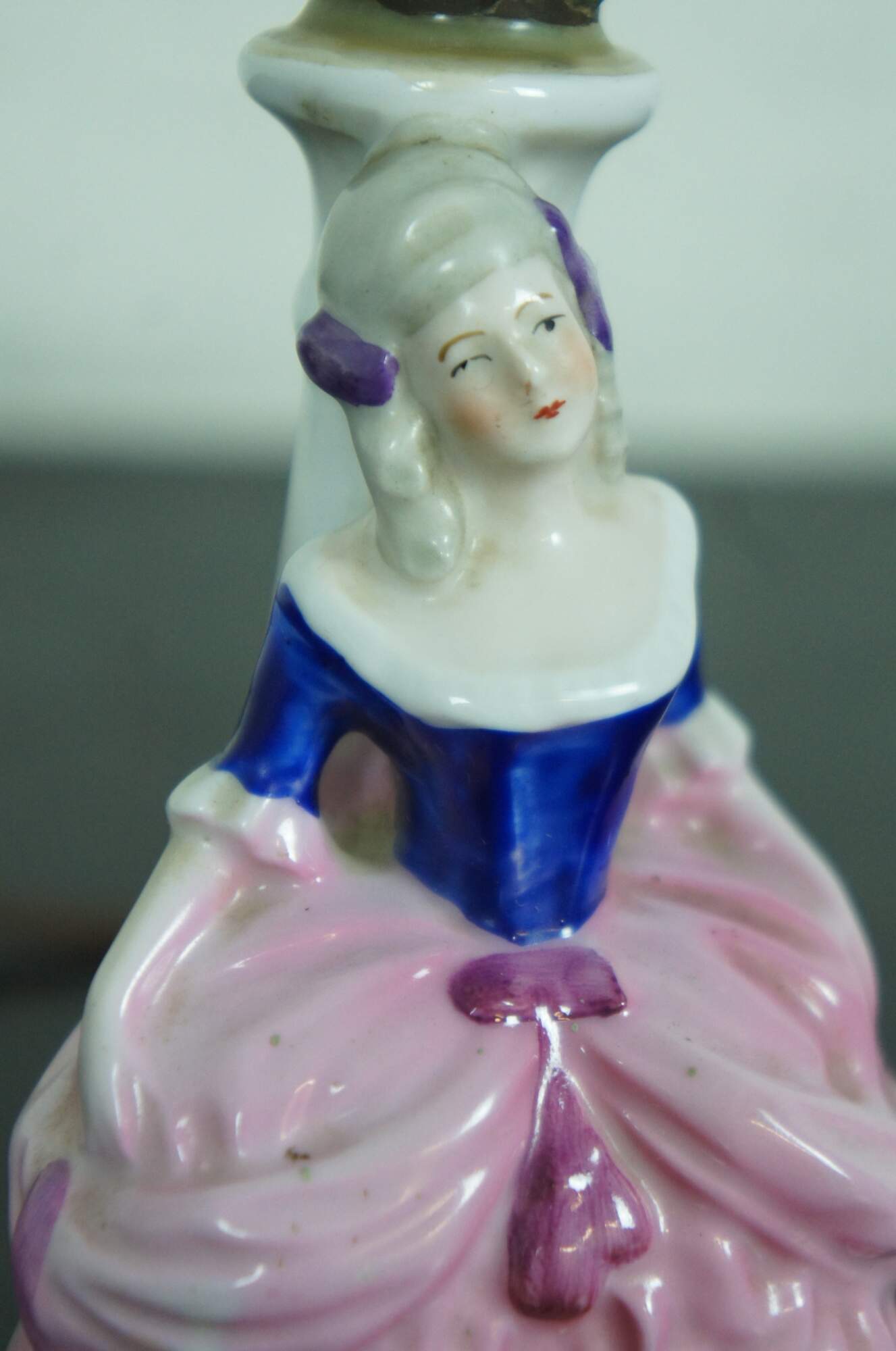 Antique circa 1930s German porcelain budoir lamp marked with the number 6050, in the shape of a female figure in a blue and pink 18th century dress.