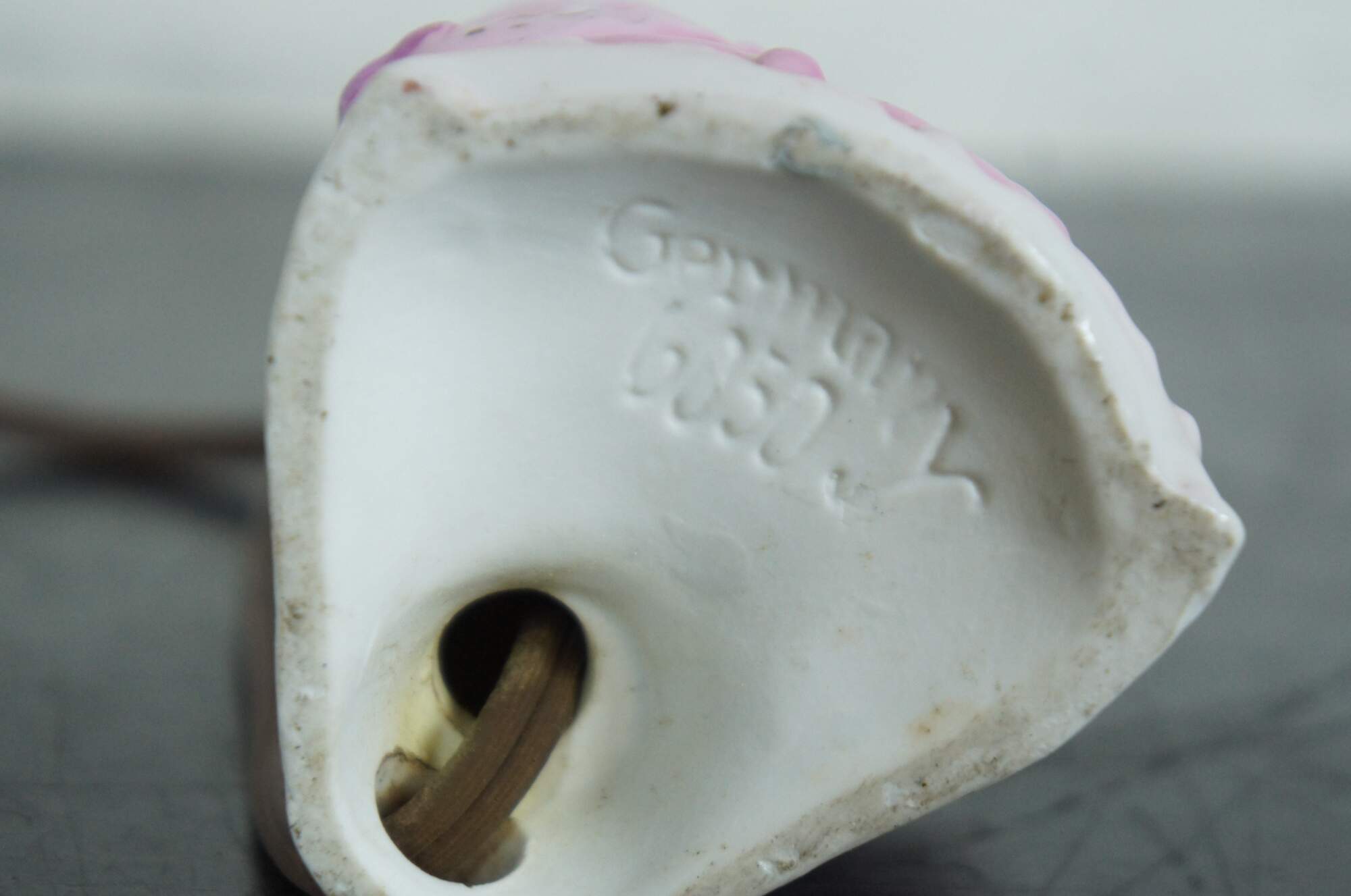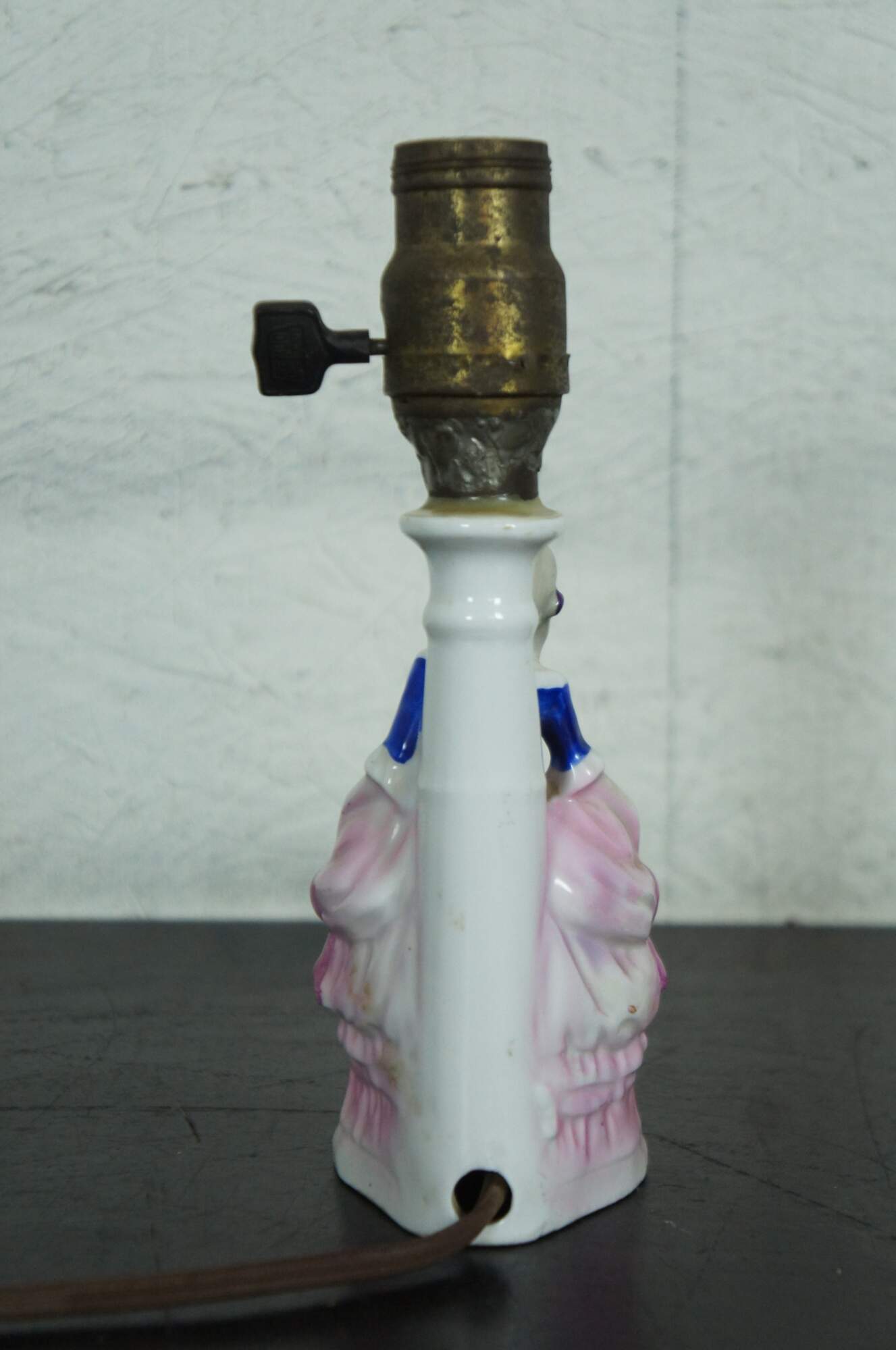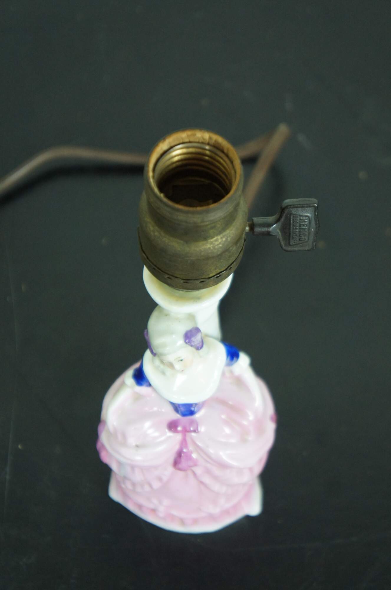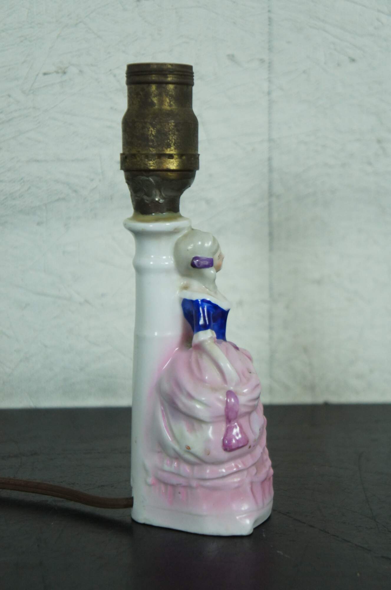 Antique circa 1930s German porcelain budoir lamp marked with the number 6050, in the shape of a female figure in a blue and pink 18th century dress.