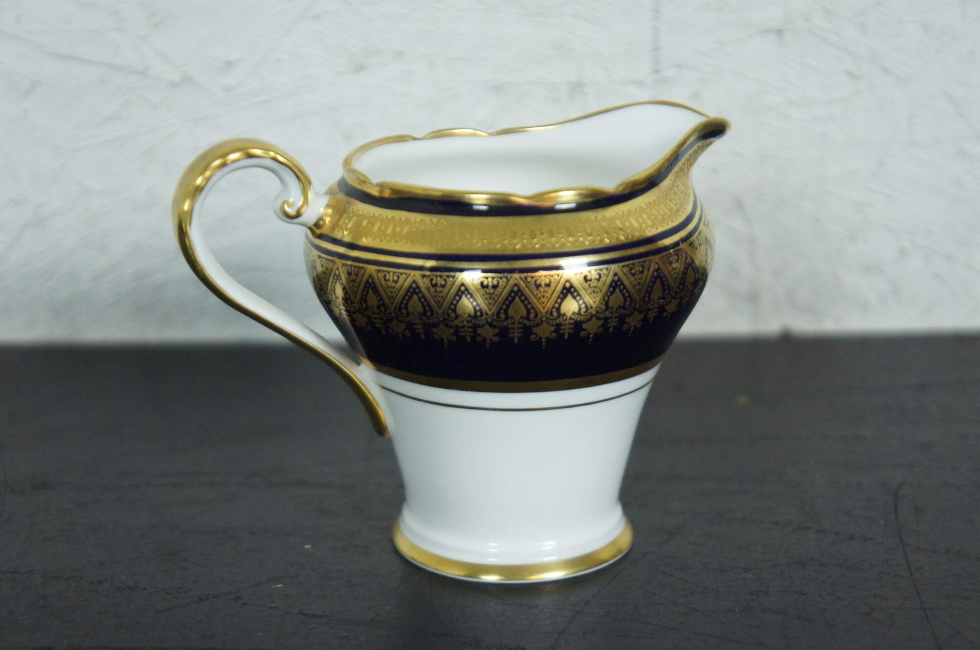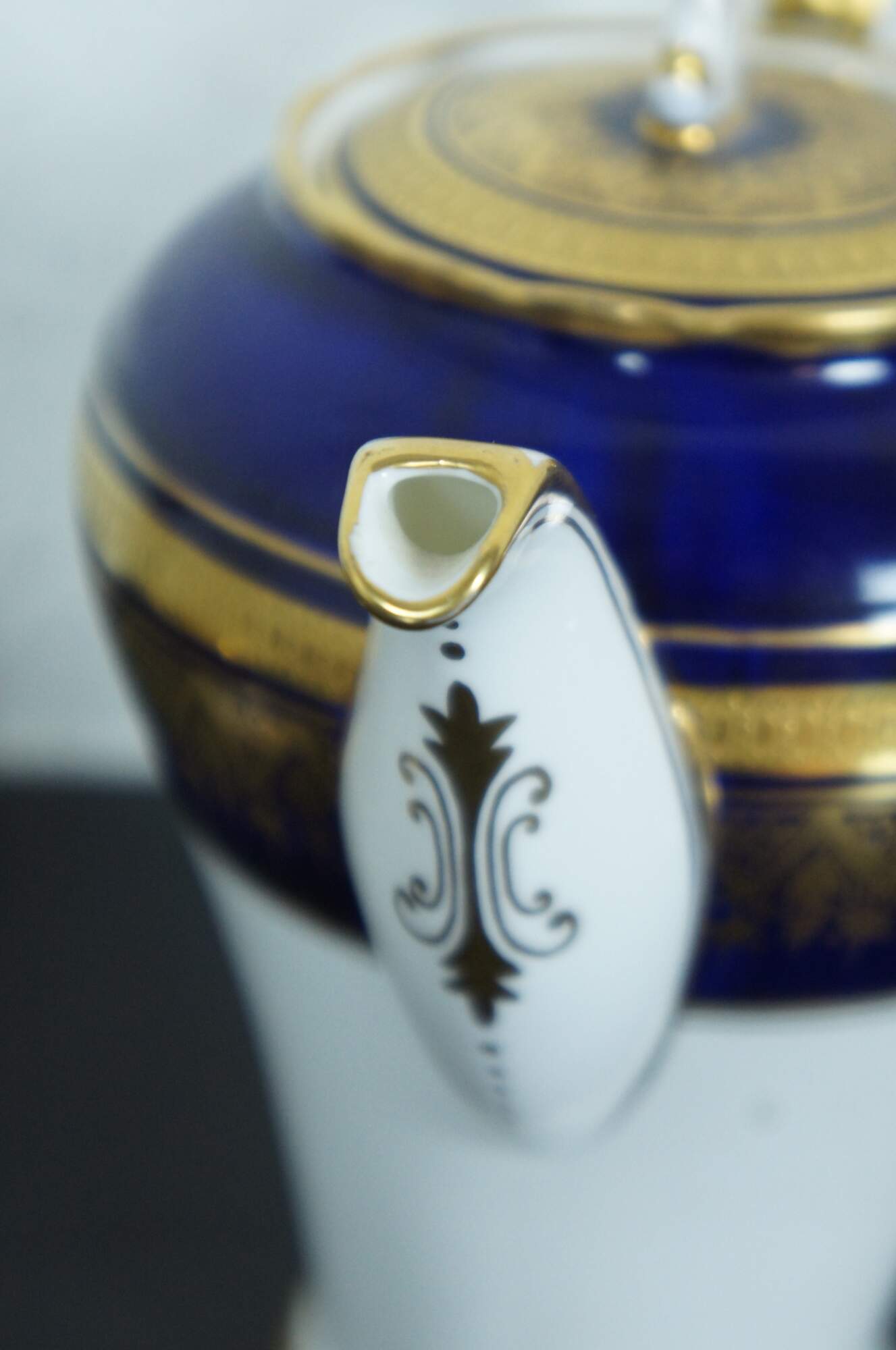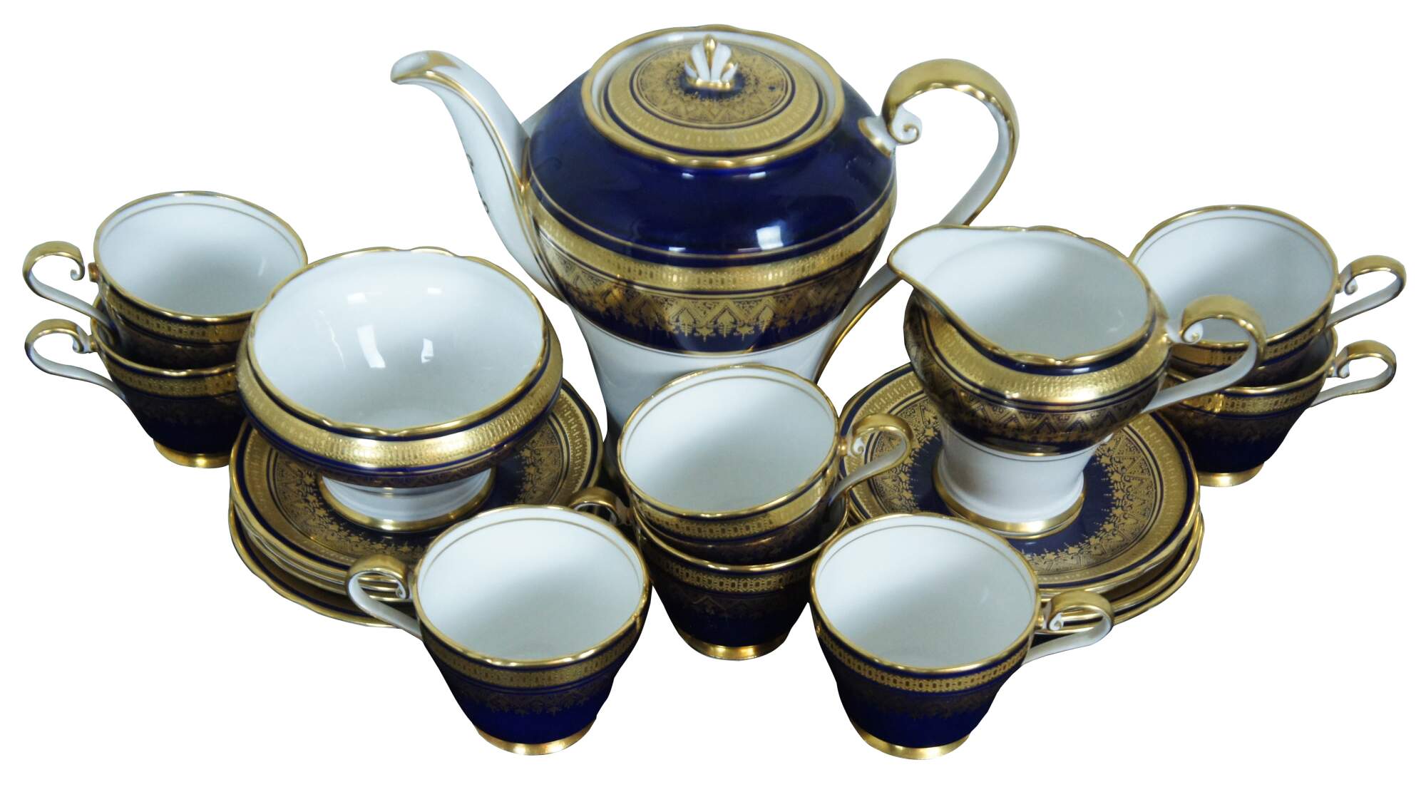 Vintage twenty piece John Aynsley bone china demitasse tea or coffe set in the Simcoe pattern number 7410, featuring an orante design encrusted in gold over cobalt blue and slightly scalloped edges. “Aynsley China Ltd. was a British manufacturer of bone china tableware, giftware and commemorative items. The company was founded in 1775 by John Aynsley in Lane End, Longton, Staffordshire. In 1861 his grandson John Aynsley built the historic Portland Works on Sutherland Road, Longton, Staffordshire.[4] The company's profitability made it a desirable acquisition. In June 1970 Spode put in a bid, this was then topped in July by Denbyware. Discussions then followed with Waterford Glass and a £1 million bid was agreed. In 1970 John Aynsley and Sons was taken over by Waterford and renamed Aynsley China Ltd. In 1987 Waterford sold the company in order to focus the group's fine china sales on the worldwide Wedgwood brand.[5]