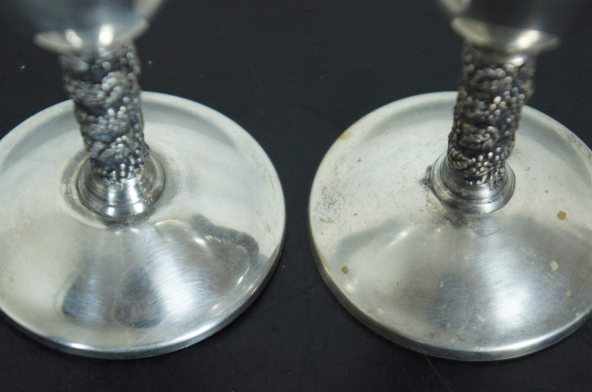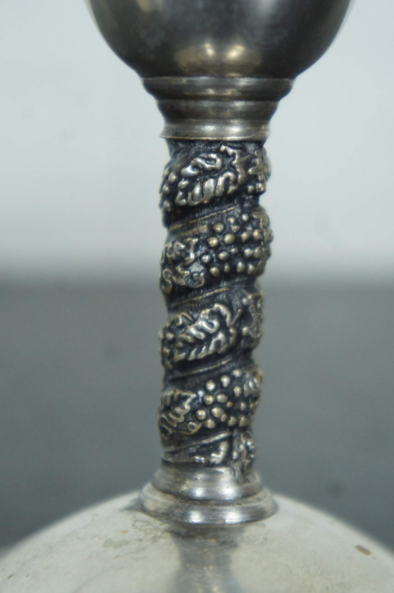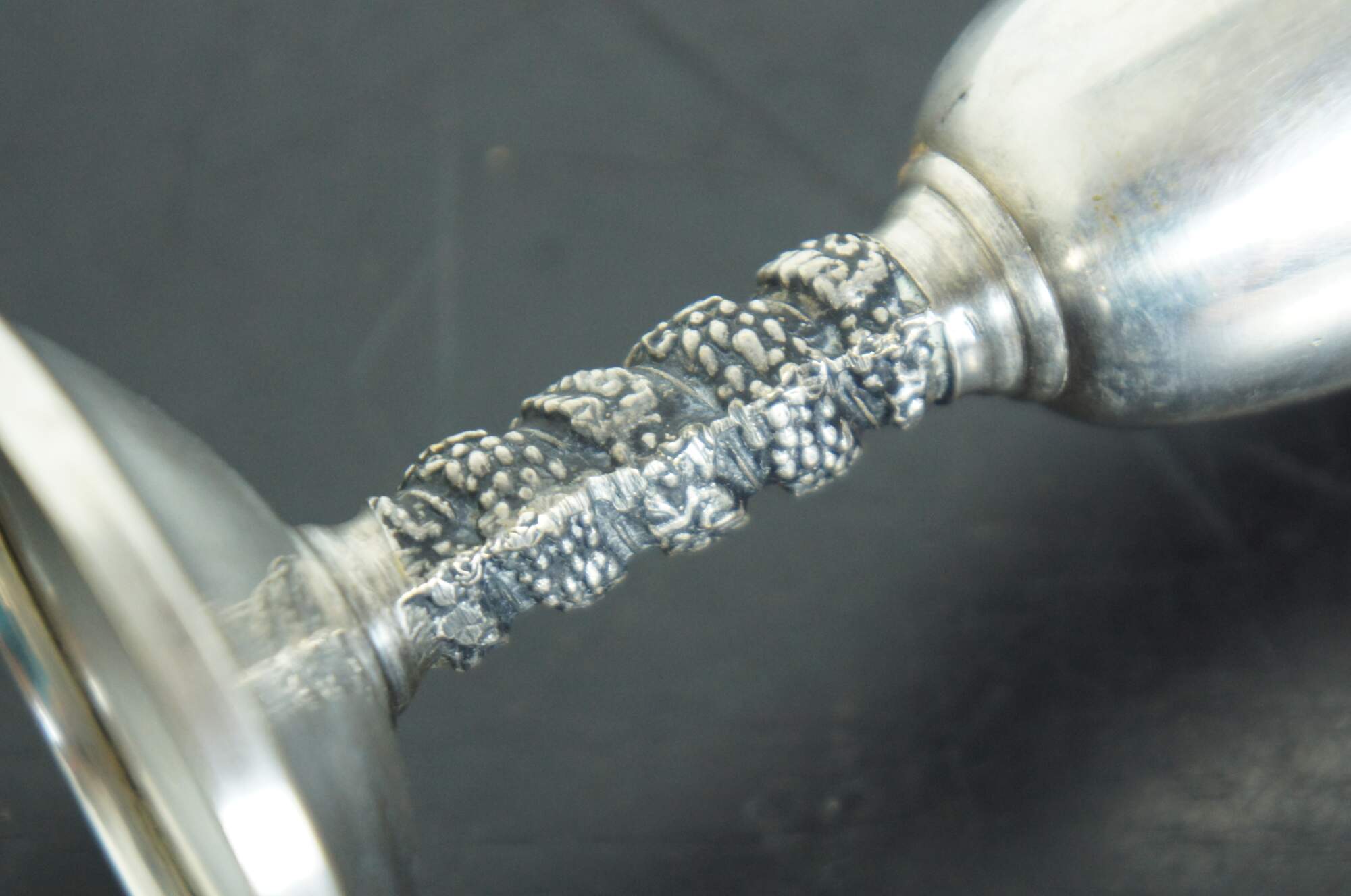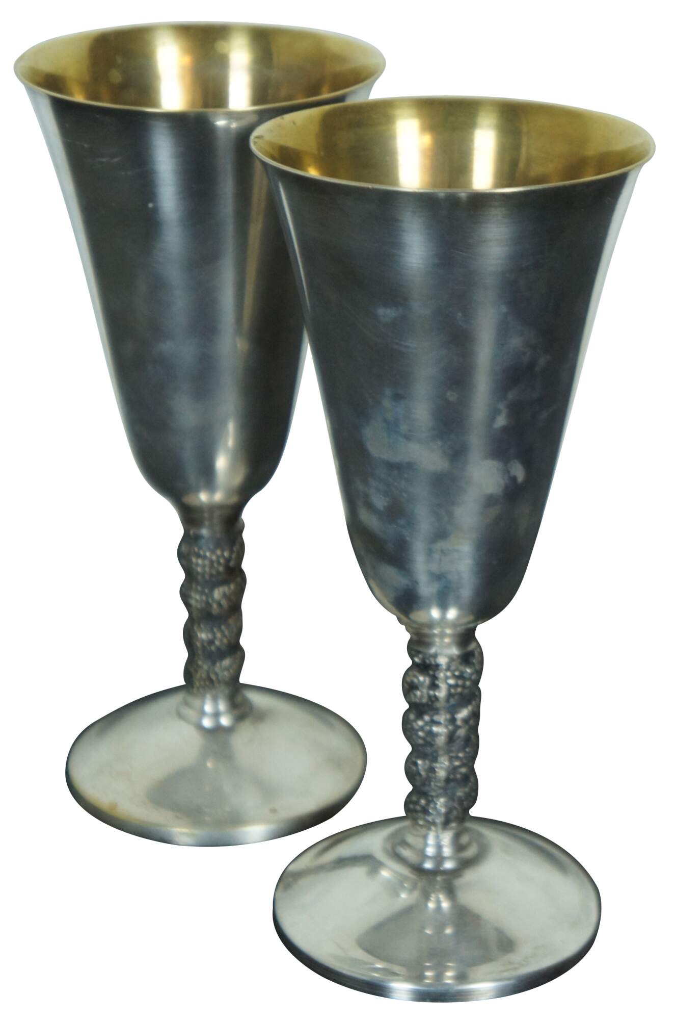 Pair of vintage silver plate goblets with twisted grape and leaf design around the stem, made in Spain by Roma S.L.