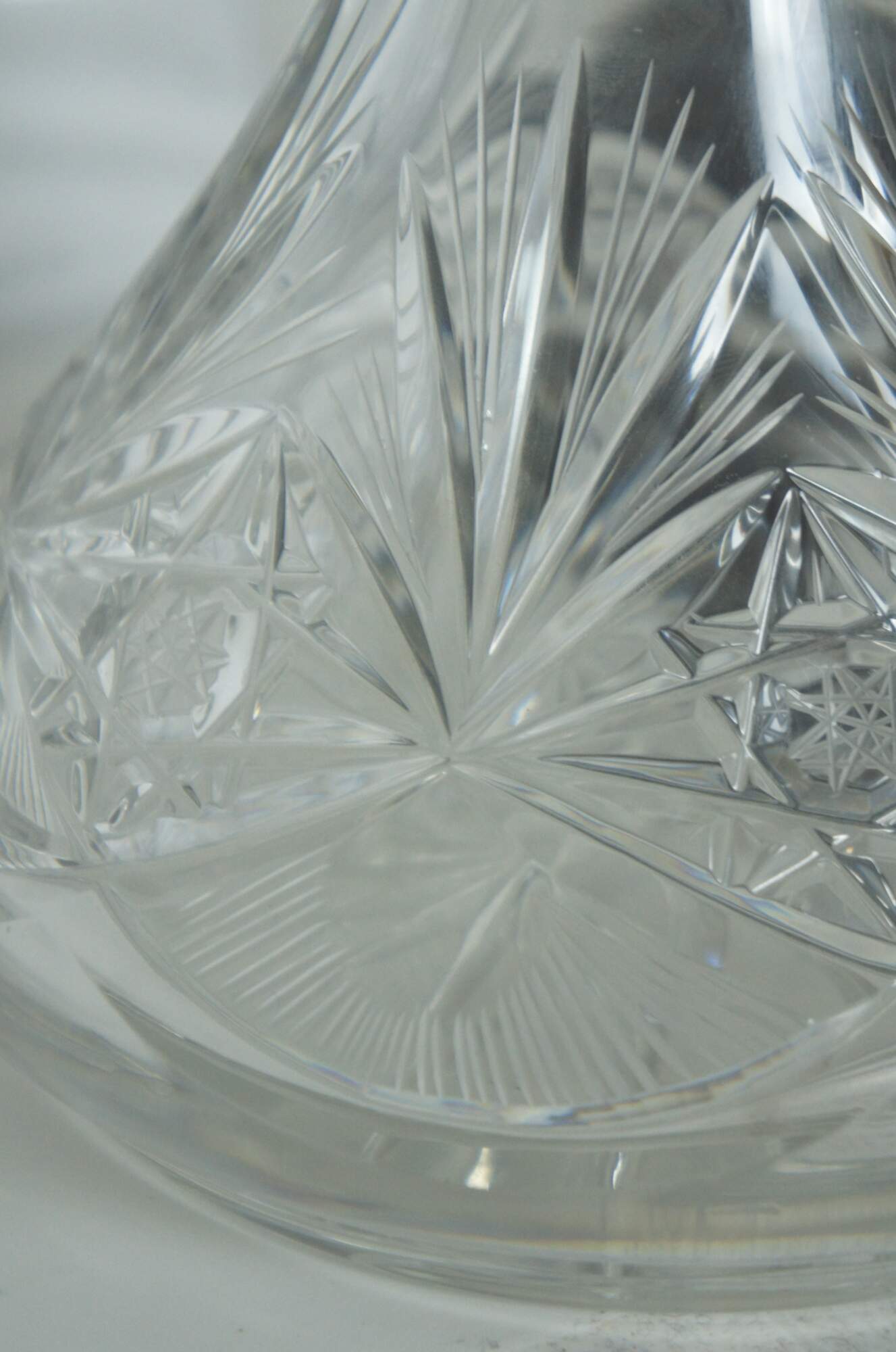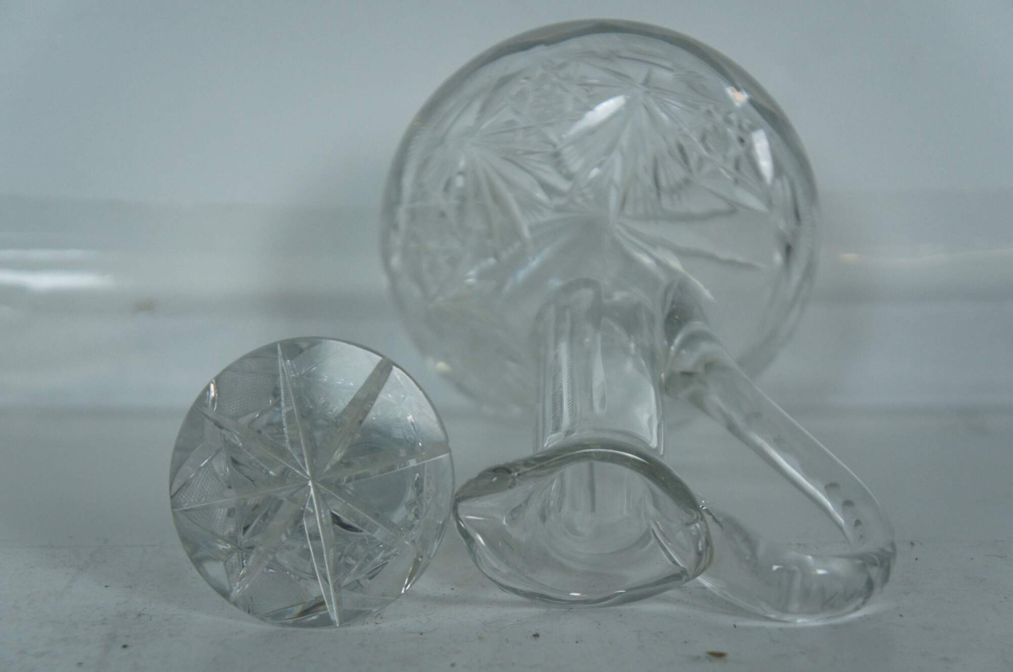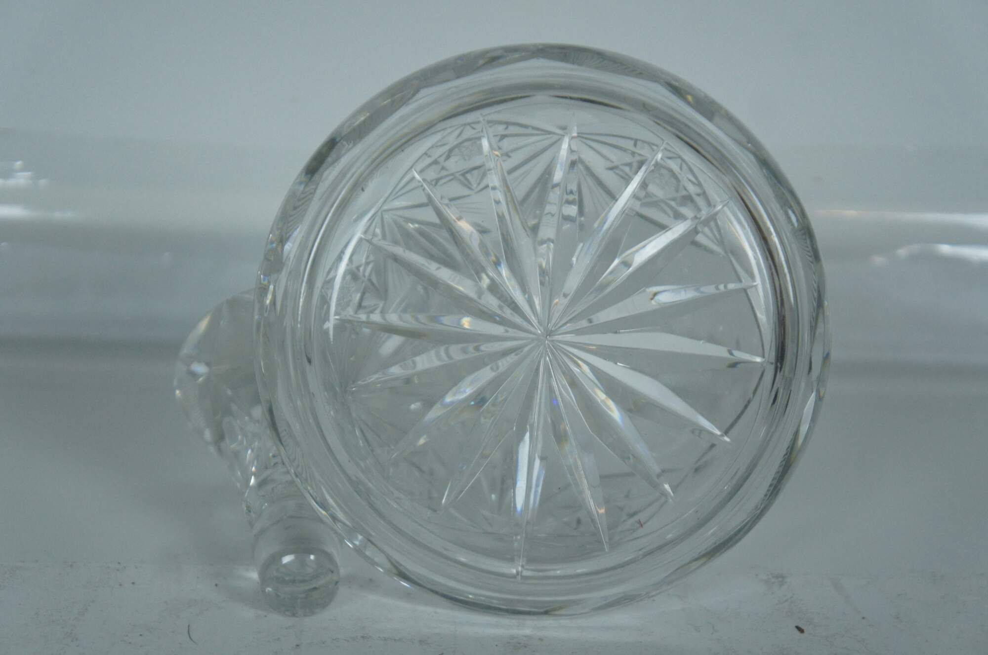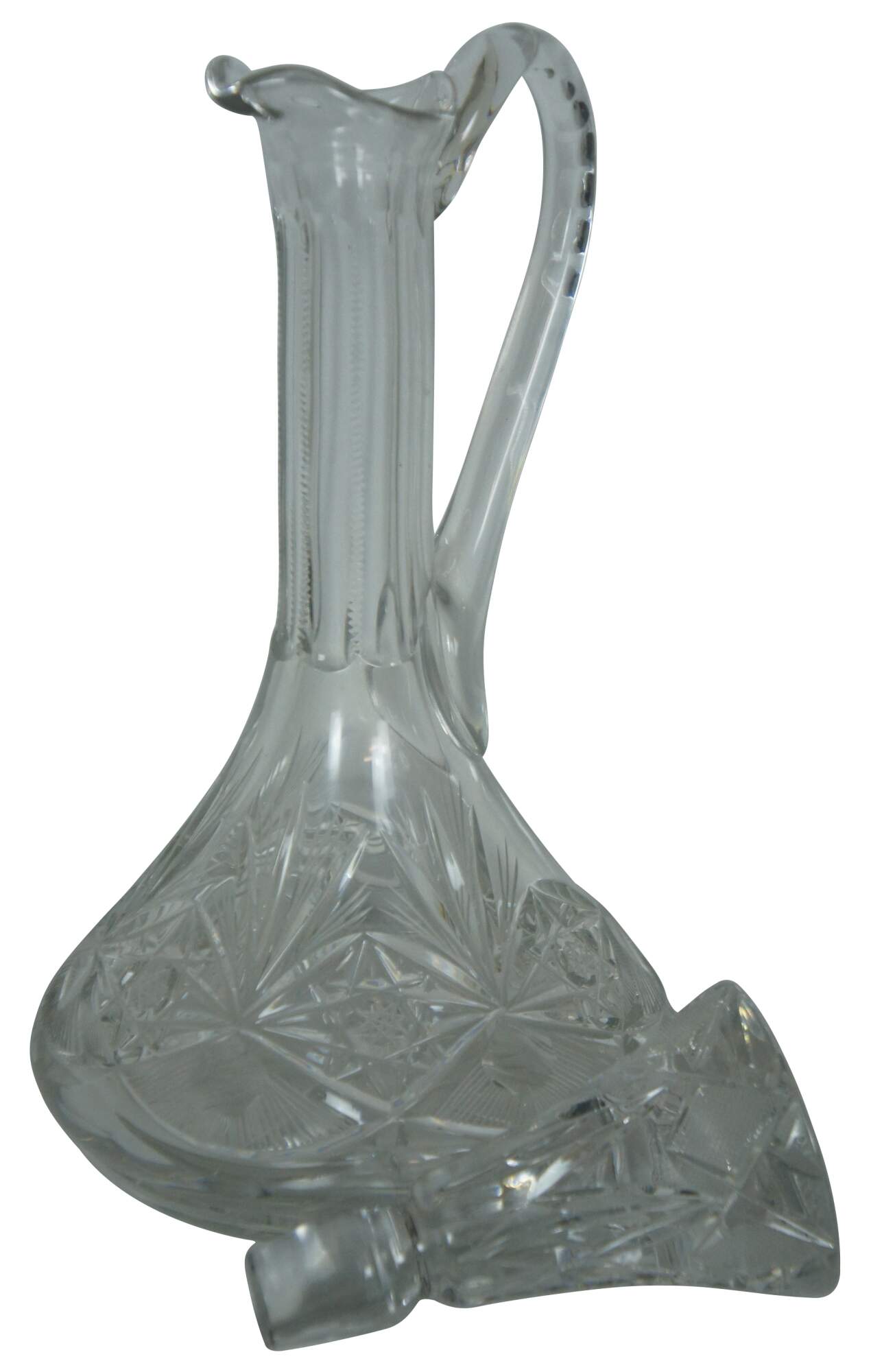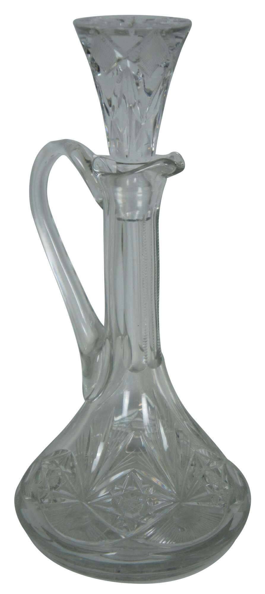 Vintage unmarked cut crystal wine or liquor decanter with pitcher handle and large stopper.
