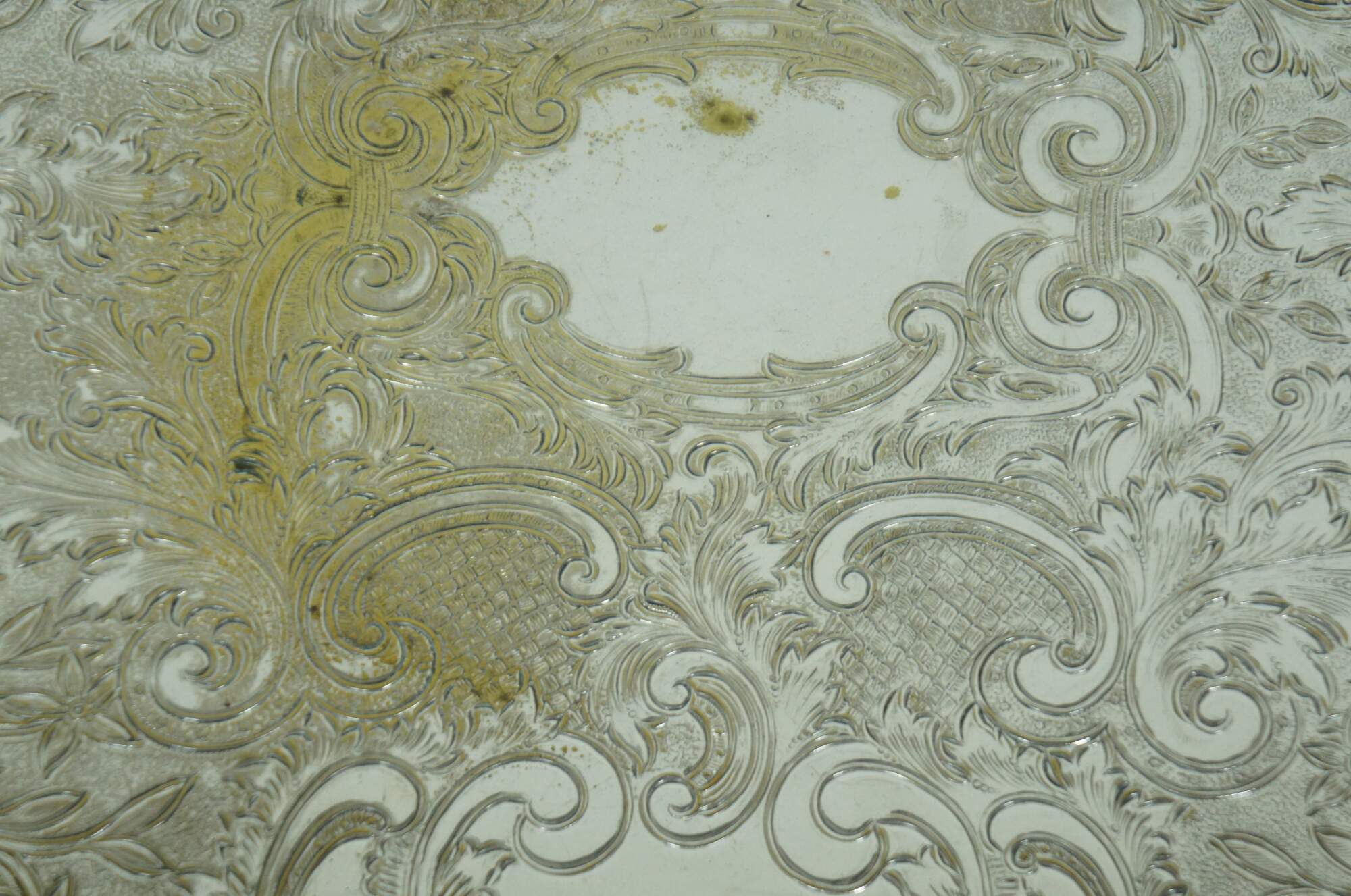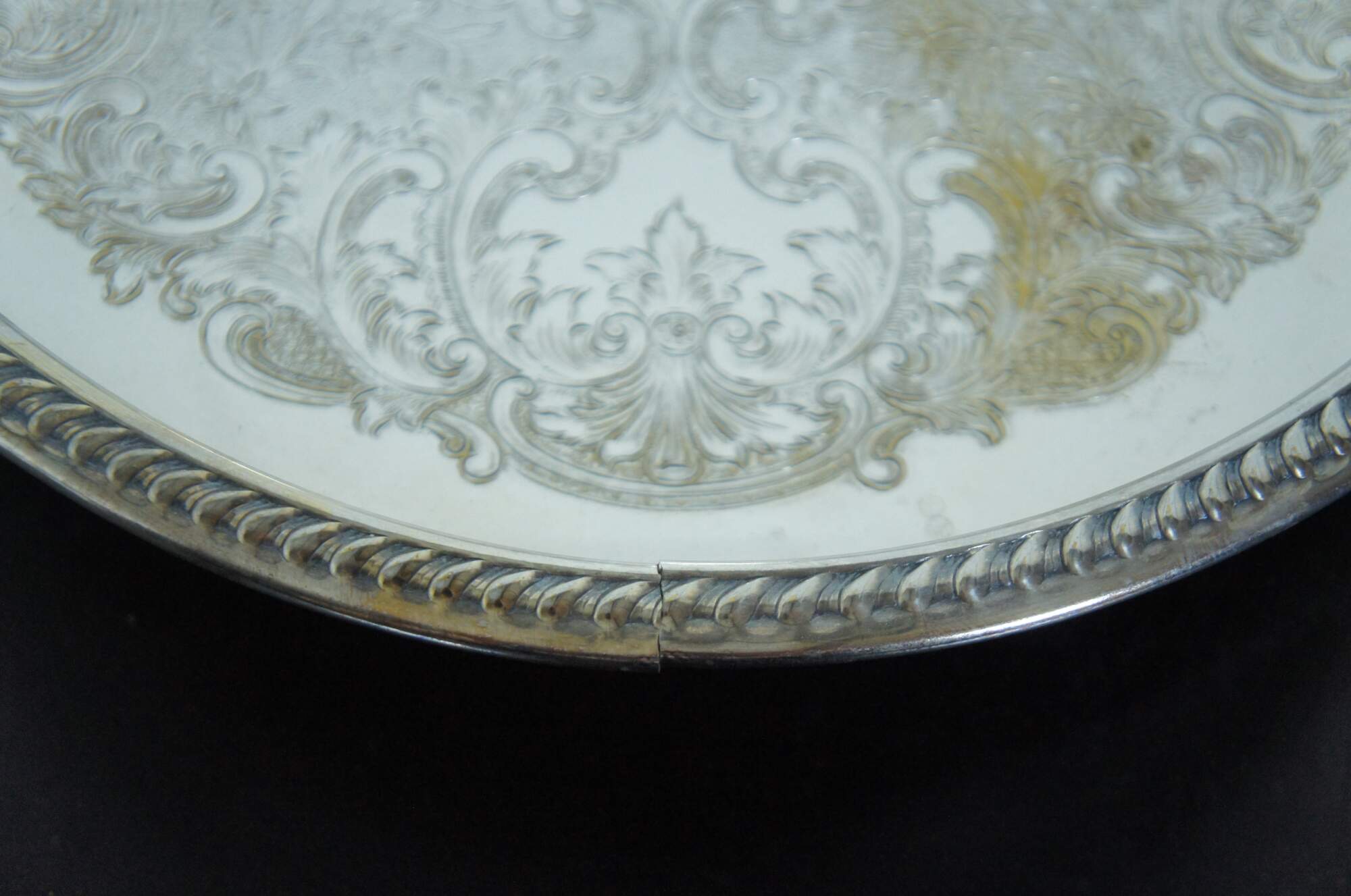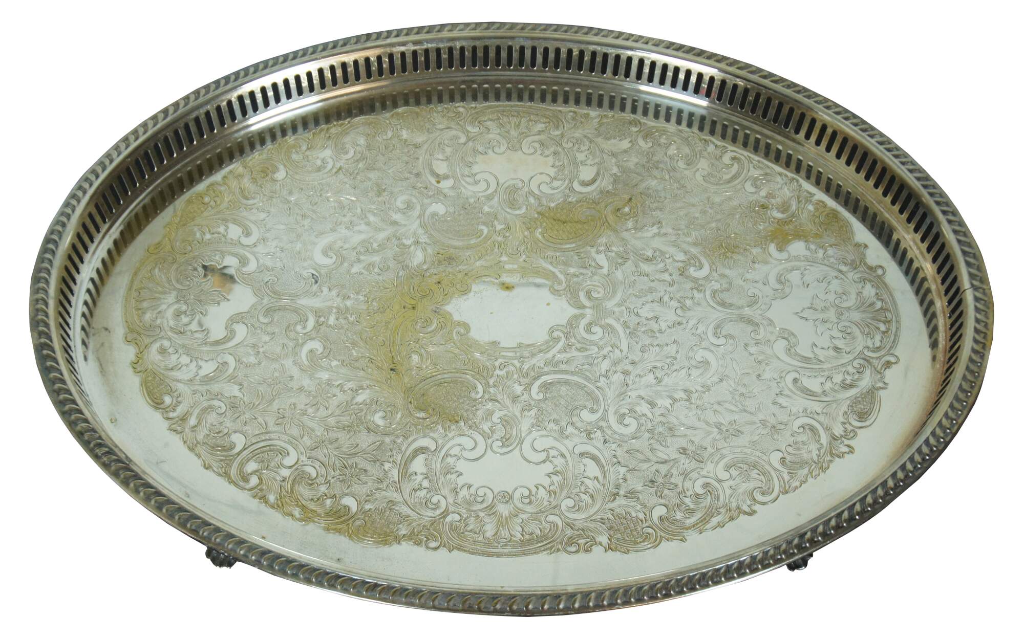 Large vintage Lehman Brothers silver plate serving tray with scalloped feet, pierced gallery, and etched floral and scallop design on the surface.