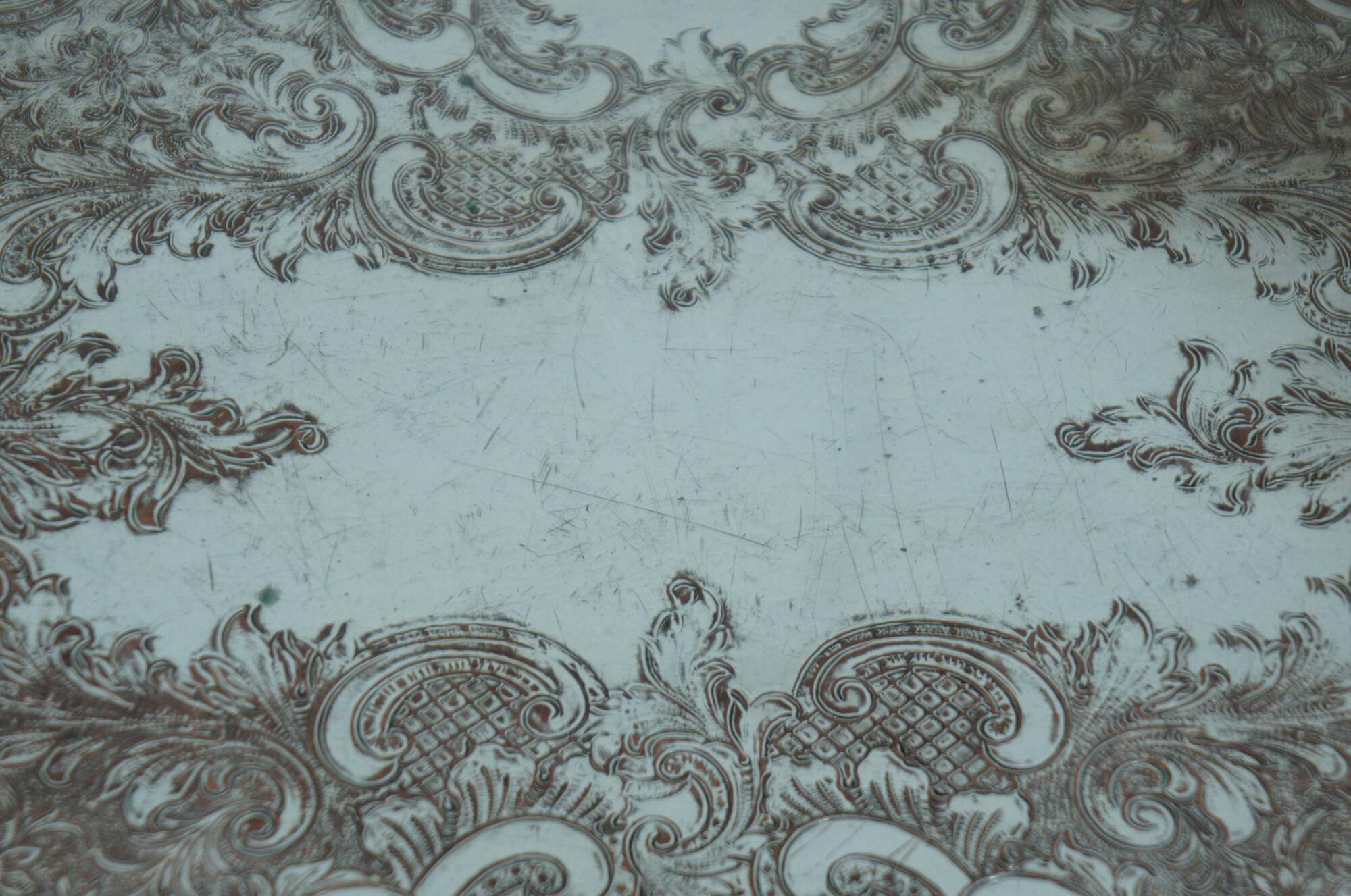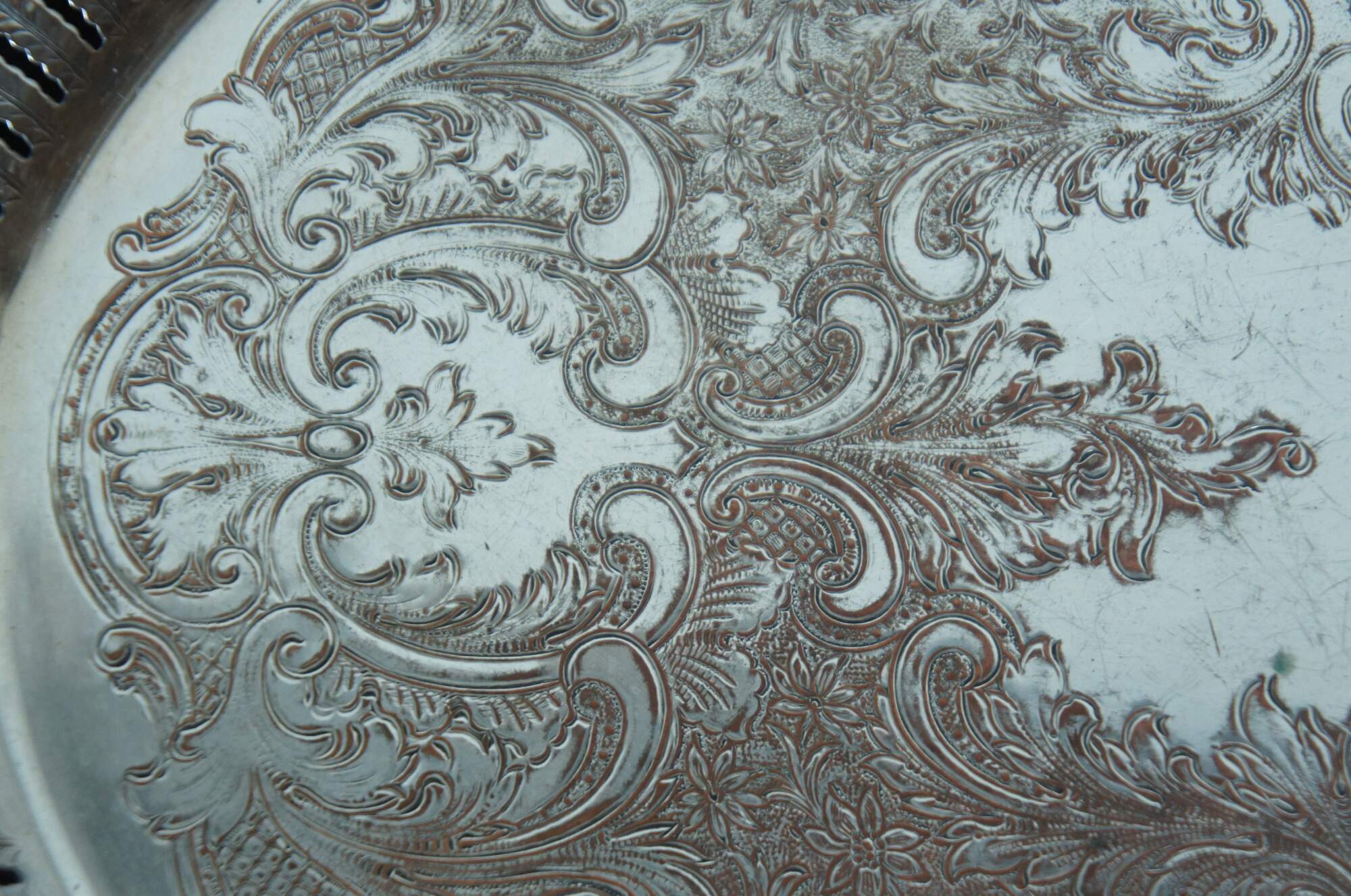 Vintage Gotham silver on copper plated oval serving tray number 742P, with a rope twist edge and handles, pierced border, and etched floral and scallop design on the surface.
