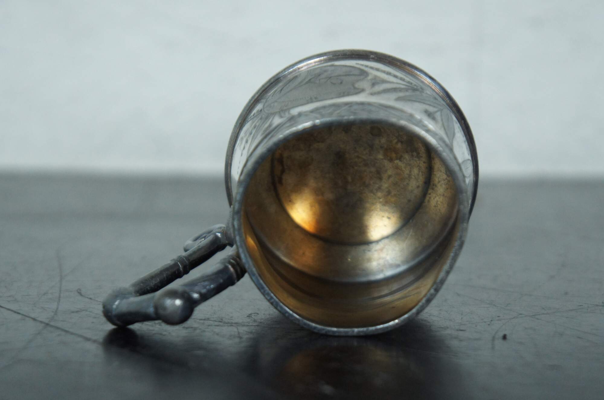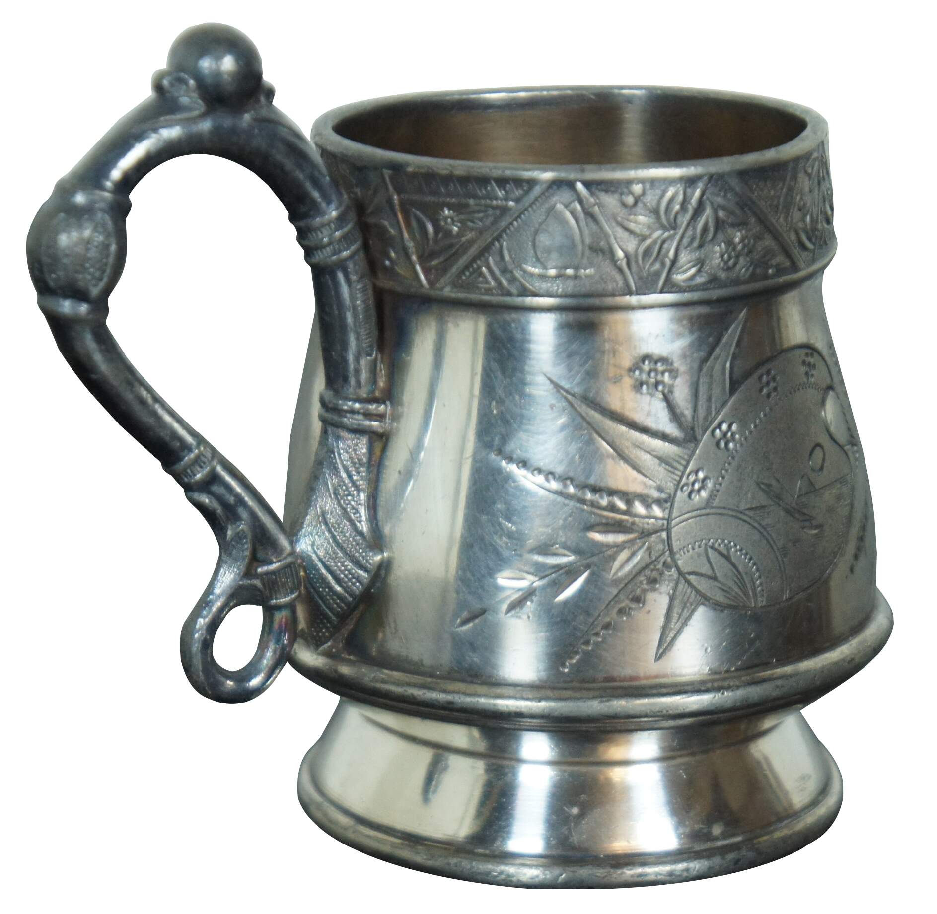 Antique Victorian Hartford Quadruple Silver Plate number 2 mug or cup, eithed with a eastlake design of flowers and an artist’s palette, and engraved with the name Steve.