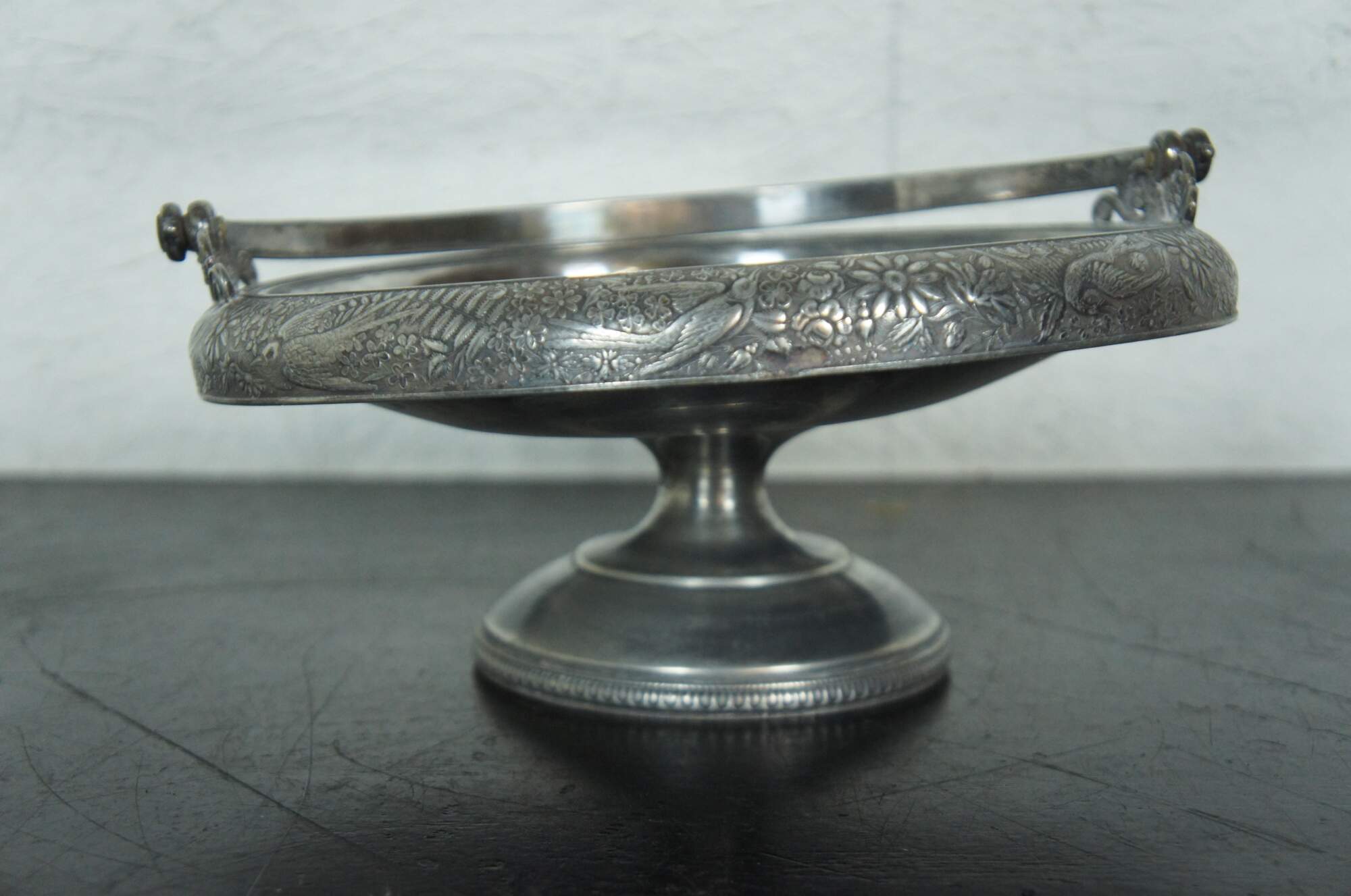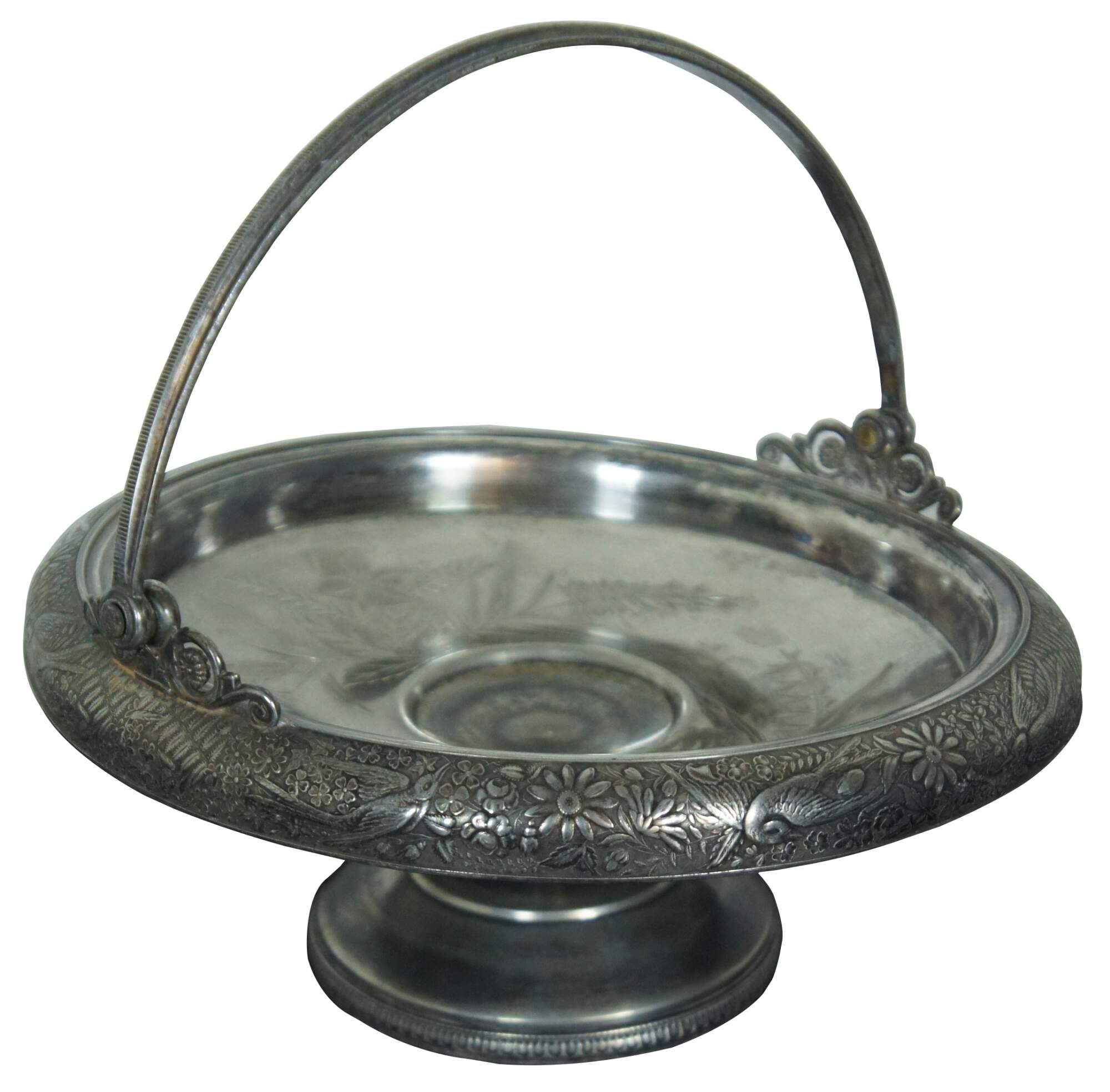 Antique Victoiran Hartford Quadruple Silver Plate number 1007 brides basket or centerpiece, featuring a rotating handle and a border of flowers and birds.