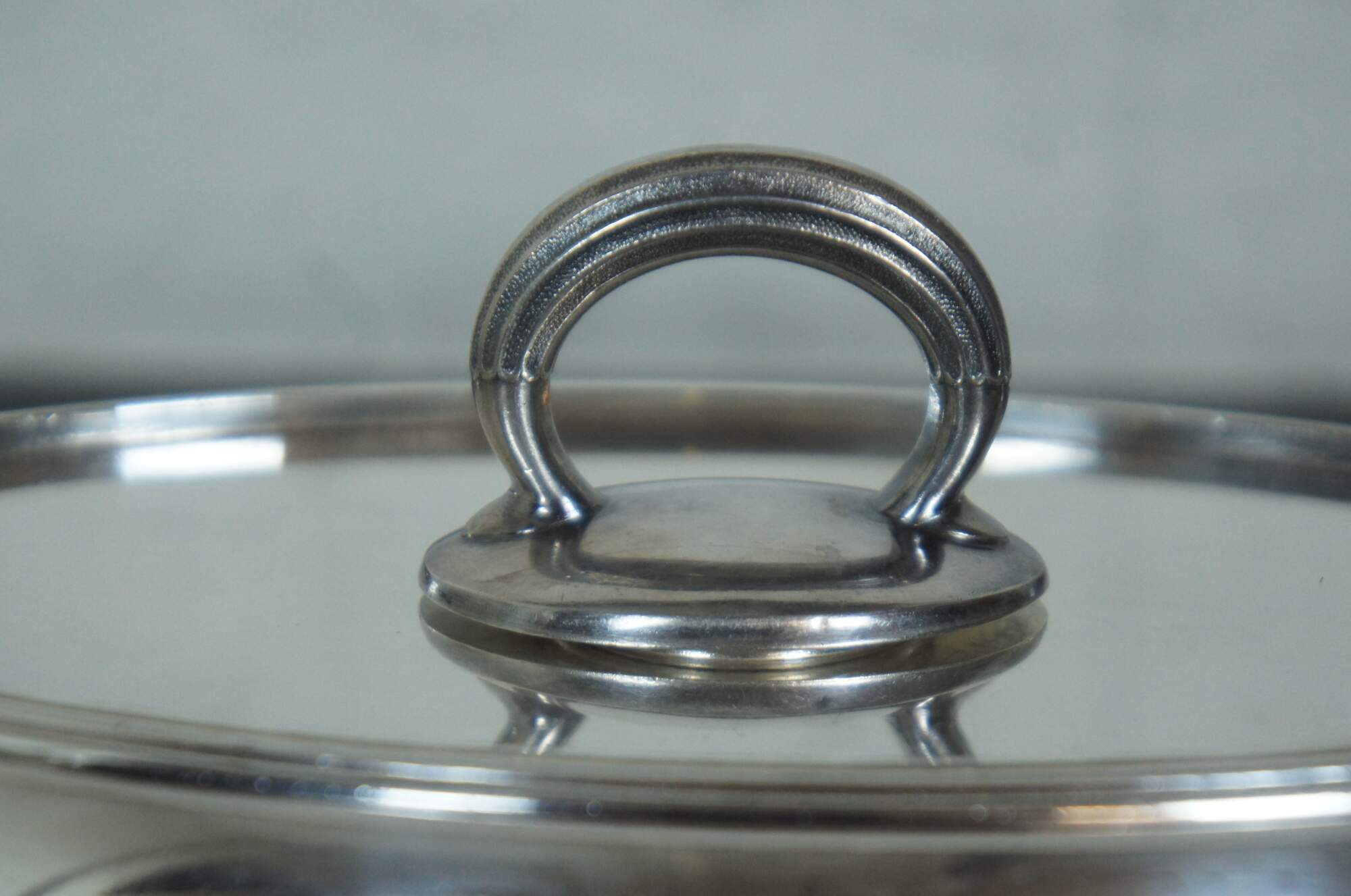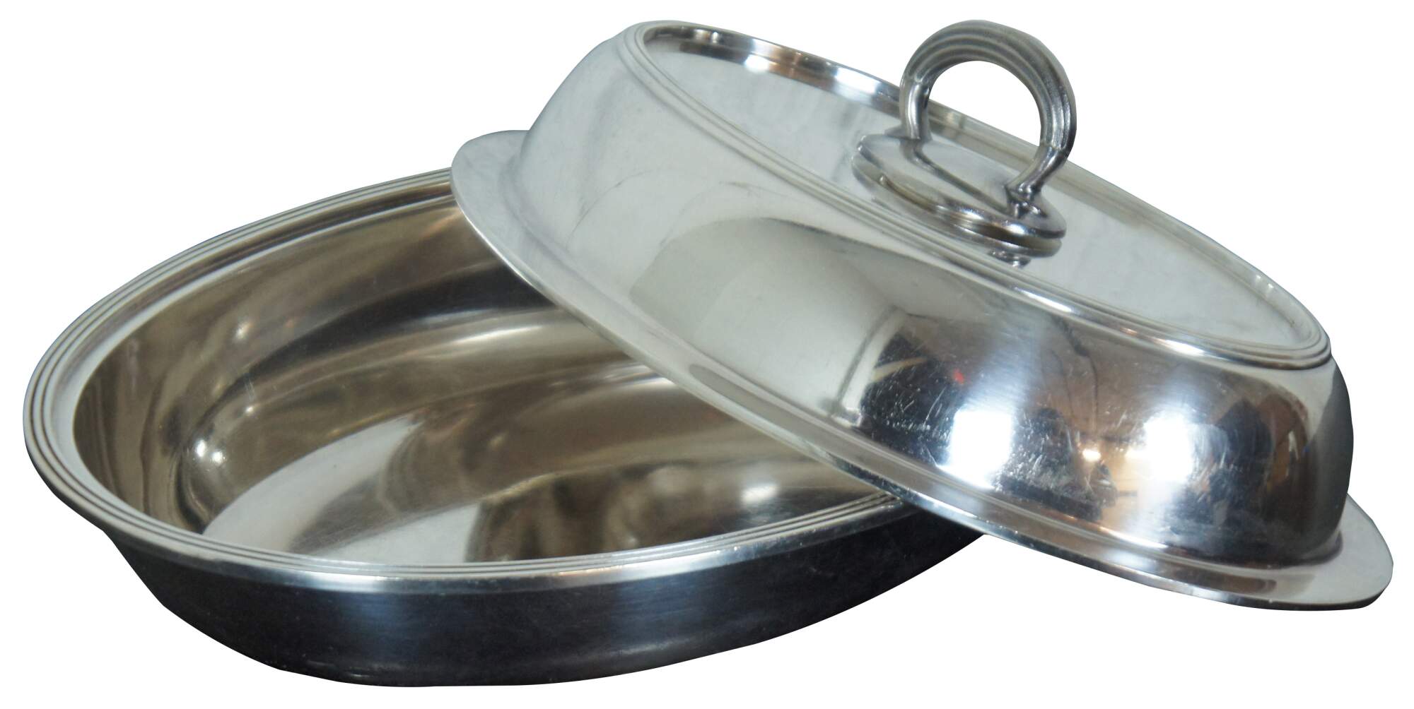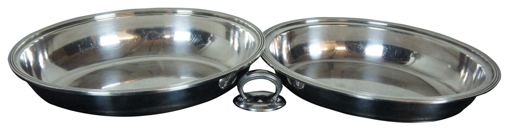 Vintage Gorham silver plate number 01140 oval double vegetable or entree serving dish with a removable handle on the lid to convert the lid into a second dish.“The Gorham Manufacturing Company is one of America’s largest manufacturers of silver-plate and sterling pieces, along with a foundry for bronze sculpture. Gorham got it’s start in 1831 with Jabez Gorham in partnership with Henry Webster. The two founded the silver company in Gorham’s hometown of Providence, Rhode Island. Their beginning was as a manufacturer of coin-silver flatware in which Gorham started to gain acclaim, especially in 1859 once the flatware was selected by Mary Todd Lincoln for the White House. In 1863, Gorham was a major player in plated silver. In 1868, they had made the switch from coin silver for sterling silver and produced everything from knives, forks and spoons, to other desired pieces such as coffee pots and serving bowls. Again, highly desired by several White House administrations, Mrs. Ulysses S. Grant asked Gorham to commemorate the country’s one-hundredth anniversary with a spectacular century vase.”