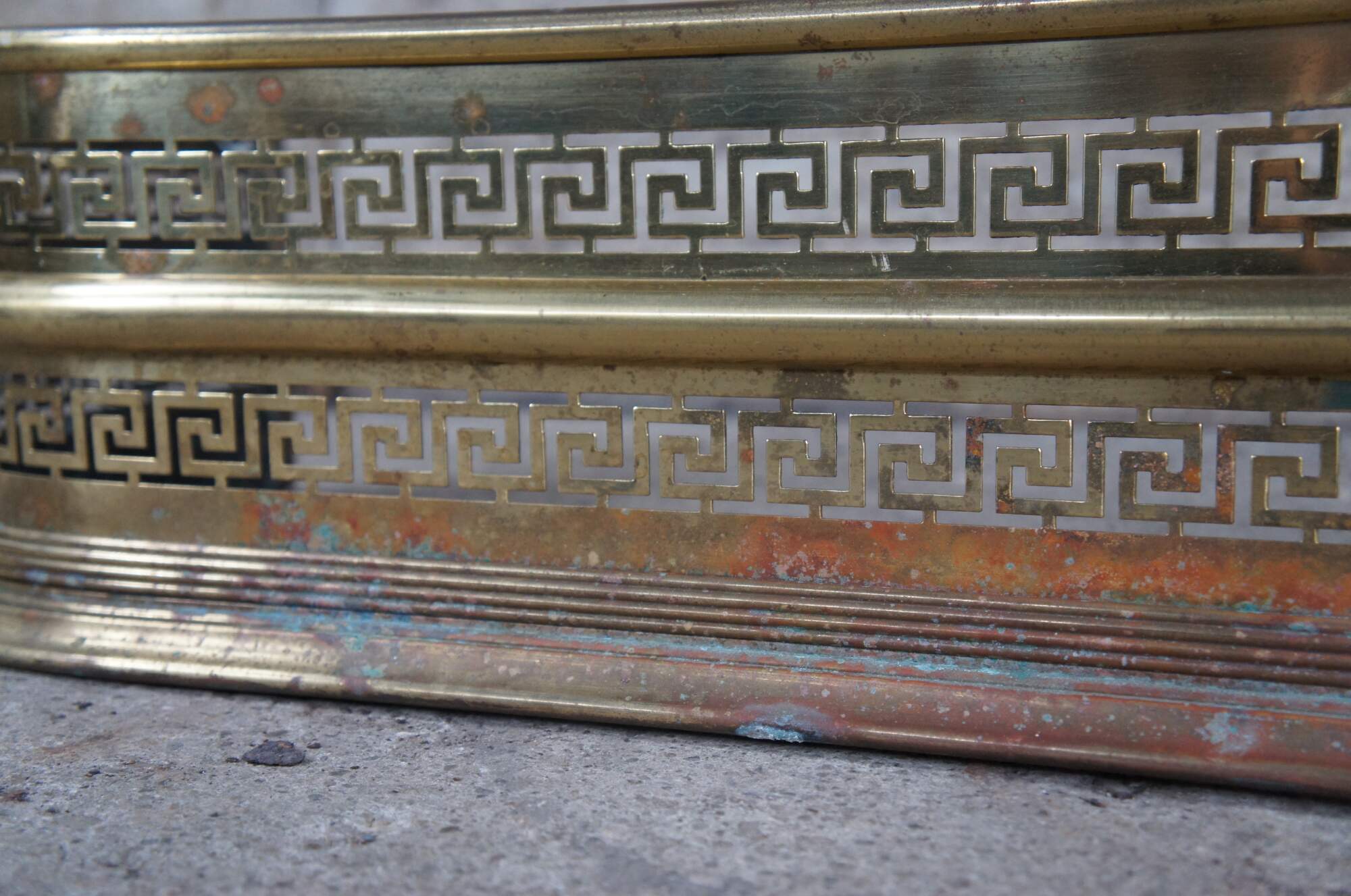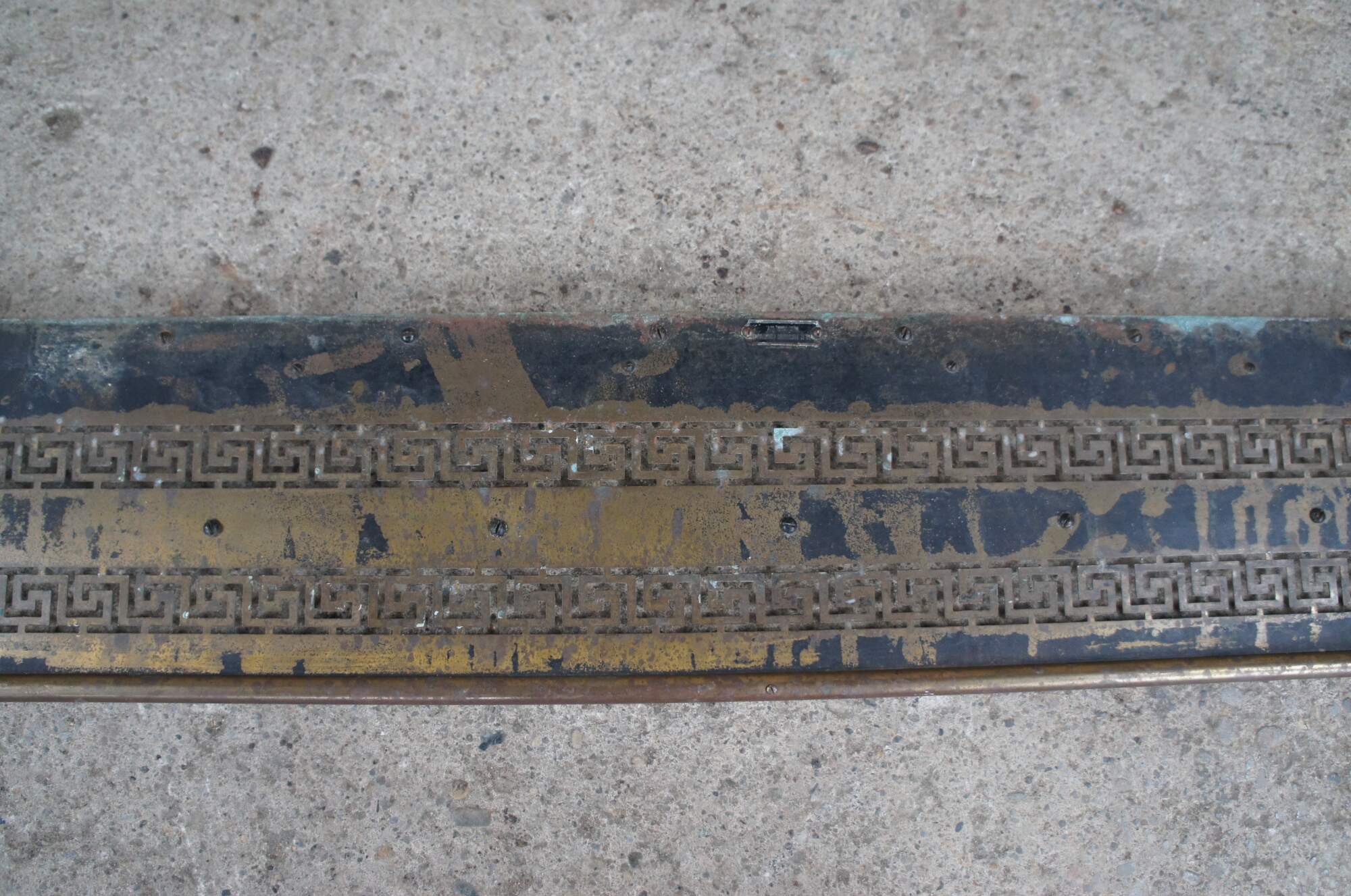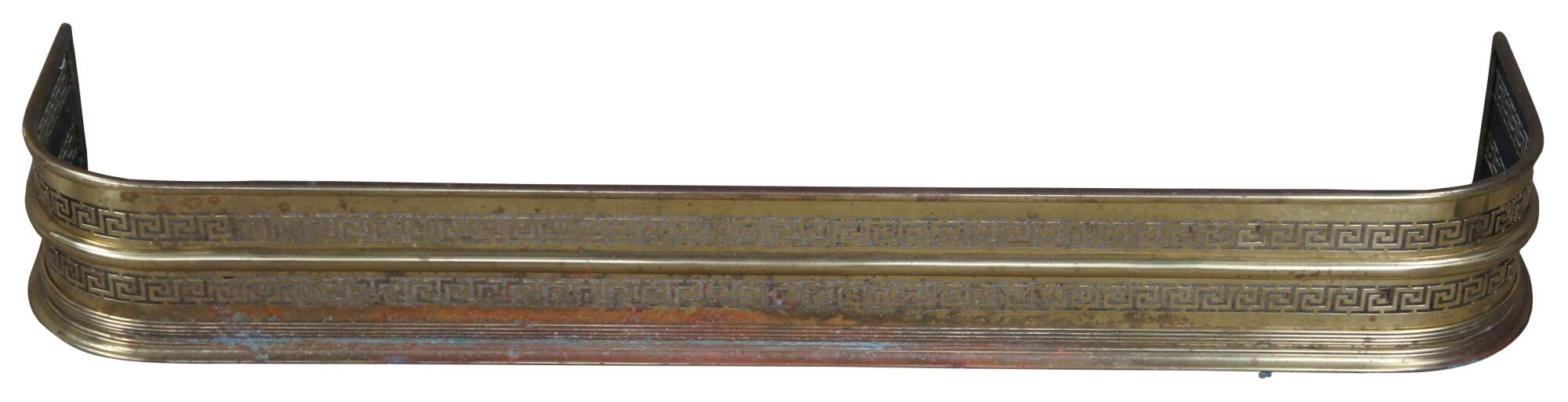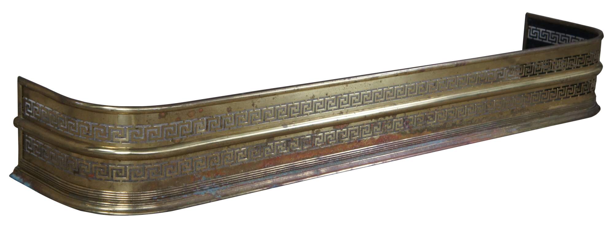 Antique Brass Fireplace Fender, Victorian era. Features a D form with pierced Greek key design and streamlined shape.