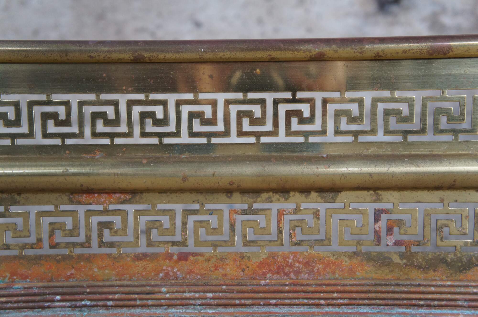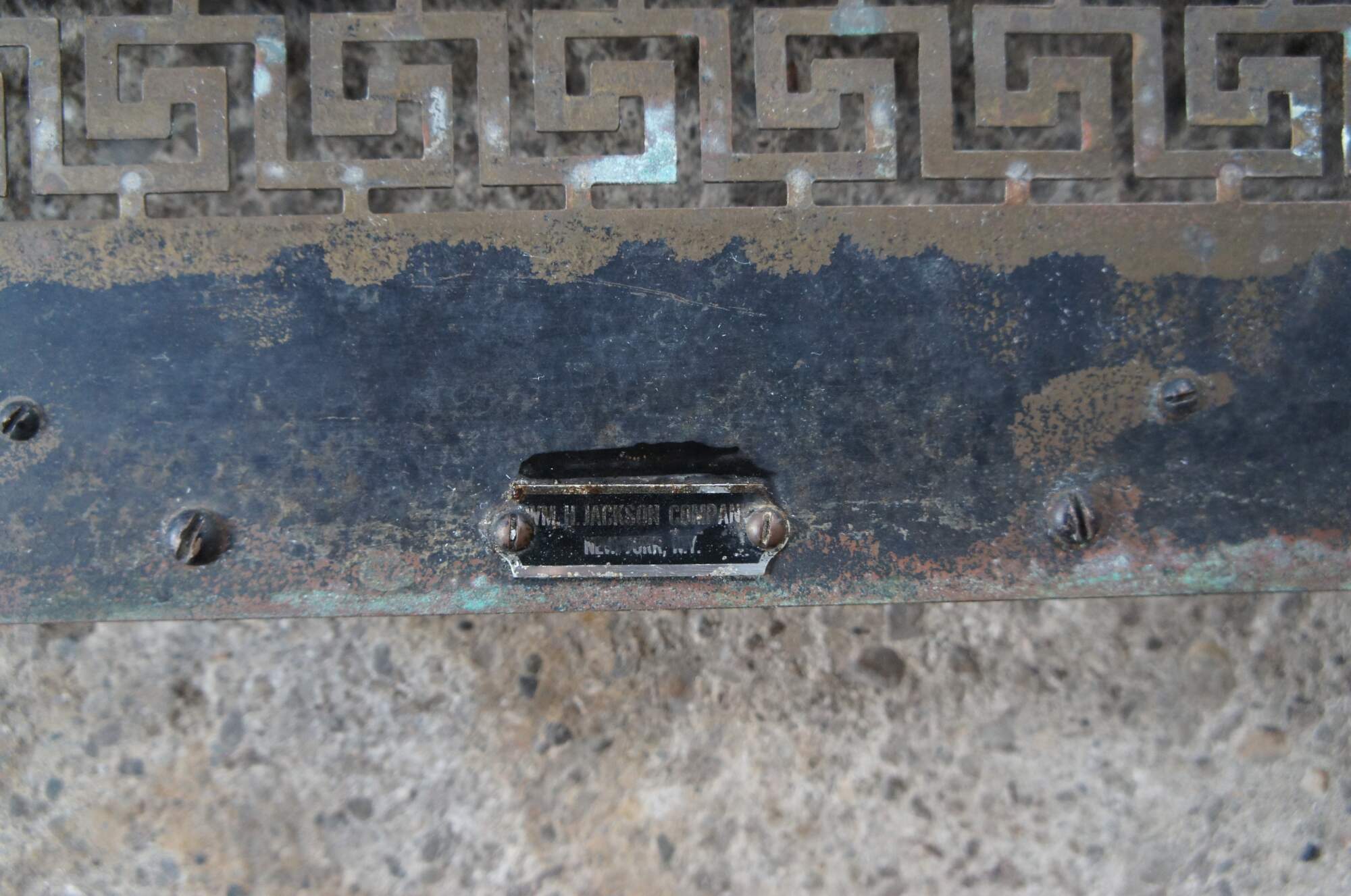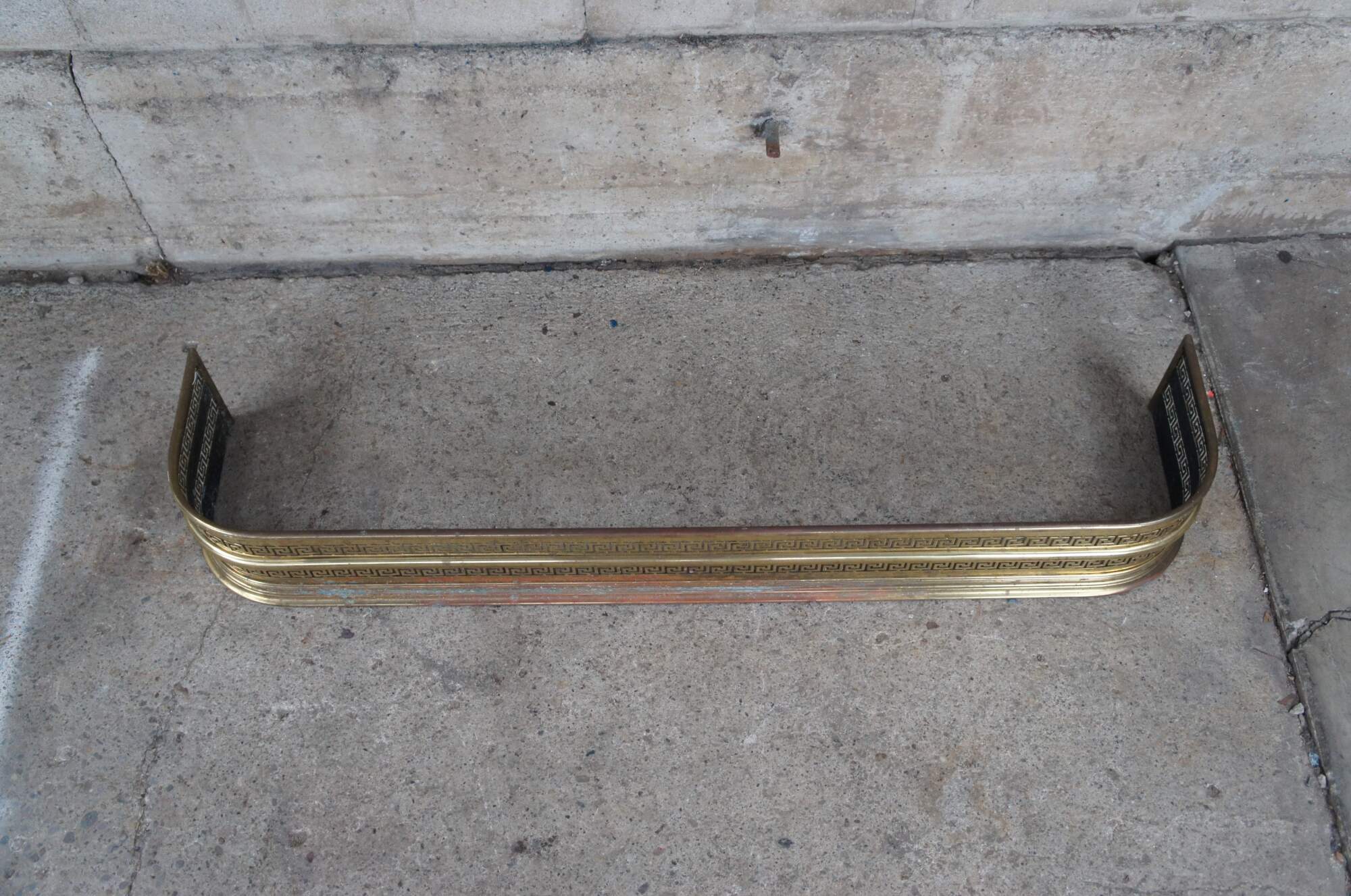 Antique Brass Fireplace Fender, Victorian era. Features a D form with pierced Greek key design and streamlined shape.
