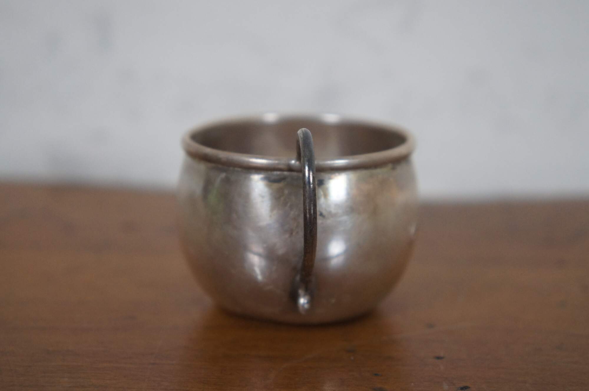 Antique sterling silver baby’s christening cup or mug with a round body, engraved with the name Carol.