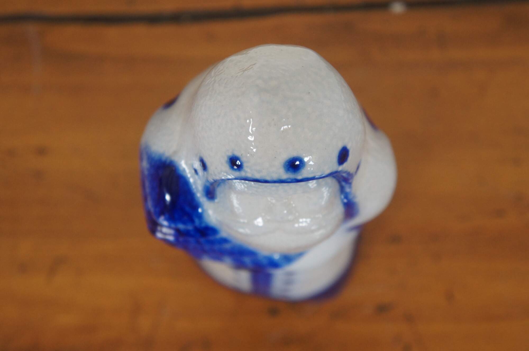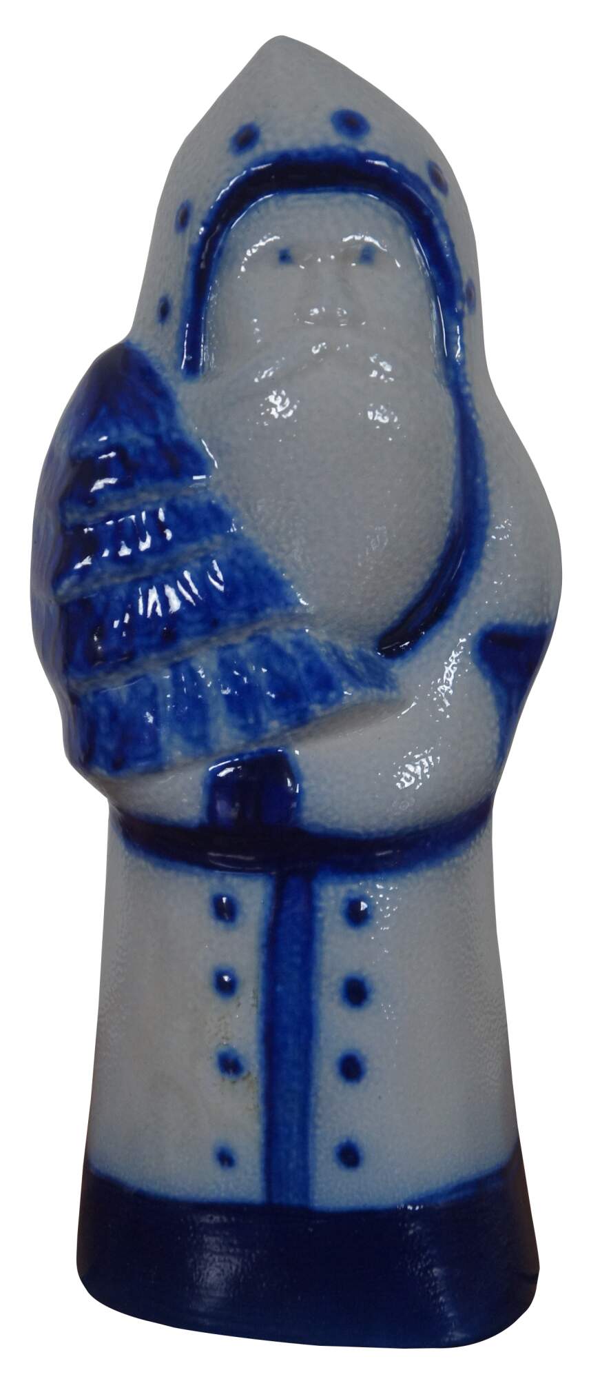 Vintage blue and white stoneware salt glazed sculpture by Dave Eldreth Pottery shaped like an antique style Santa Claus holding a pine tree. Includes original box.