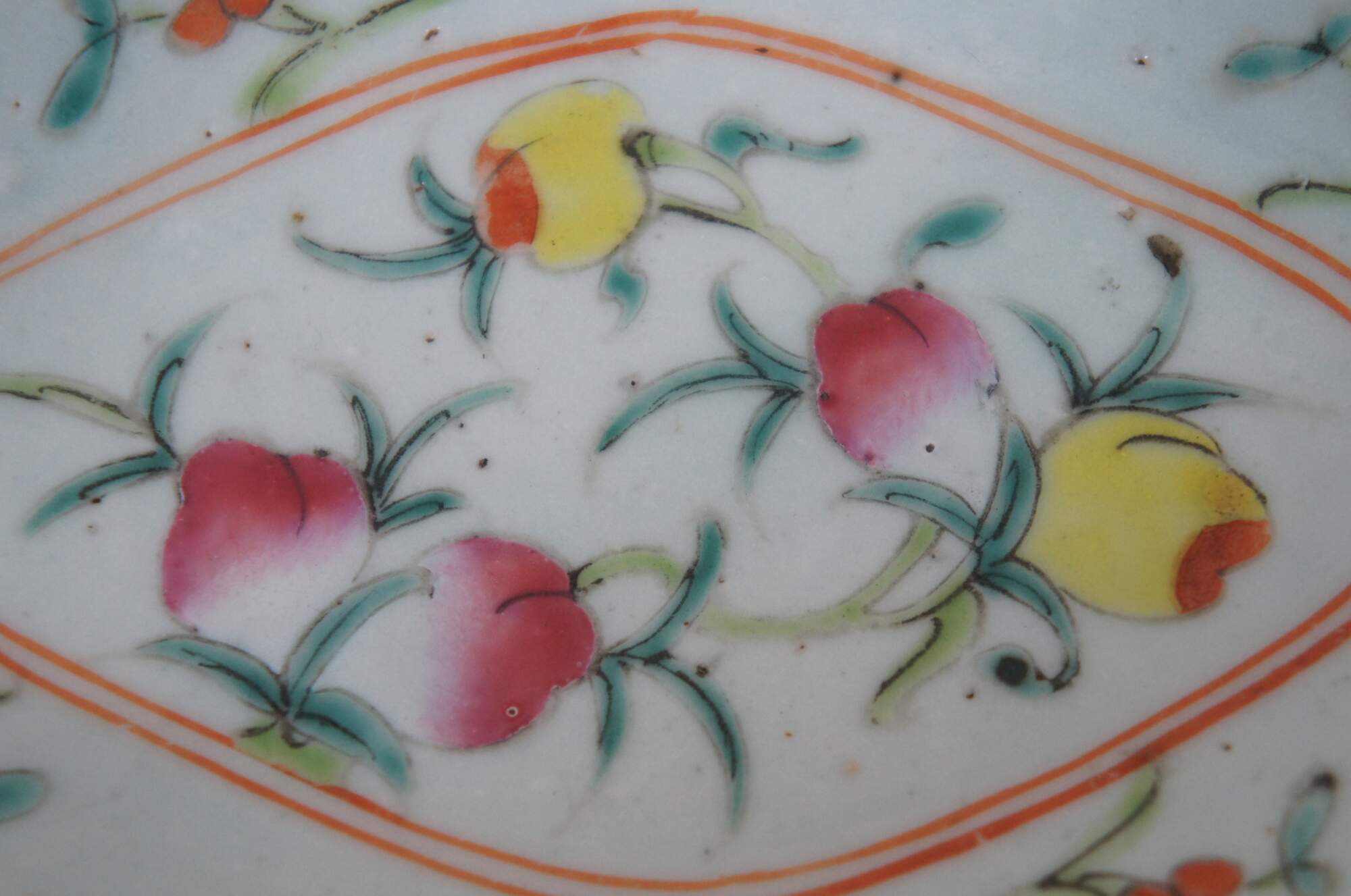 Antique early 20th century Chinese famille rose porcelain tazza / chop suey / footed altar dish with a scalloped oval edge, decorated with pink, orange and yellow flowers.