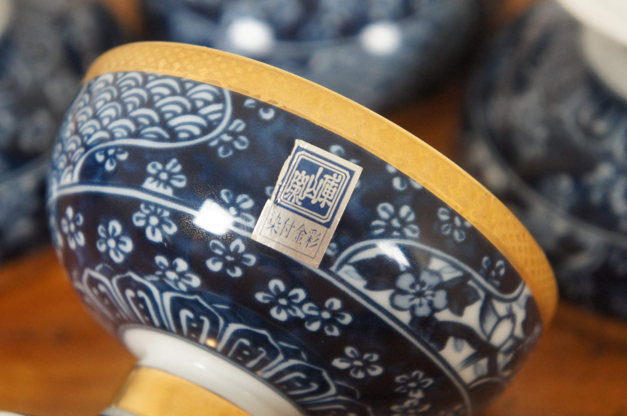 Set of four Japanese floral blue and white porcelain rice bowls with bright gold trim.